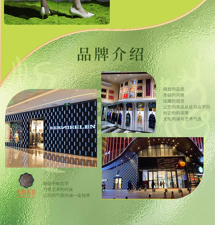 行业首家从事文创研发的女装品牌-伯妮斯茵 品牌风格:源自千年文学和万年艺术的时装,让你的气质内涵一枝独秀,精彩的品质,华丽的风格,炫耀的视觉,让你的衣品从此与众不同,标记你深厚的文化内涵与艺术气息。