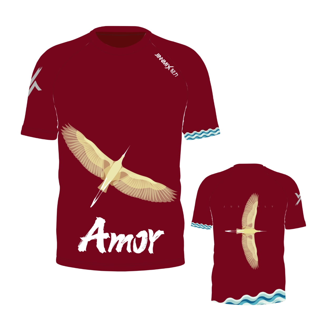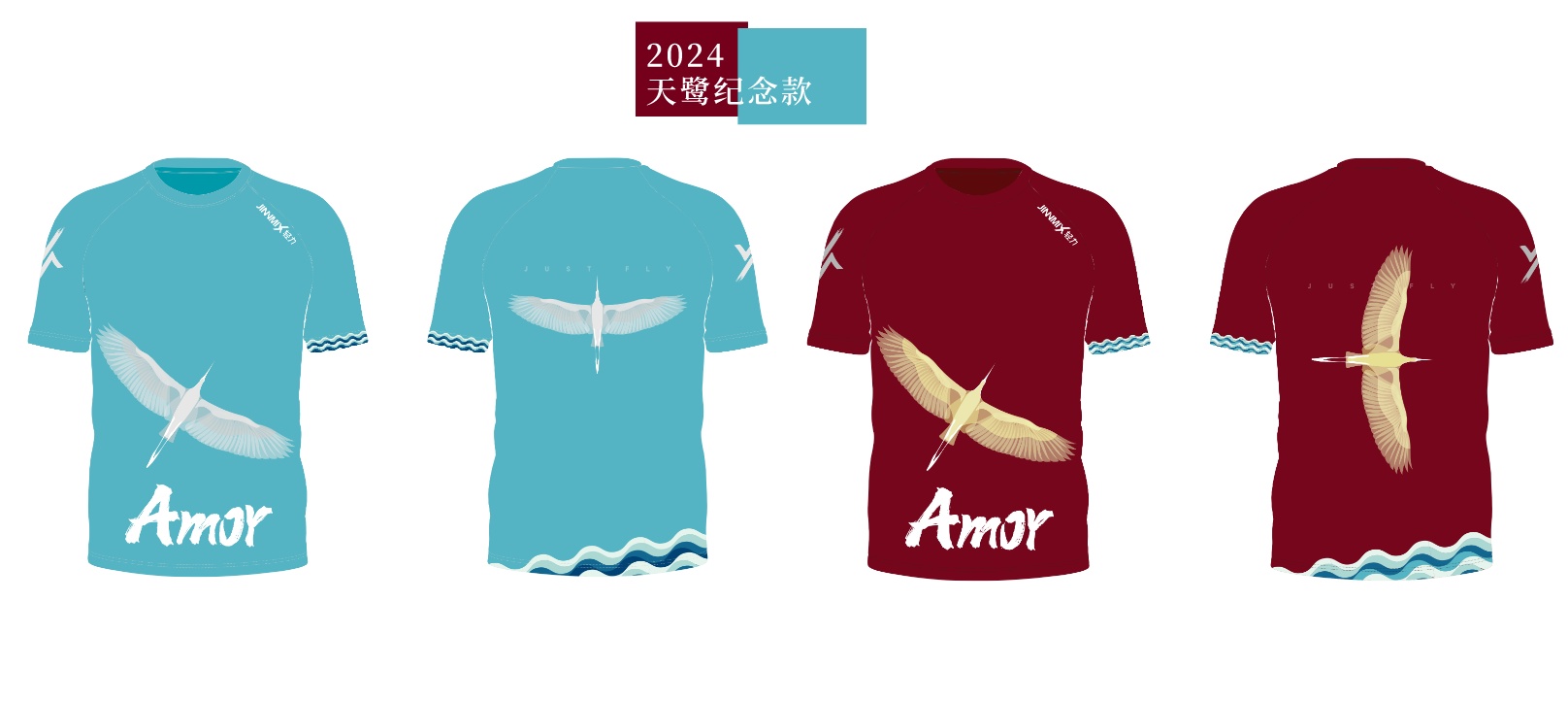 以白鹭翱翔为表现方式,精细彩色线描;手写体英文AMOY;结合下摆、袖口波普艺术元素原创设计,动感潮俏,灵动飘逸。