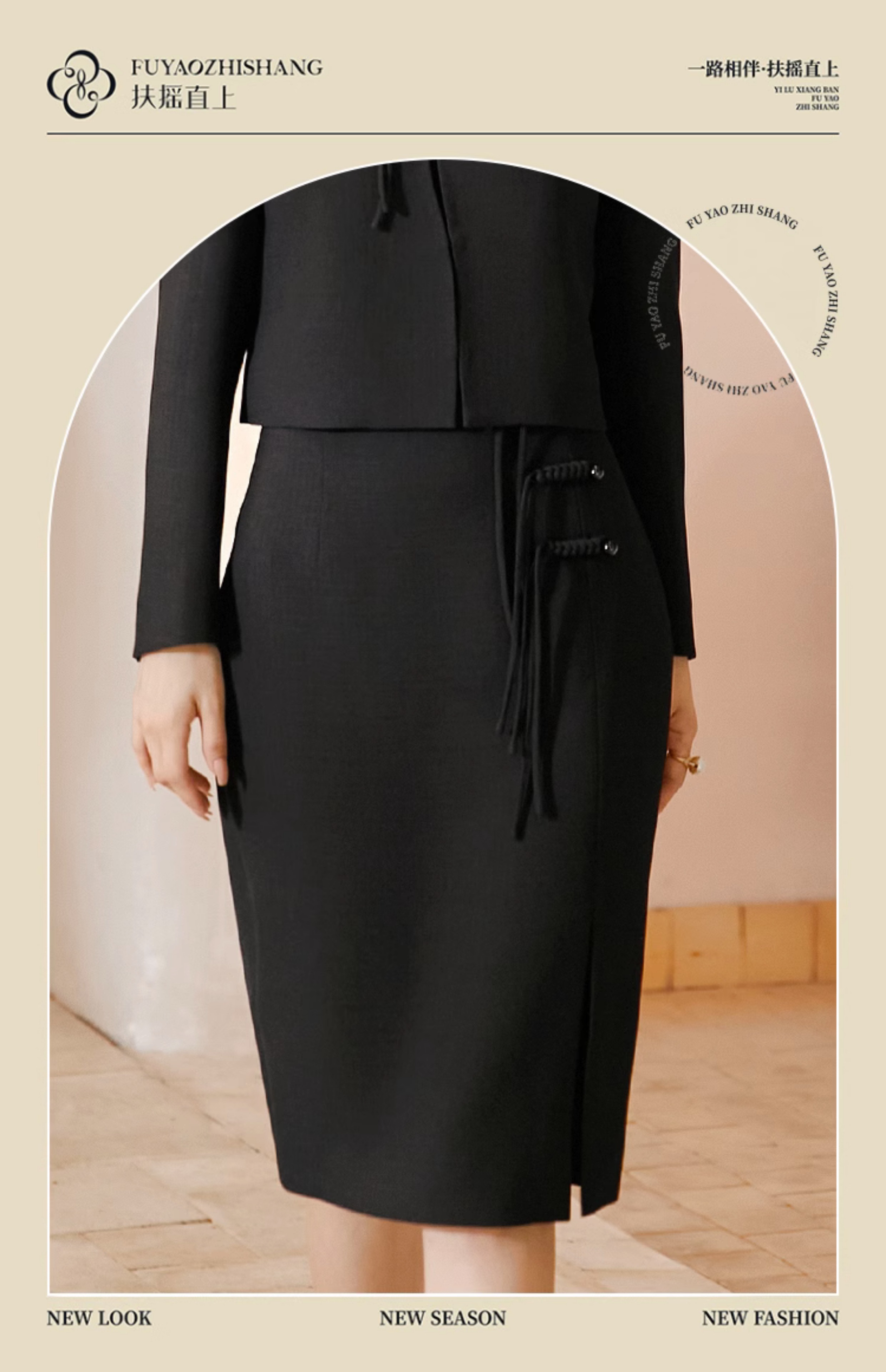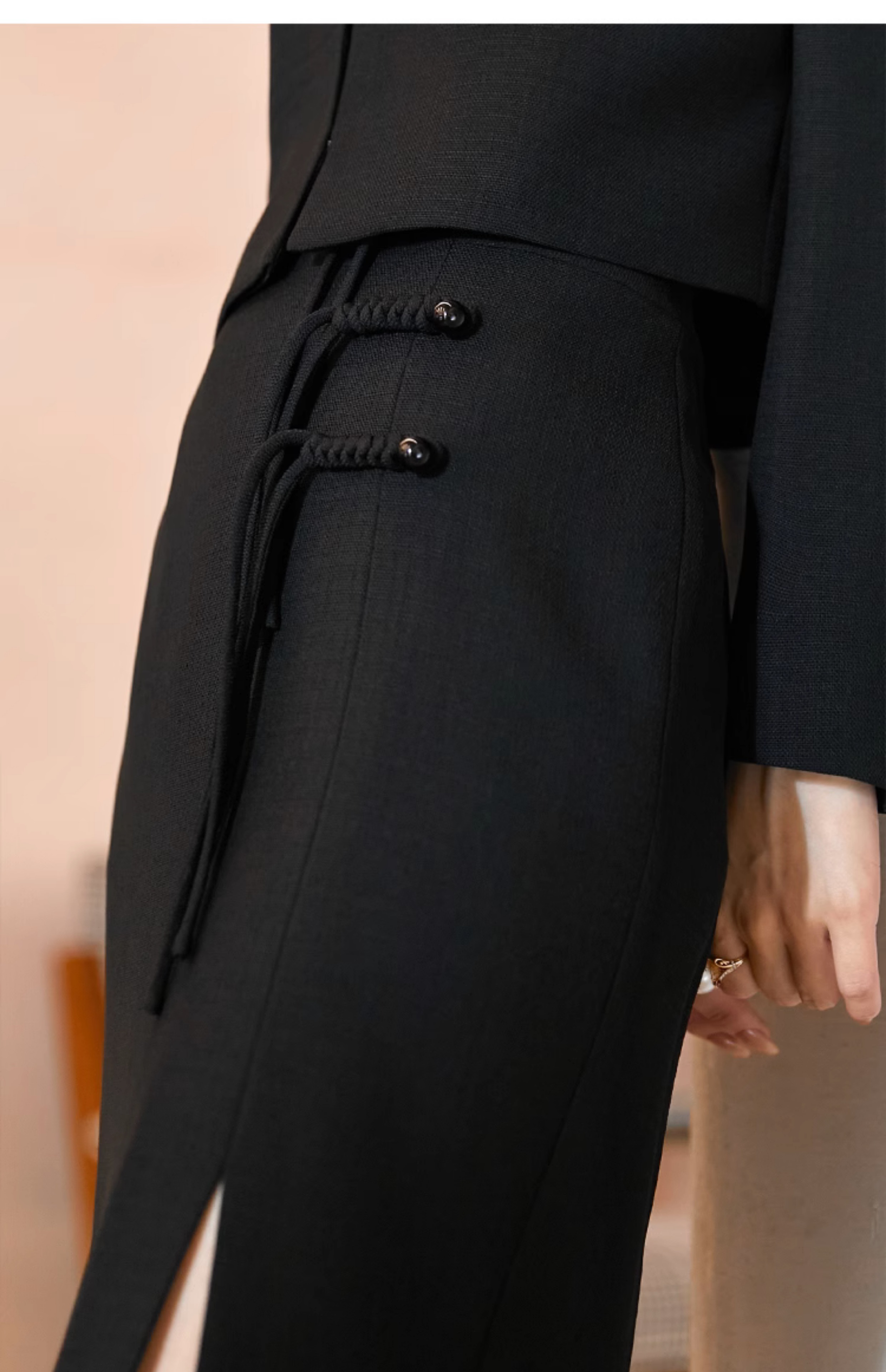 扶摇 秋季新款黑色半身裙女新中式国风开叉中长裙绑带包臀裙