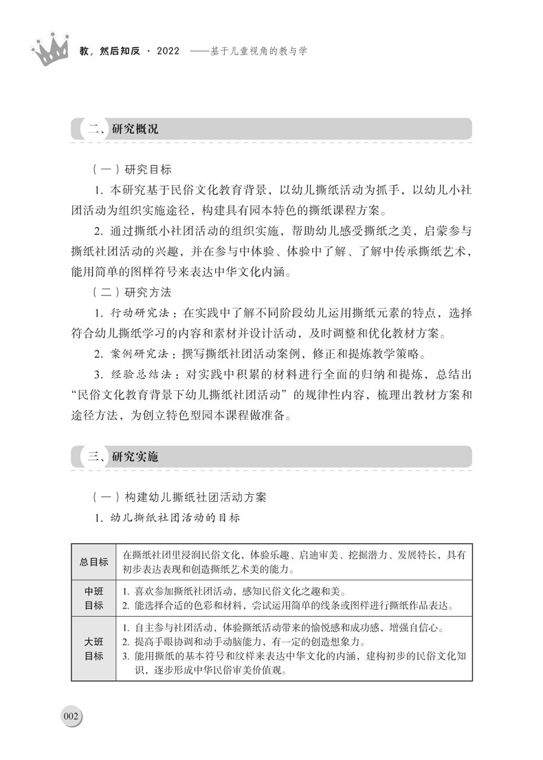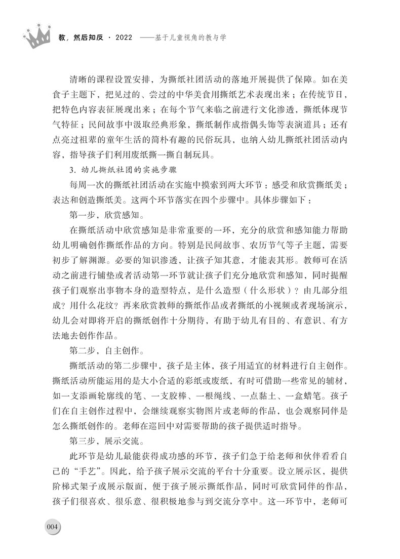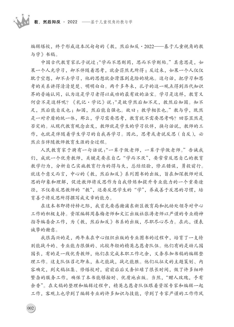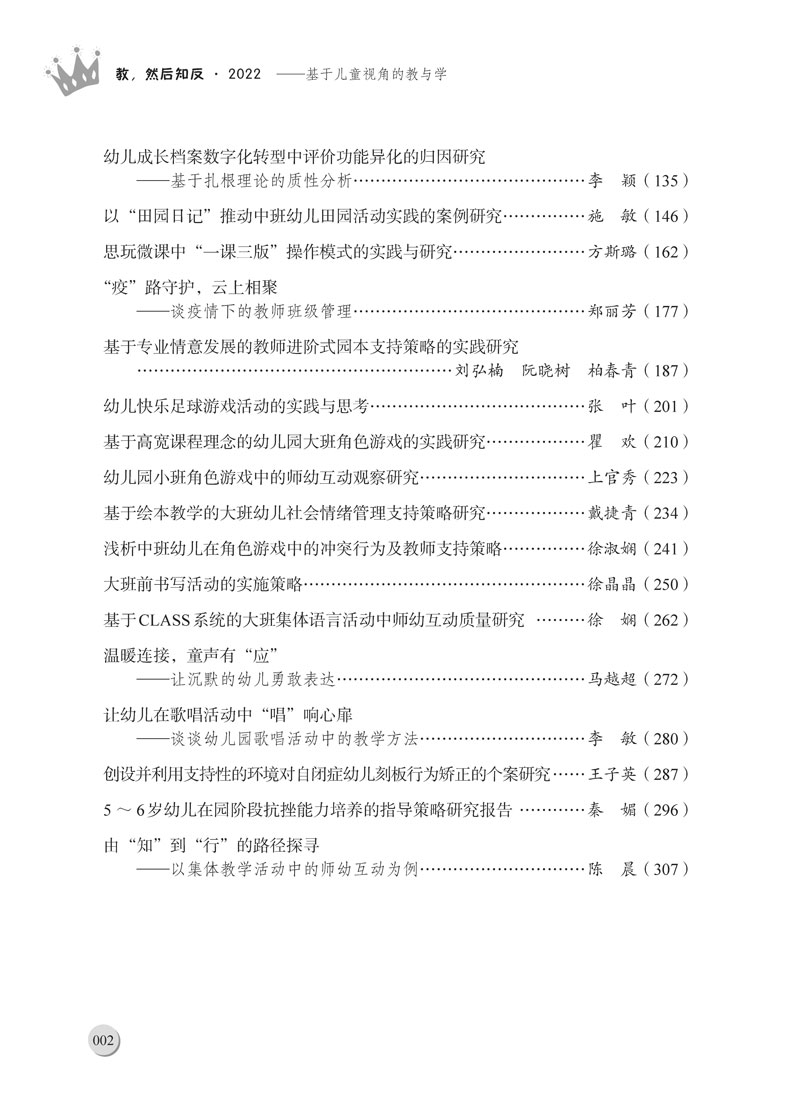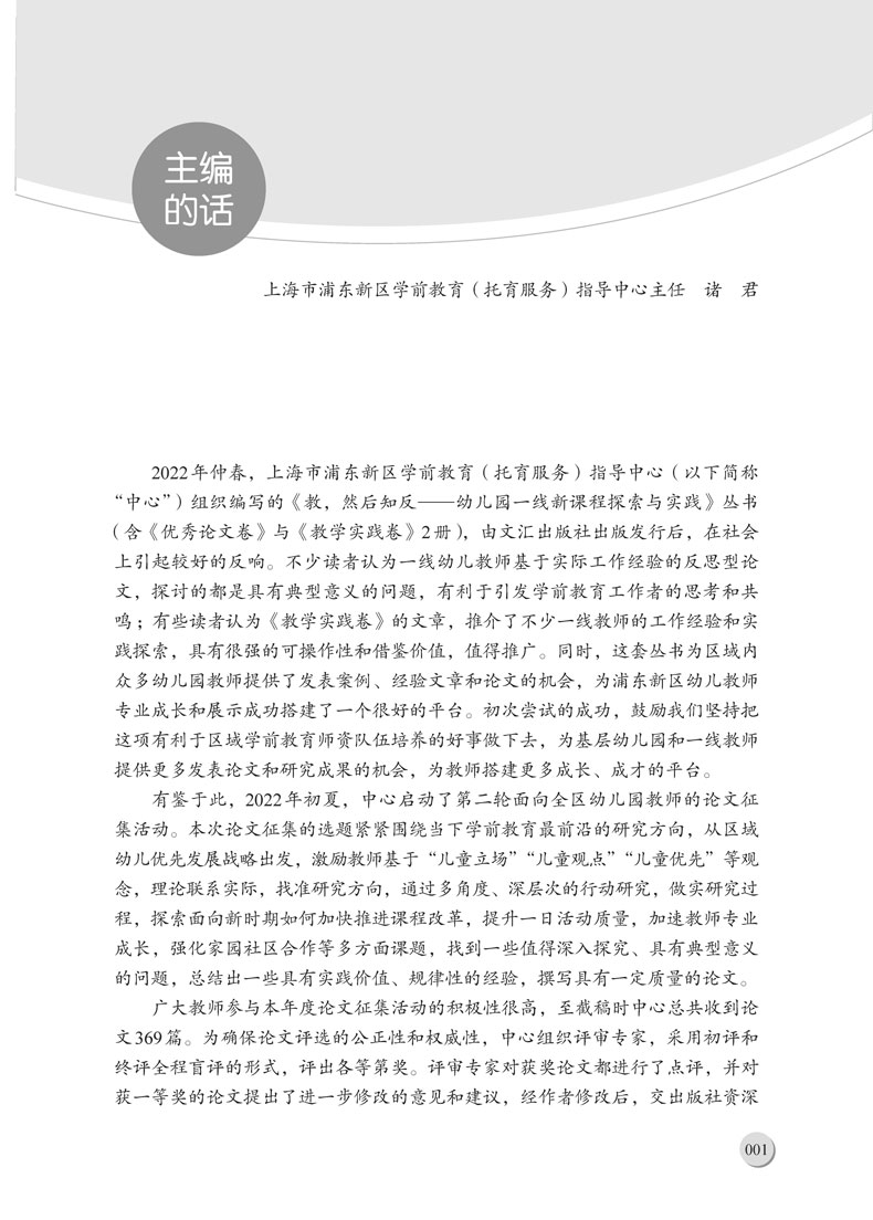 本书为《教,然后知反系列丛书的2022年卷。2022年初夏,上海市浦东新区学前教育(托育服务)指导中心启动了第二轮面向全区幼儿园教师的论文征集活动。本次论文征集的选题紧紧围绕当下学前教育前沿的研究方向,从区域幼儿优先发展战略出发,激励教师基于;儿童立场;儿童观点;儿童优先等观念,理论联系实际,找准研究方向,通过多角度、深层次的行动研究,做实研究过程,探索面向新时期如何加快推进课程改革,提升一日活动质量,加速教师专业成长,强化家园社区合作等多方面课题,找到一些值得深入探究、具有典型意义的问题,总结出一些具有实践价值、规律性的经验,撰写出具有一定质量的论文。本书即为此次论文征集活动中脱颖而出的优秀论文之合辑。