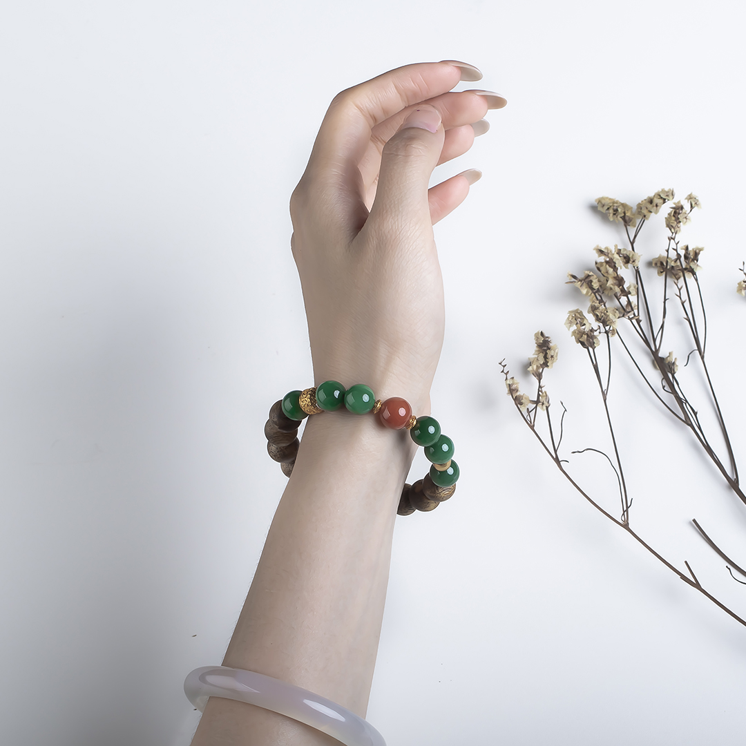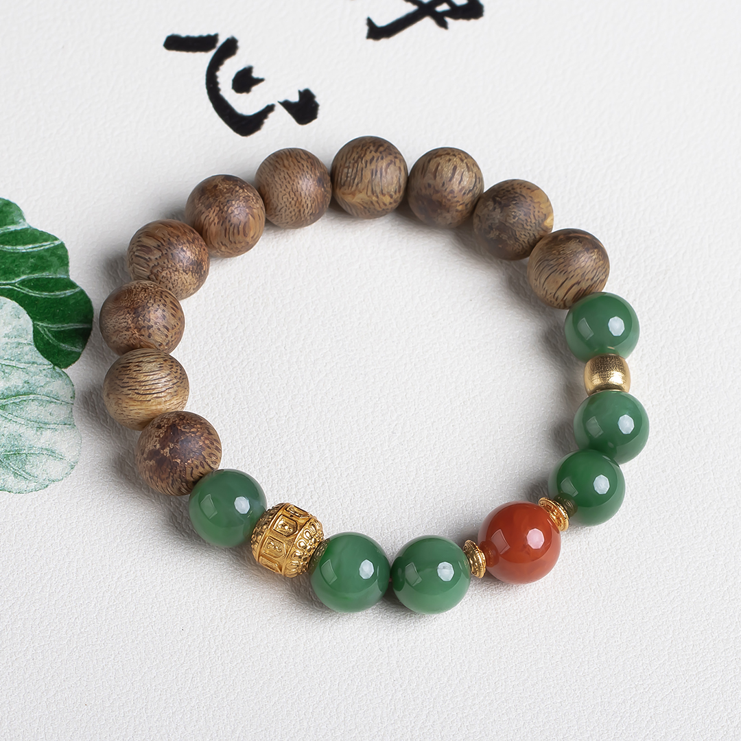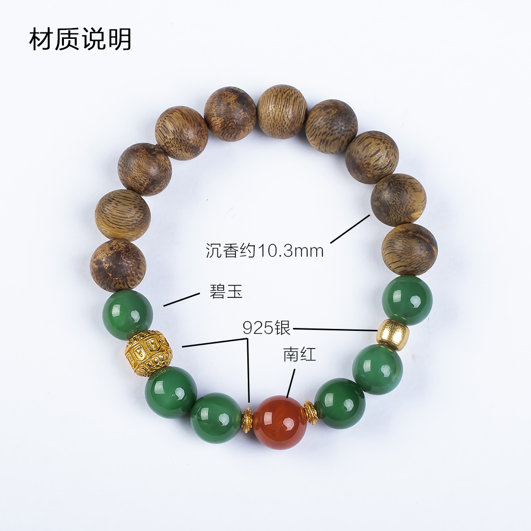xy0574沉香南红碧玉手串,天然沉香约10.3mm,原色原味,香味自然清甜,经典红绿搭配,均是满色满肉品质,玉质细腻润泽,古色古香,上手优雅百搭、养身。