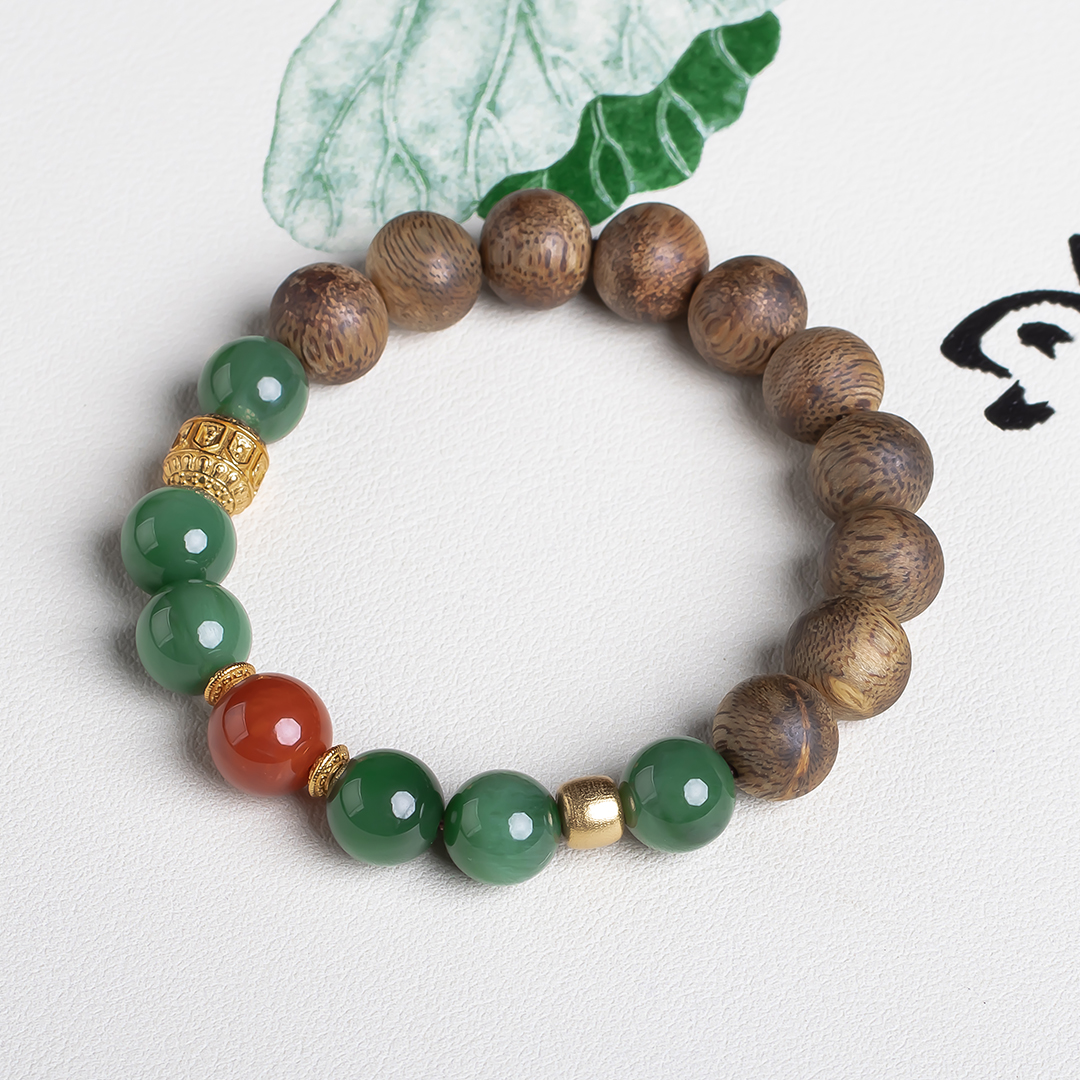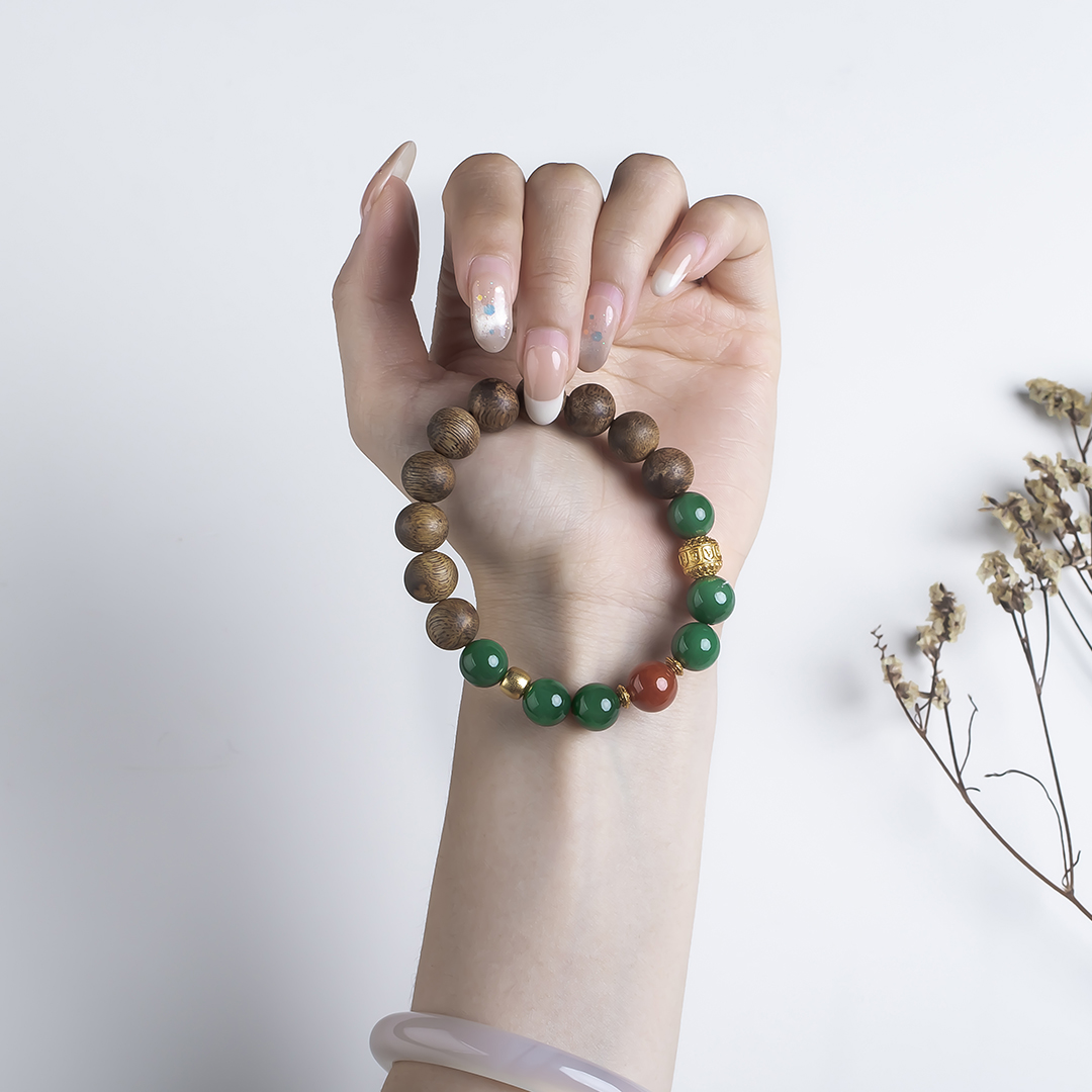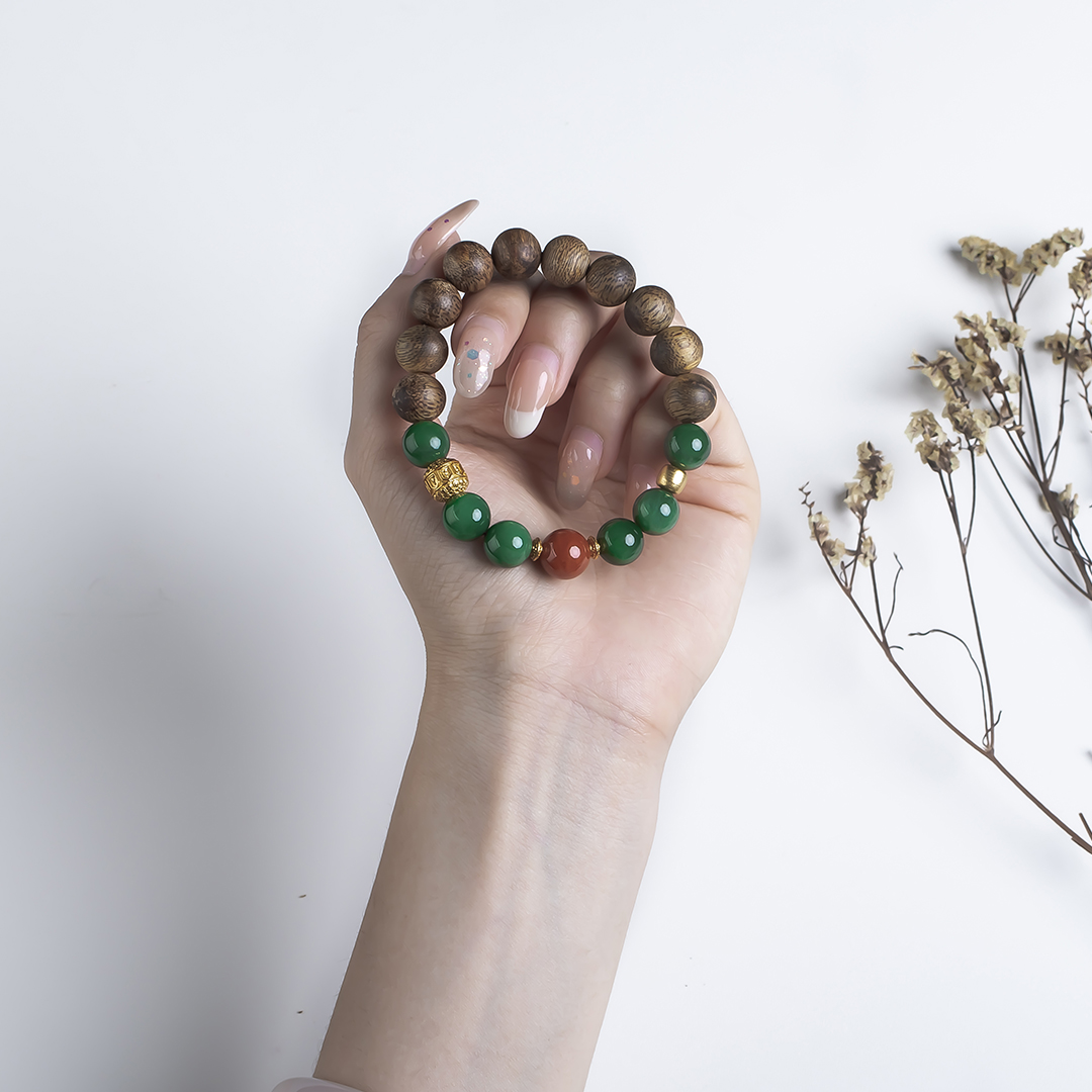 xy0574沉香南红碧玉手串,天然沉香约10.3mm,原色原味,香味自然清甜,经典红绿搭配,均是满色满肉品质,玉质细腻润泽,古色古香,上手优雅百搭、养身。