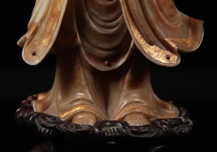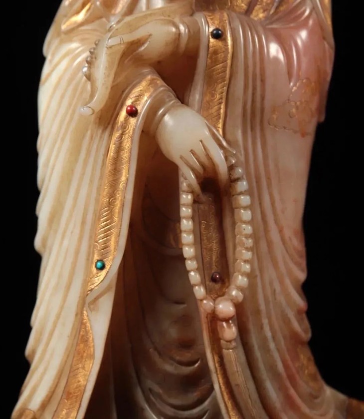 此尊清宫廷观音造像的材质是早已绝产的福建寿山将军洞白芙蓉石,清代乾隆年间,将军洞矿坑塌陷后即不再产出白芙蓉石。近代虽然重启原址开采,所产出的芙蓉石,石质虽然比其它矿洞优良,但相较于古籍记载与传世作品之将军洞芙蓉石那种似玉非玉,美玉无法比拟的质感,终究相去甚远,这种老坑将军洞芙蓉石的质感仅能在老物件中欣赏得到。 此尊寿山將軍洞芙蓉石观音立像是一位资深藏家珍藏数十年的藏品,这位藏家对產于其故乡福建的寿山石情有独衷,多年来寻觅典藏各类新老寿山石之珍品,《用之美》专栏有幸获得他的信赖,协助他整理藏品,并且透过转转会微信公众平台陆续提供他多年来收藏的寿山石精品与朋友们分享,今天大年初一,《用之美》专栏特别策展此尊清宫廷御用观音寿山石精品与朋友们共赏。