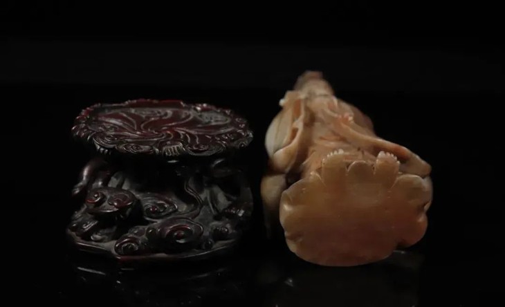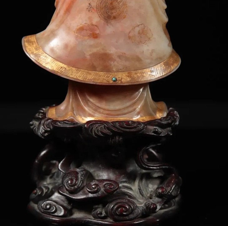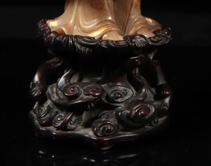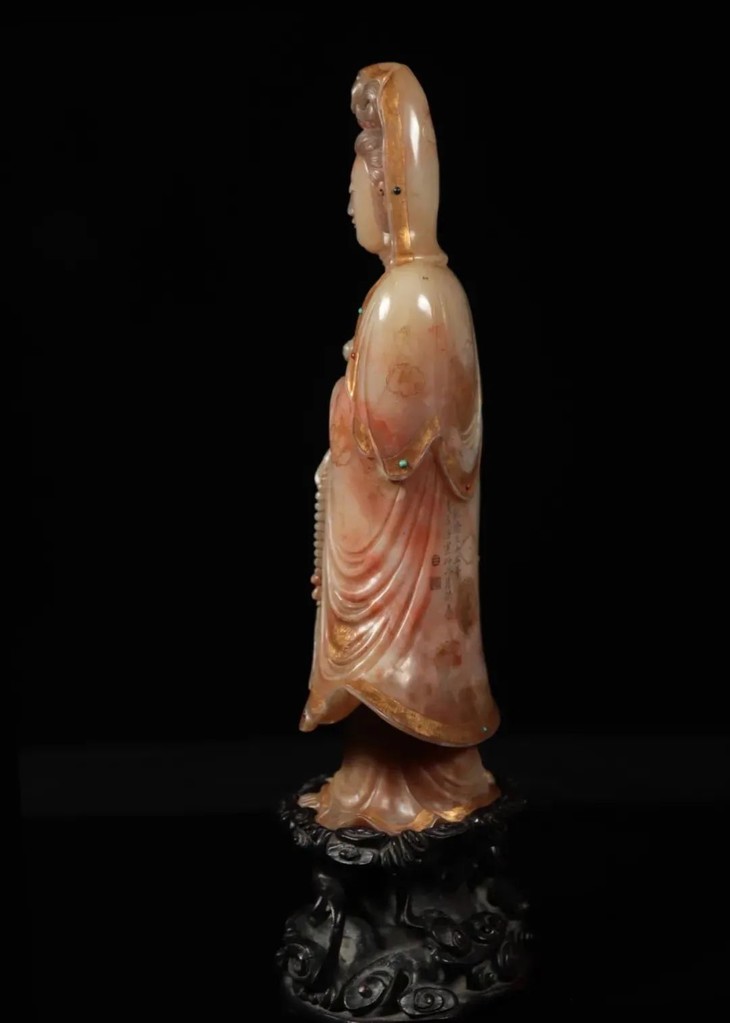 此寿山將軍洞芙蓉石观音立像除表面细微磨痕与小磕碰痕外保存完好,表面包浆皮壳温润细腻。是难得的一件老寿山將軍洞芙蓉石佛像。保留镂雕如意云纹紫檀底座。