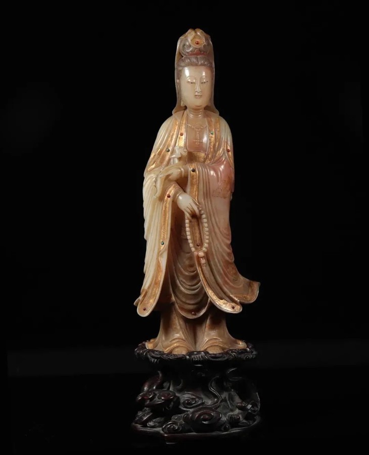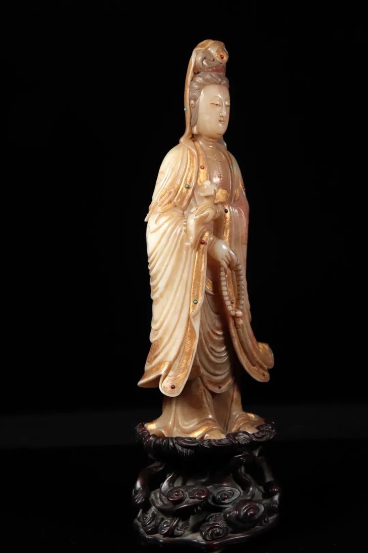 此尊寿山將軍洞芙蓉石观音立像,清代卓越工匠刀工苍劲有力,古朴有神,全然没有近代机械之过度精雕与刨光之痕迹,尽显寿山石之温、润、细、结、凝、灵六德,整体风格贵气华丽,庄严肃穆,尽显皇家风范,是寿山石佛像雕塑中的经典佳作。
