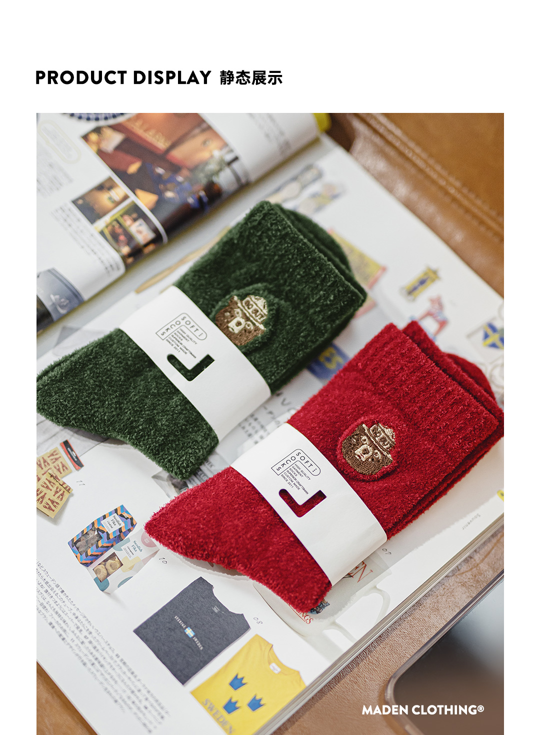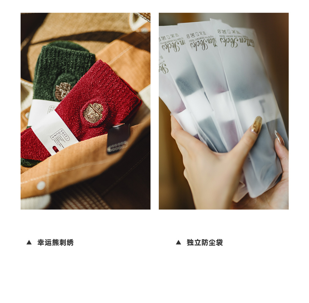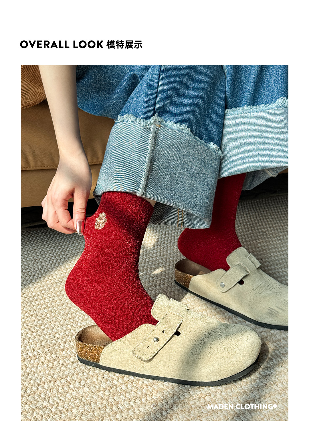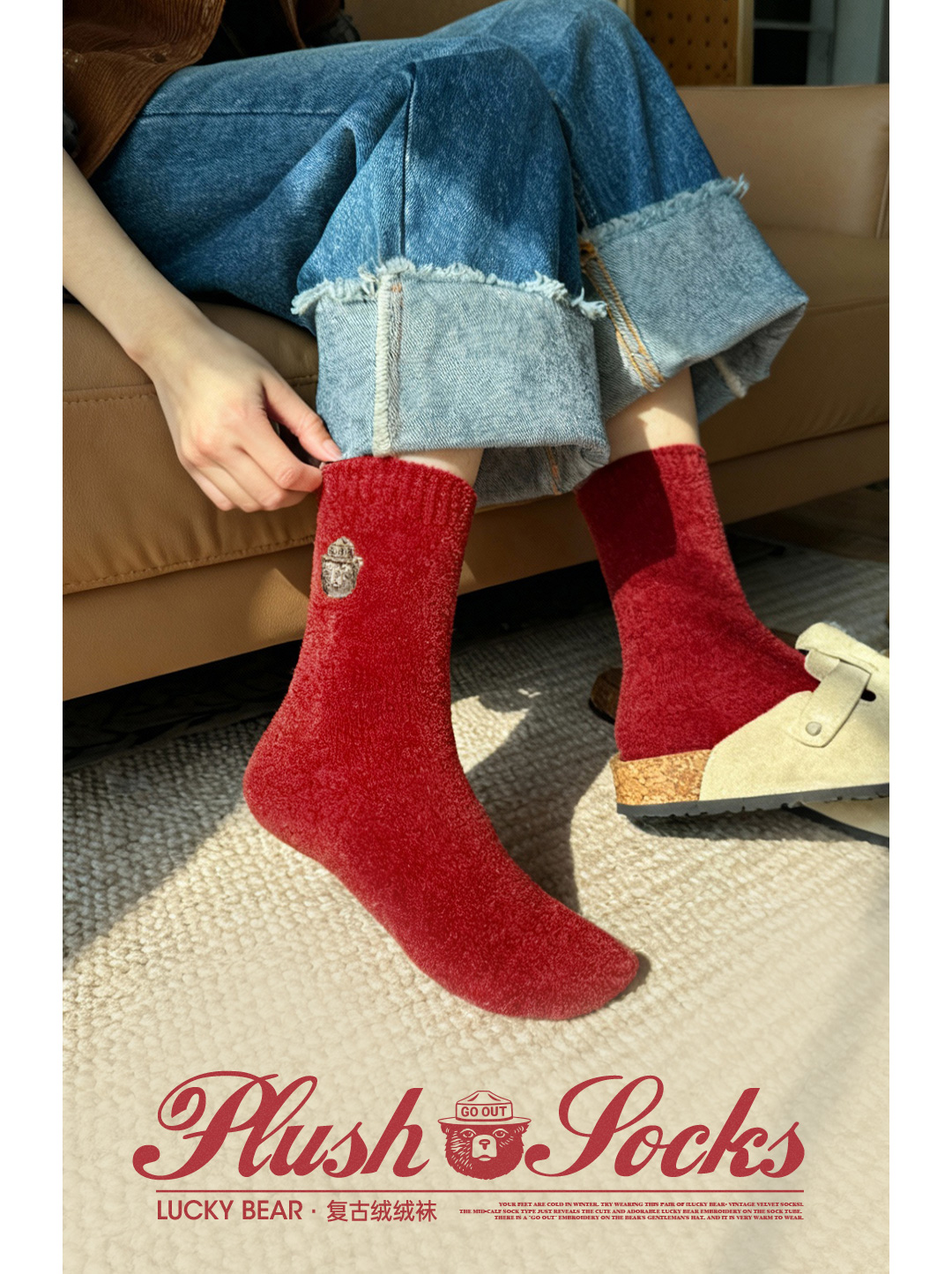 马登红色圣诞袜子珊瑚绒复古加厚保暖中筒睡眠刺绣弹力长袜女秋冬