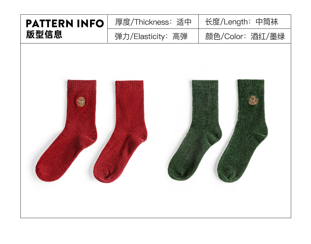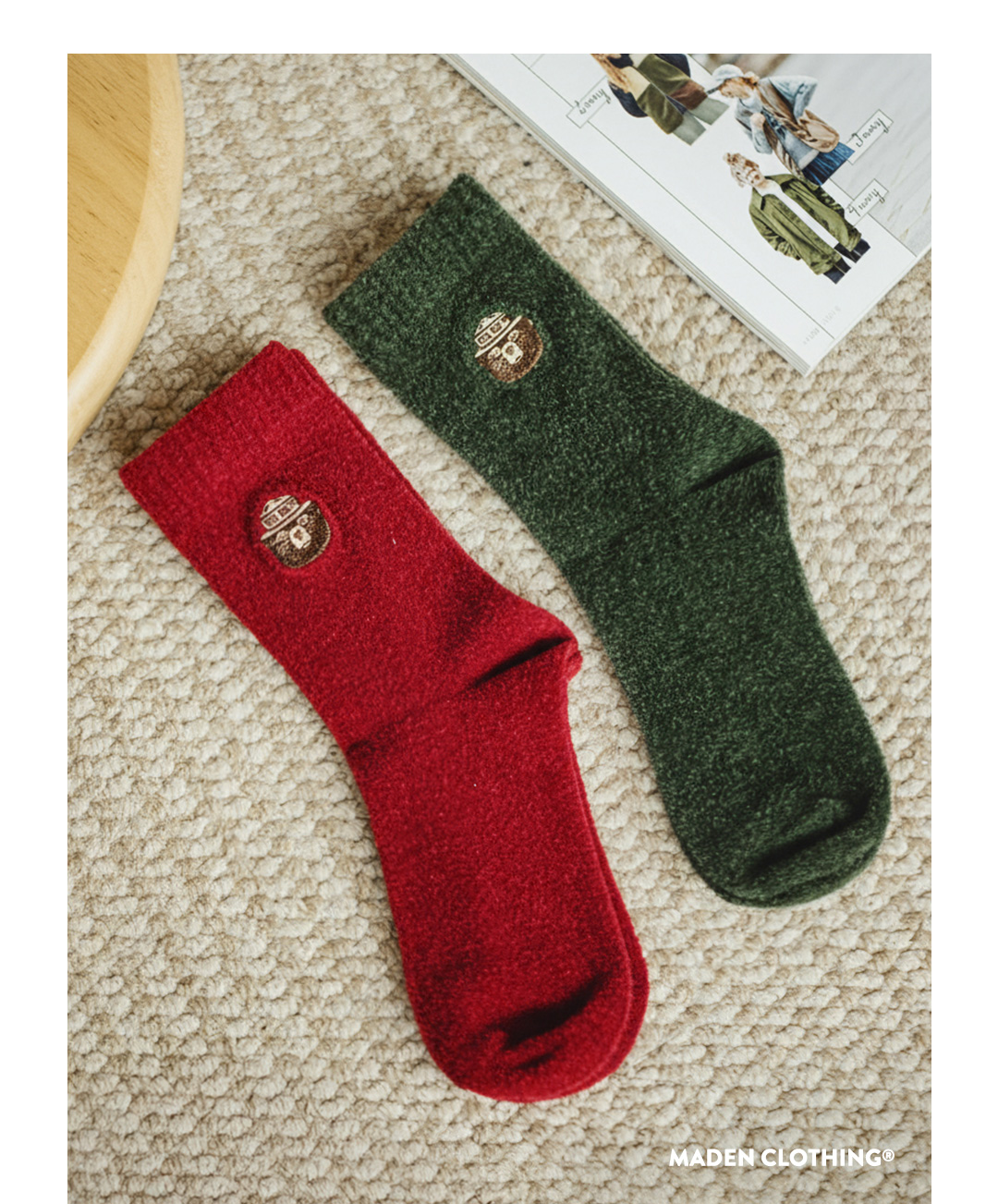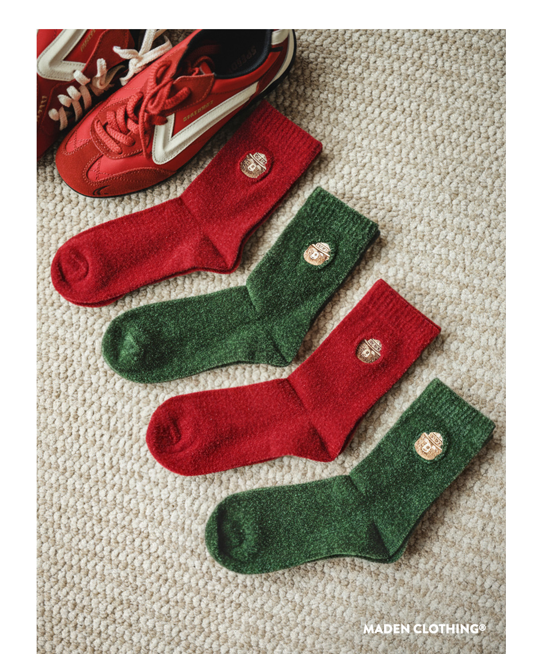马登红色圣诞袜子珊瑚绒复古加厚保暖中筒睡眠刺绣弹力长袜女秋冬