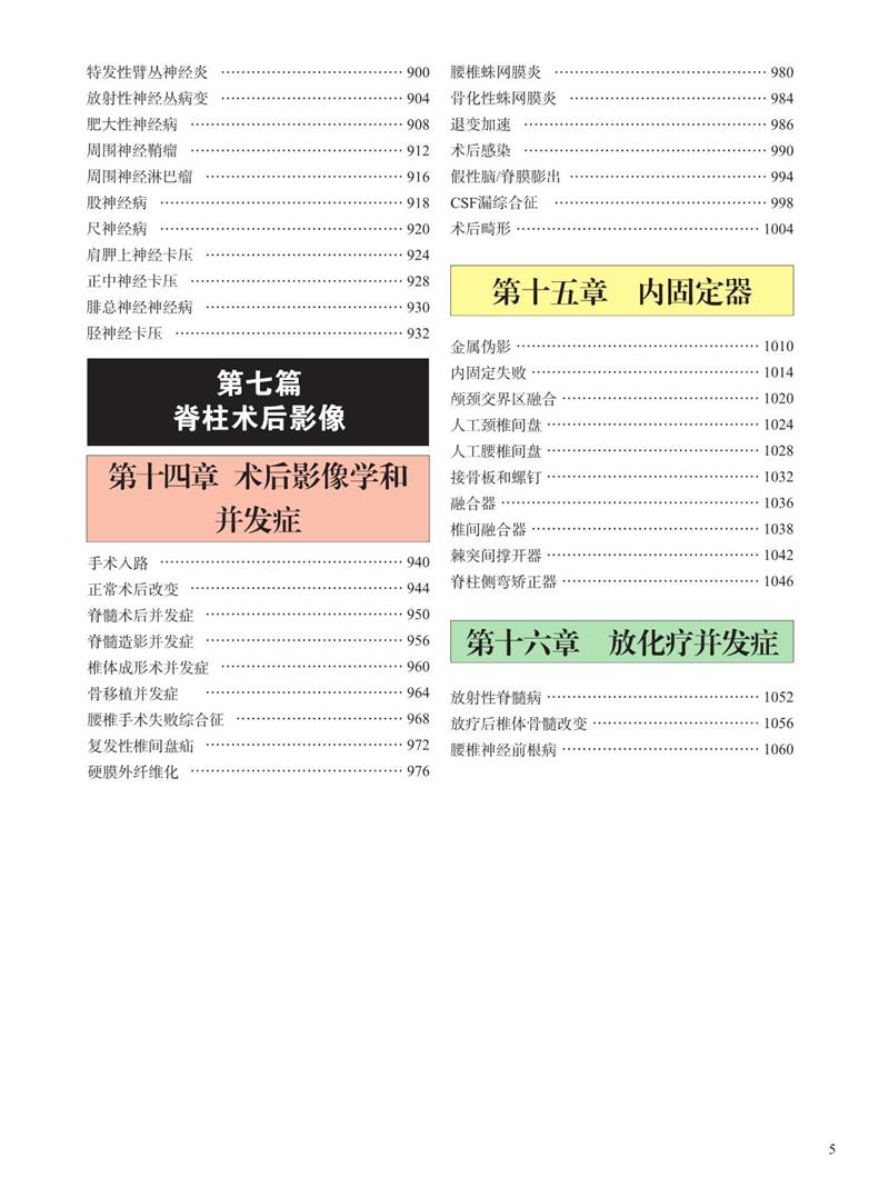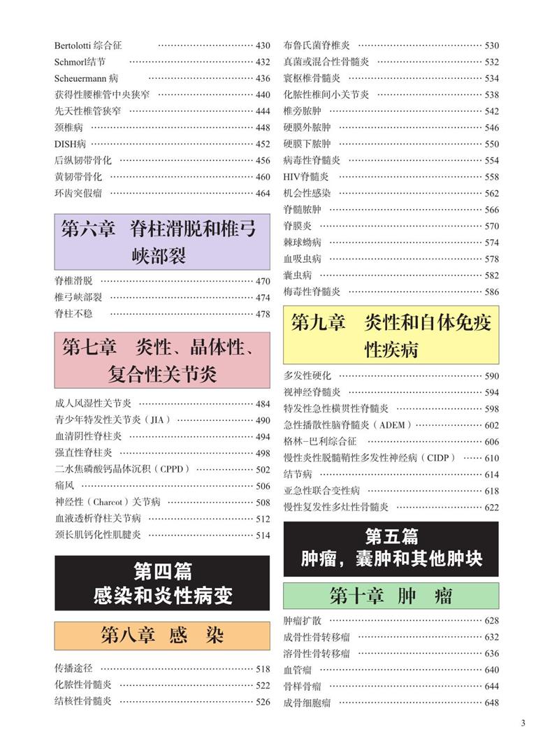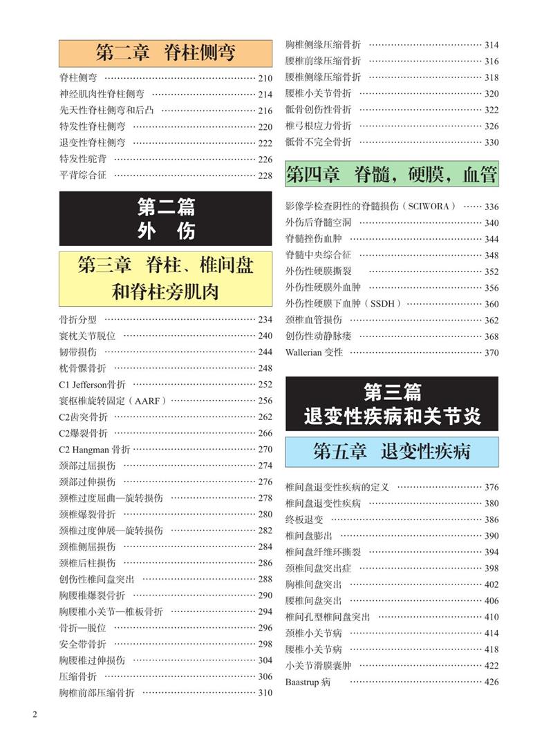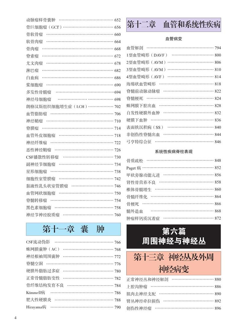 全书共分七篇十六章,1000余页,用简练的文字和大量的影像资料片和计算机绘制彩图,比较详细地介绍了400余种脊柱病变,内容涵盖先天性或遗传性疾病、脊柱侧弯、外伤、退变性疾病、感染和炎性疾病、肿瘤、血管性疾病、周围神经疾病、放化疗术后改变等,几乎囊括所有脊柱病变。对于每种疾病,除了在开始处以列表的形式给出疾病的诊疗要点外,又以简练文字给出了相关病因、病理、诊断要点、成像技术选择和影像特征、治疗和预后等;其中,以较大篇幅比较详细地介绍了各种成像技术的优缺点以及相对每种脊柱病变的*成像技术选择,每种脊柱病变的影像学特征。