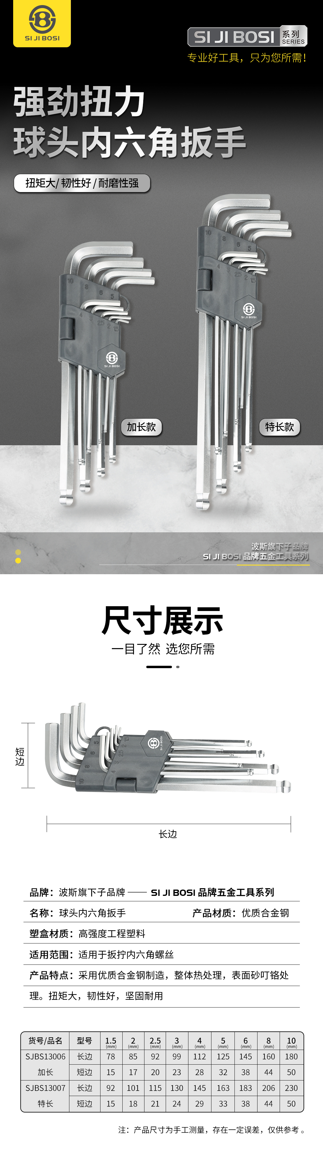 波斯 加长球头内六角扳手 9PC公制1.5-10mm SJBS13006