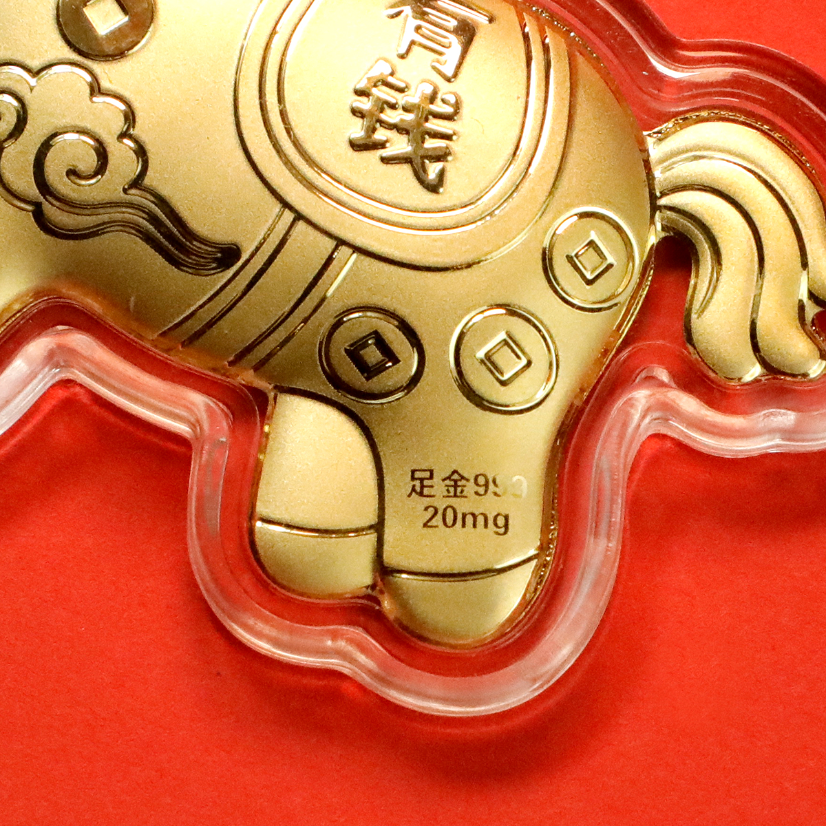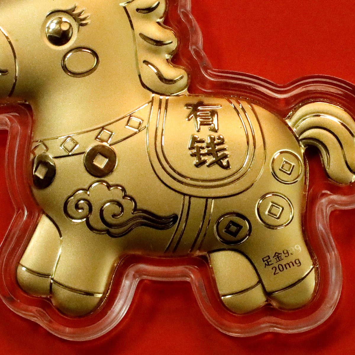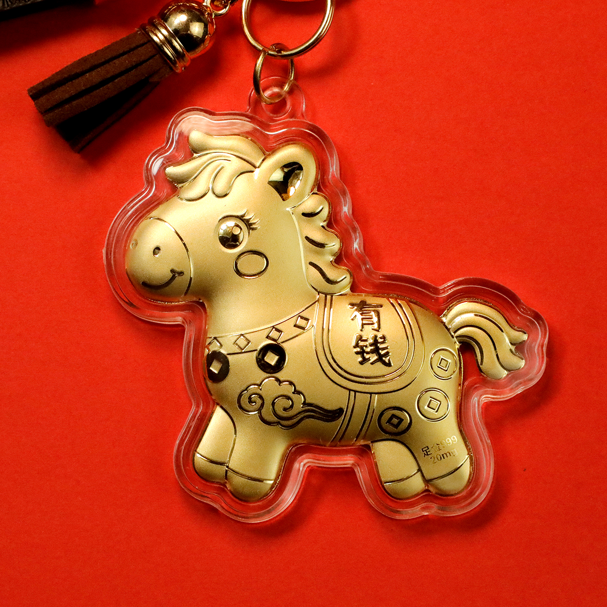 这款挂件内含0.02克999足金,马背上刻上了“有钱”两字,寓意着“马上有钱”,拿下这枚挂件,寓意着我们就能马上有钱!