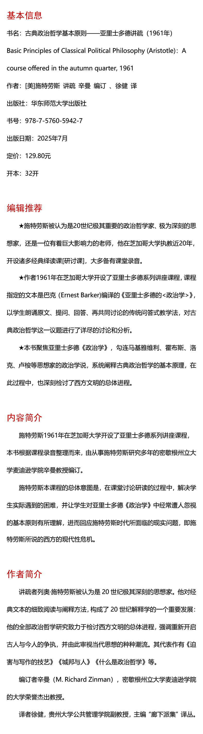 古典政治哲学基本原则 亚里士多德讲疏 经典与解释 施特劳斯讲学录