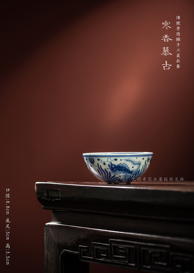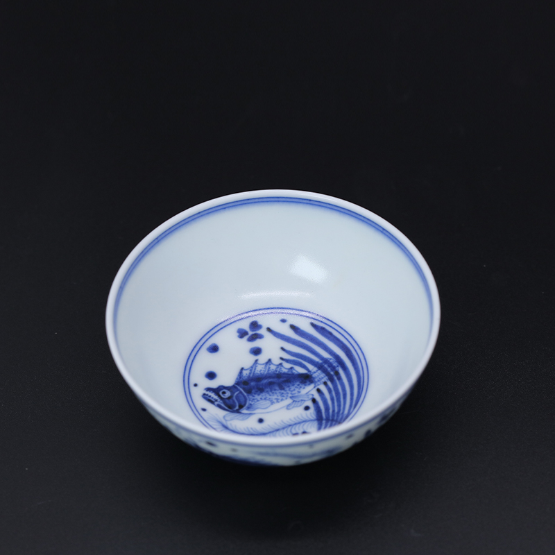 寒香慕古元明青花糯米釉鱼藻纹卧足杯