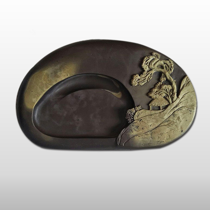 此砚根据石材色彩来设计,既有乡间野趣,又兼文雅之风,砚面雕饰简洁,大树、峻山、茅屋、墨池作小池塘。给人“少一笔则不足,多一笔则多余”之畅快感。