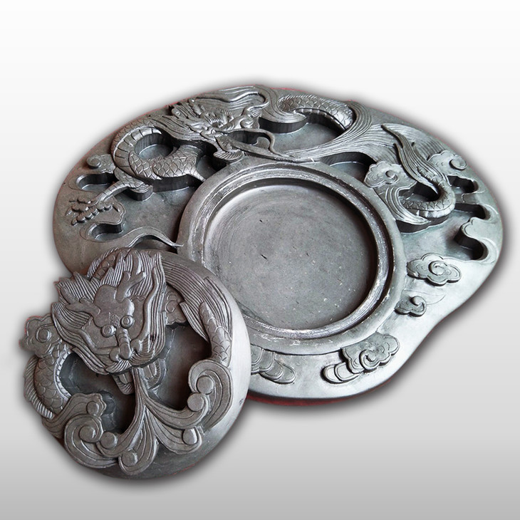 这是实用型凤羽砚的代表作,一条腾云驾雾之游龙,中间的墨池巧妙地设计成龙头,并配了一个龙盖,可保水墨不干,实用超值。