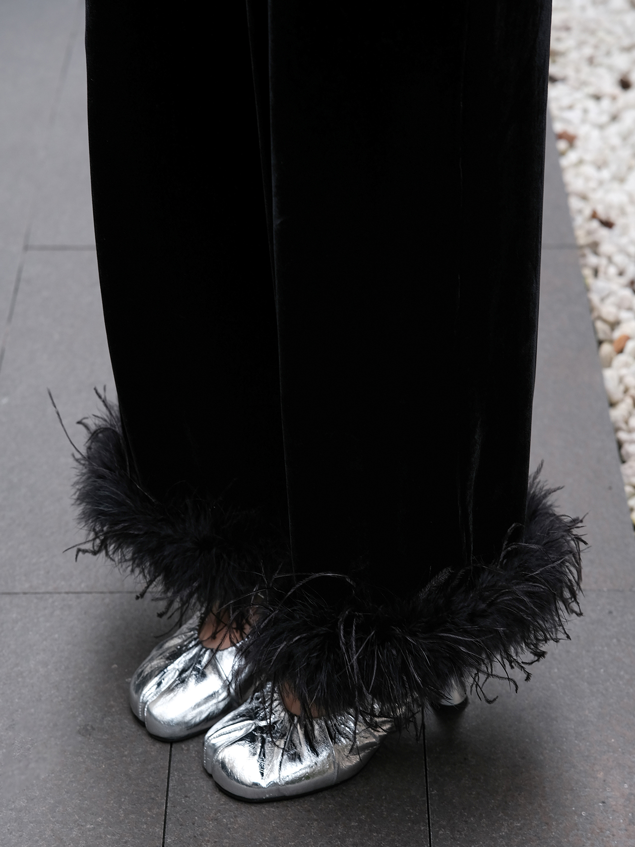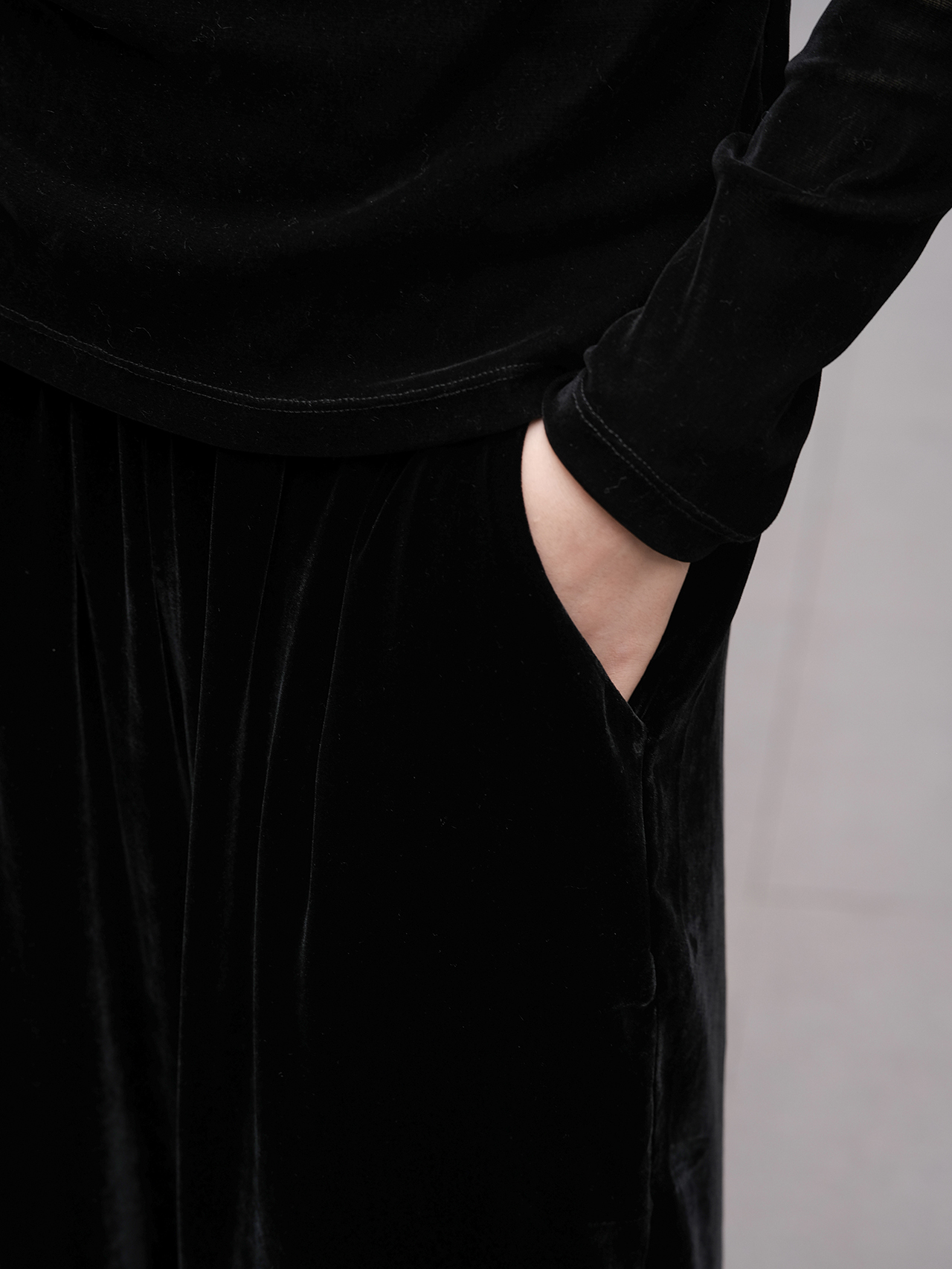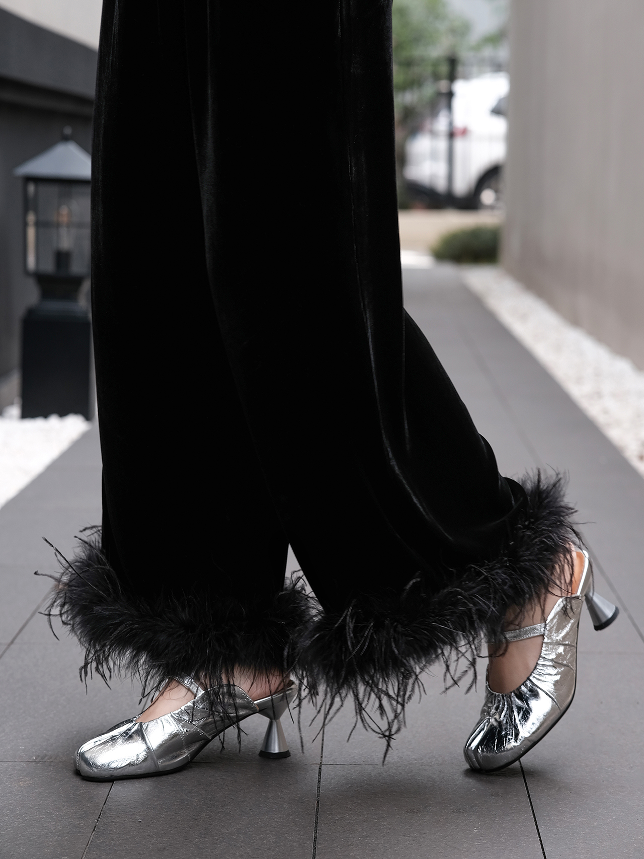 盛唐婧 | 新中式真丝丝绒鸵鸟毛阔腿裤