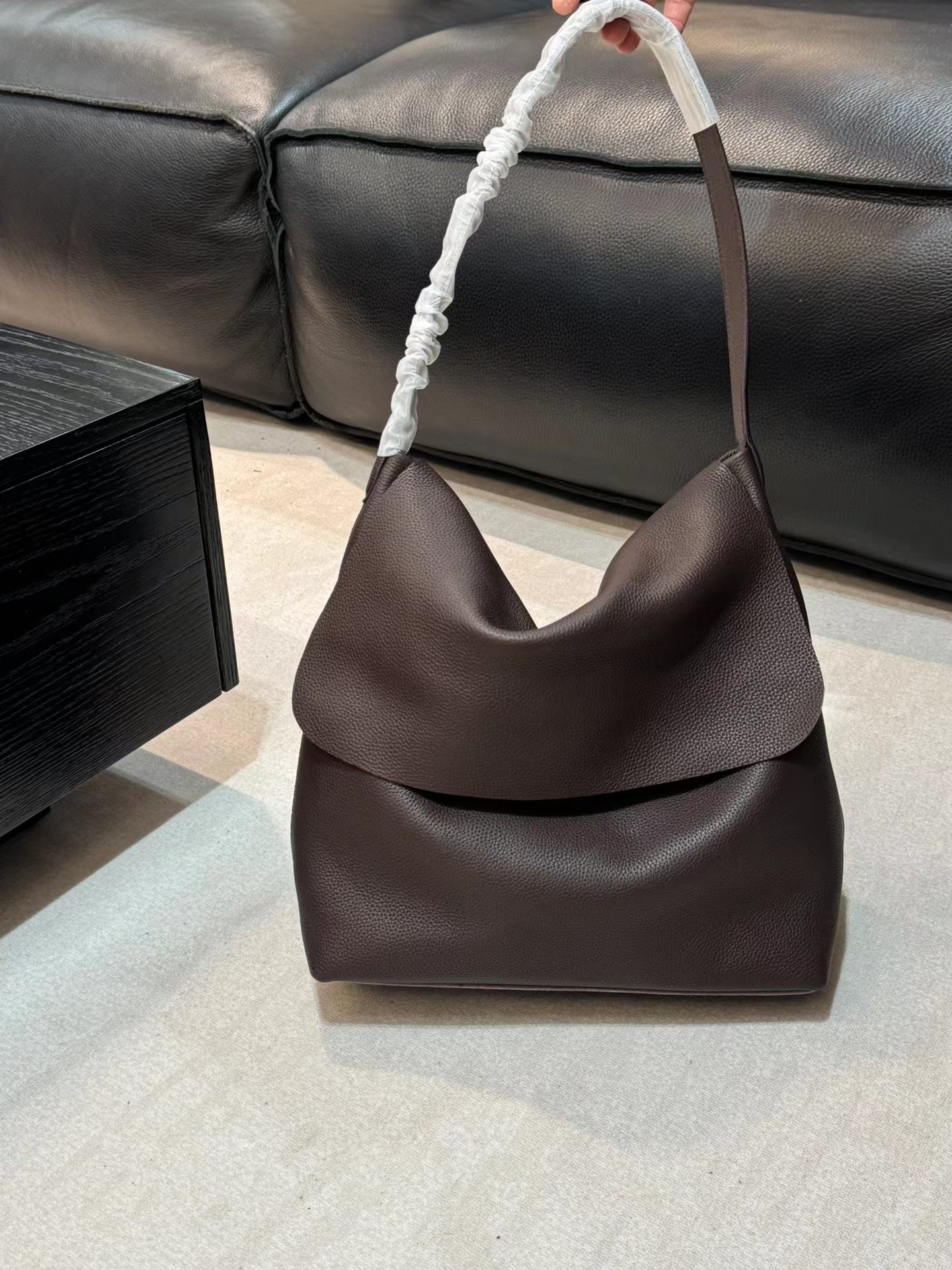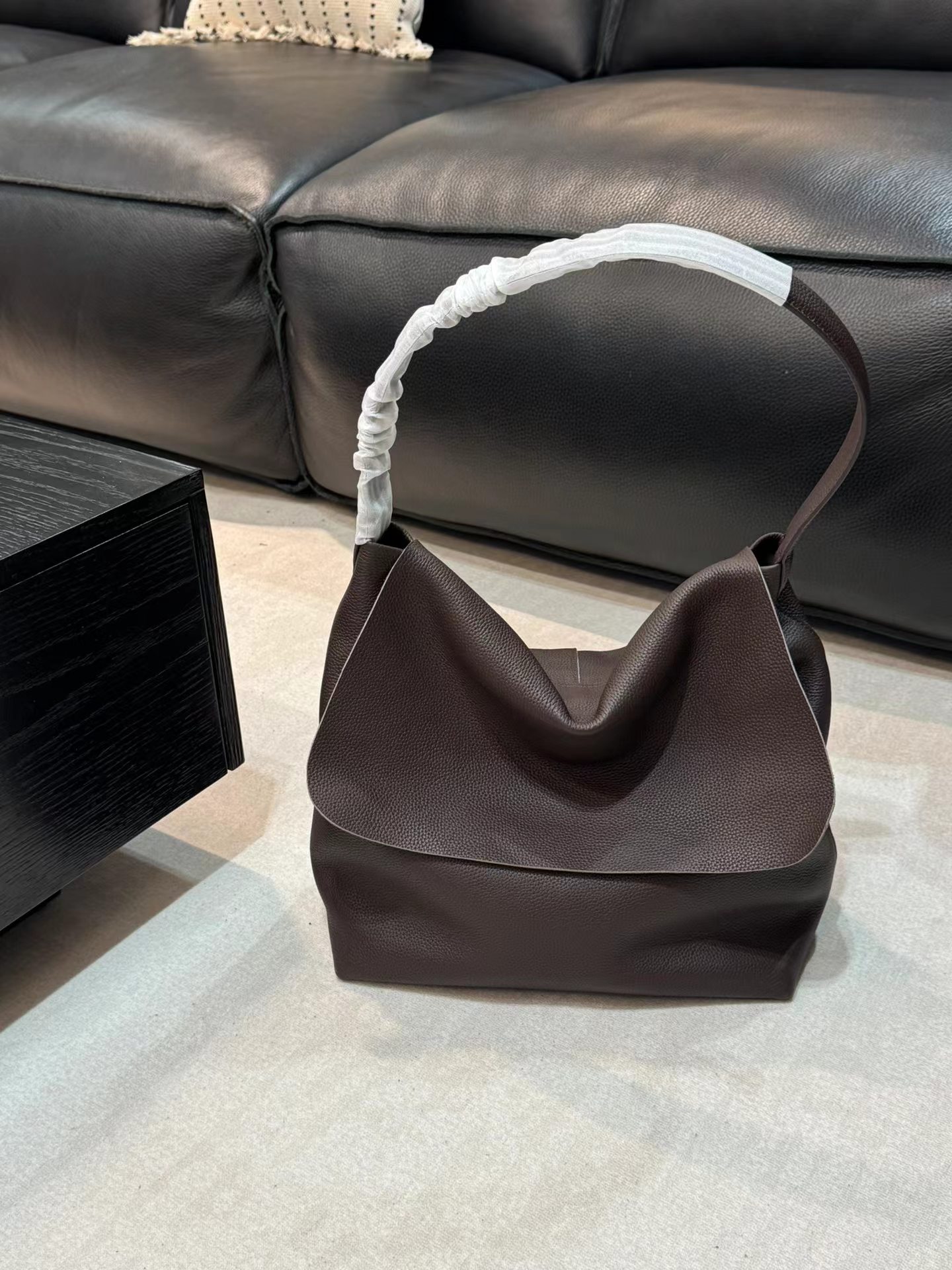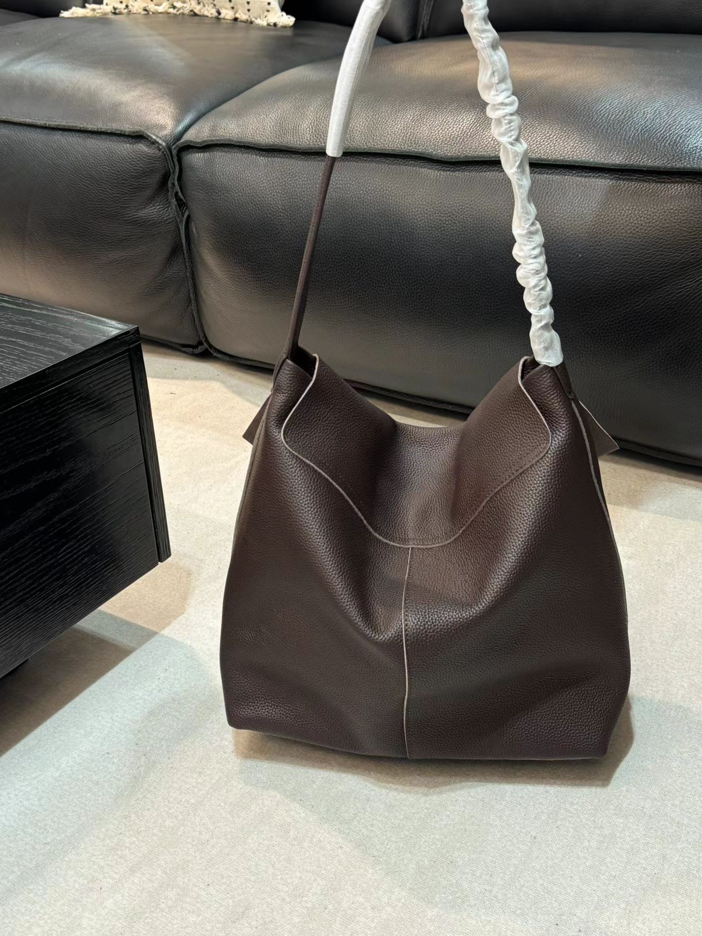 头层牛皮腋下托特包水桶 慵懒松弛感 小众设计打破常规简约造型 轻若无物却质感爆棚 柔软包身 适合四季 空间格局很能装 黑棕两色 实用性与质感于一身的托特包