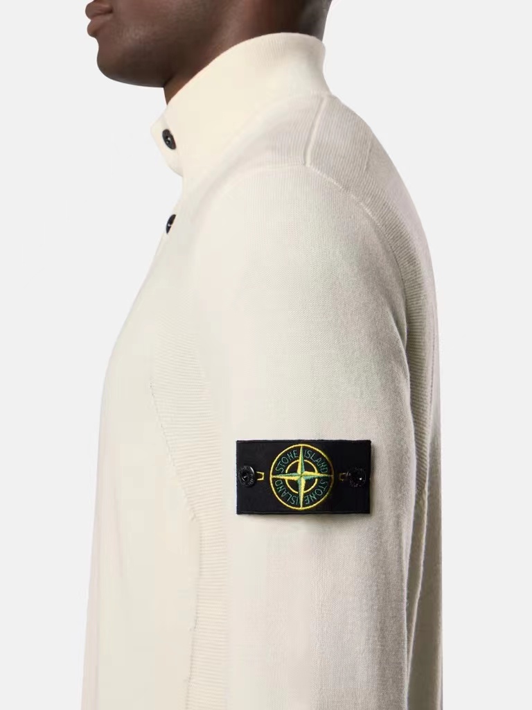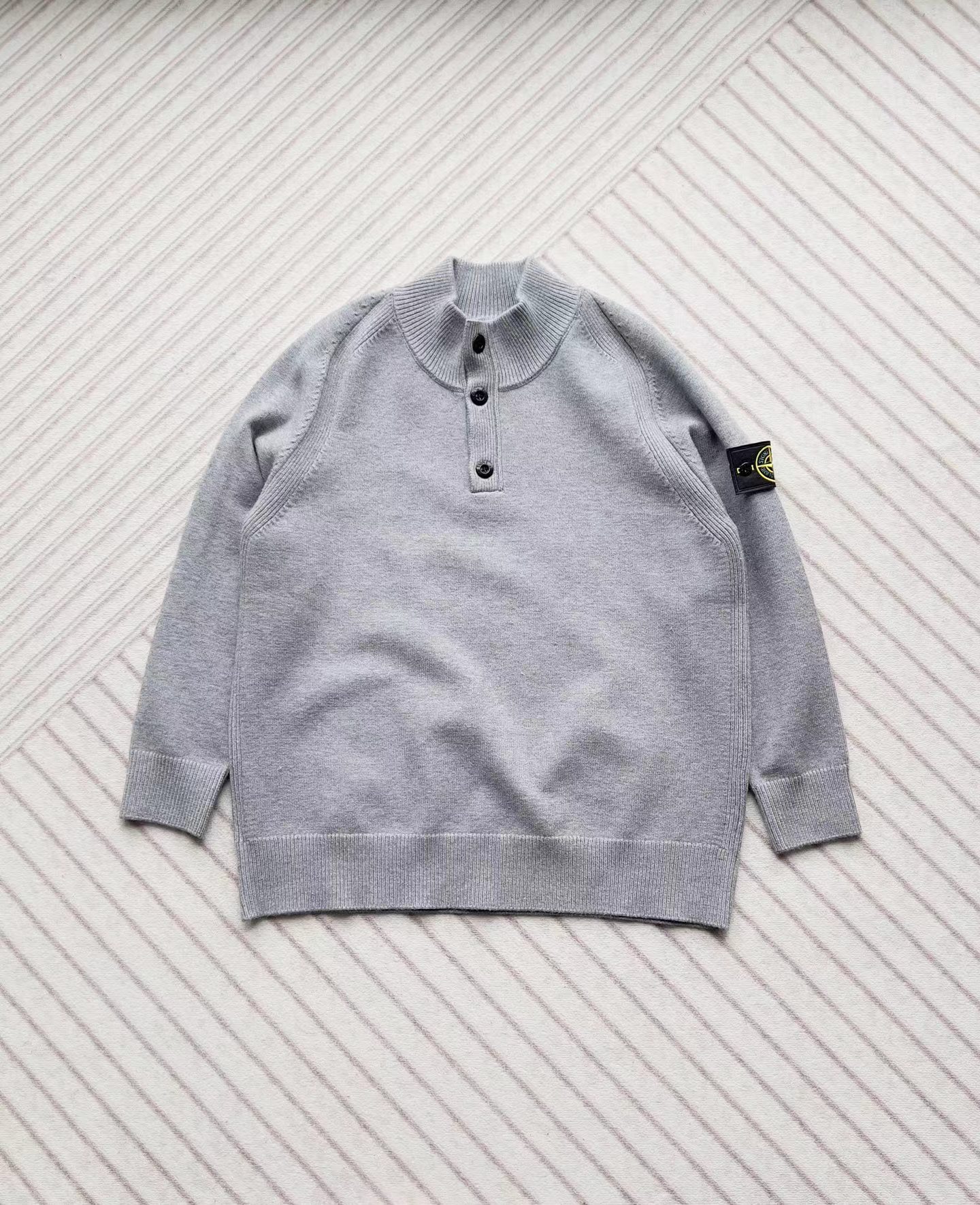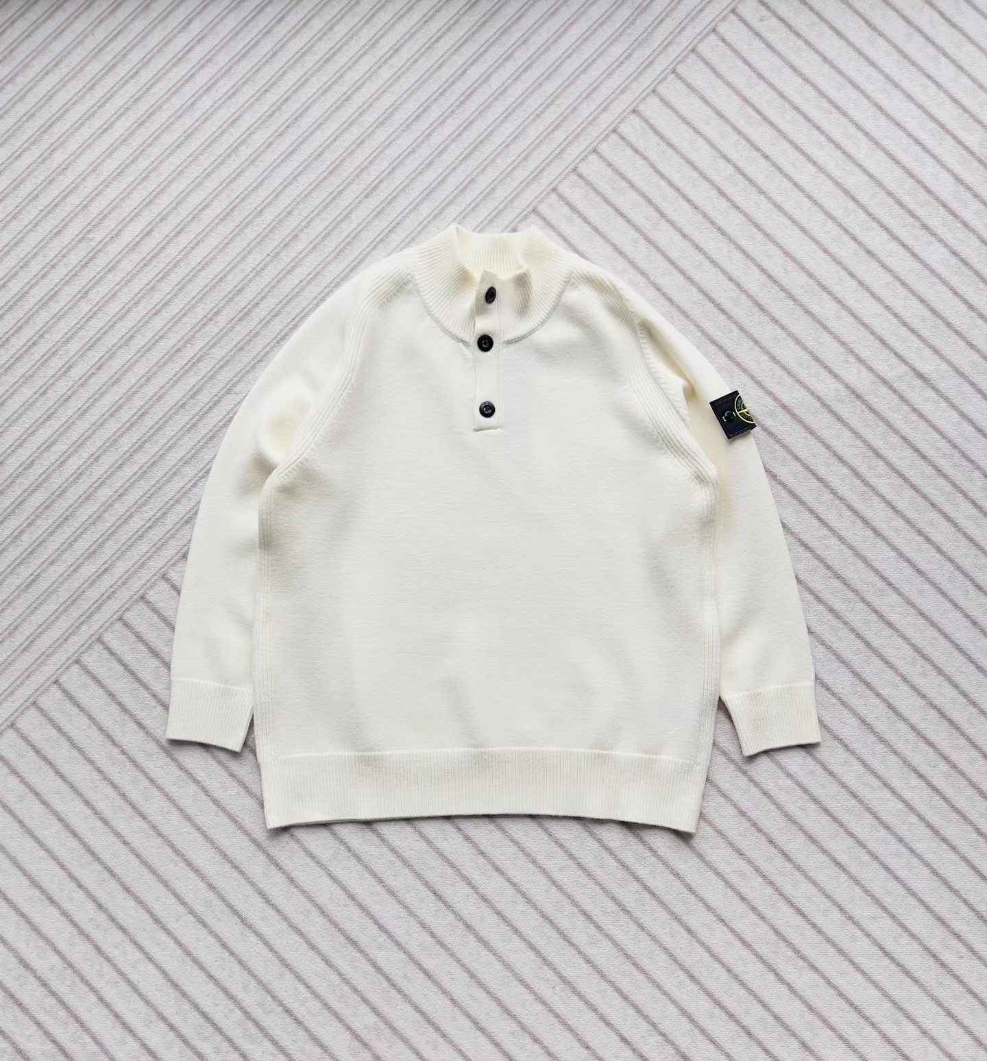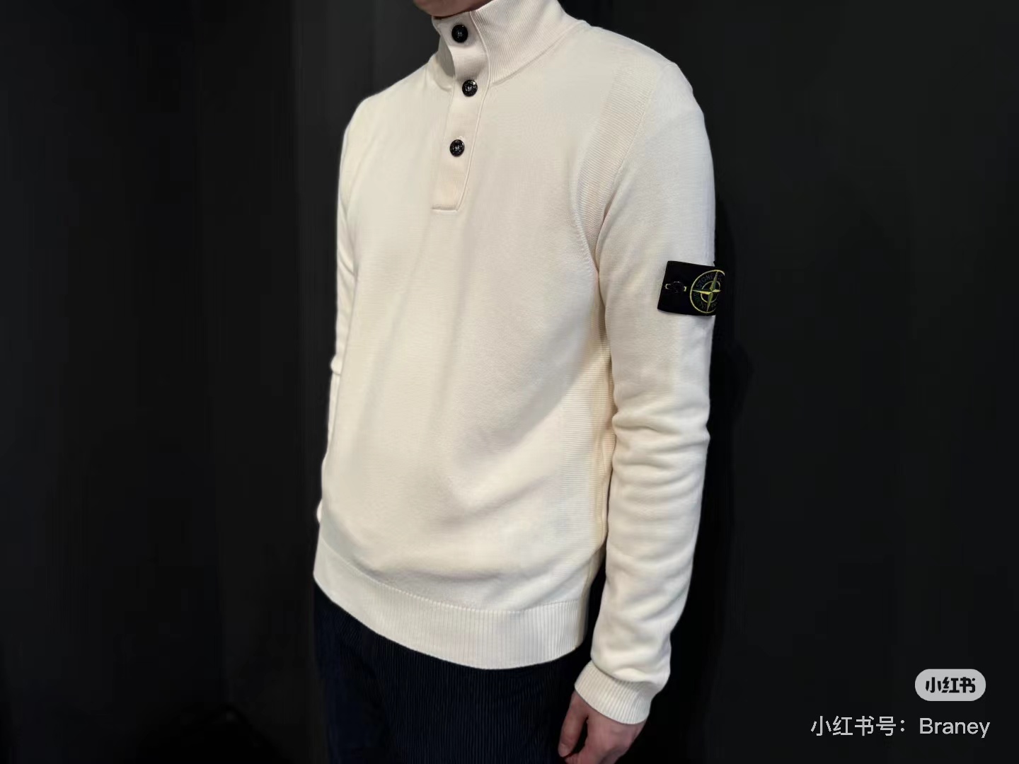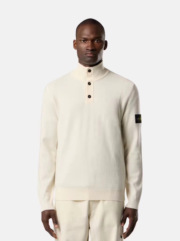 棉毛混纺半纽扣高领针织套头毛衣。高领立领半开纽扣毛衣,反丝袜针线带+凸起边接缝。棉毛混纺材质 针织结构。下摆、袖口,领口 均有螺纹边收口。袖侧标志性可拆卸罗盘绣花徽章。长袖款 平直下摆 常规版型。本产品为棉毛混纺针织衫,手感柔软舒适亲肤,面料弹性大,适合多样人群 大众身材。不挑人,非常百搭。可内穿增温保暖也可外穿套头外套。版型微宽松,男女都可驾驭。