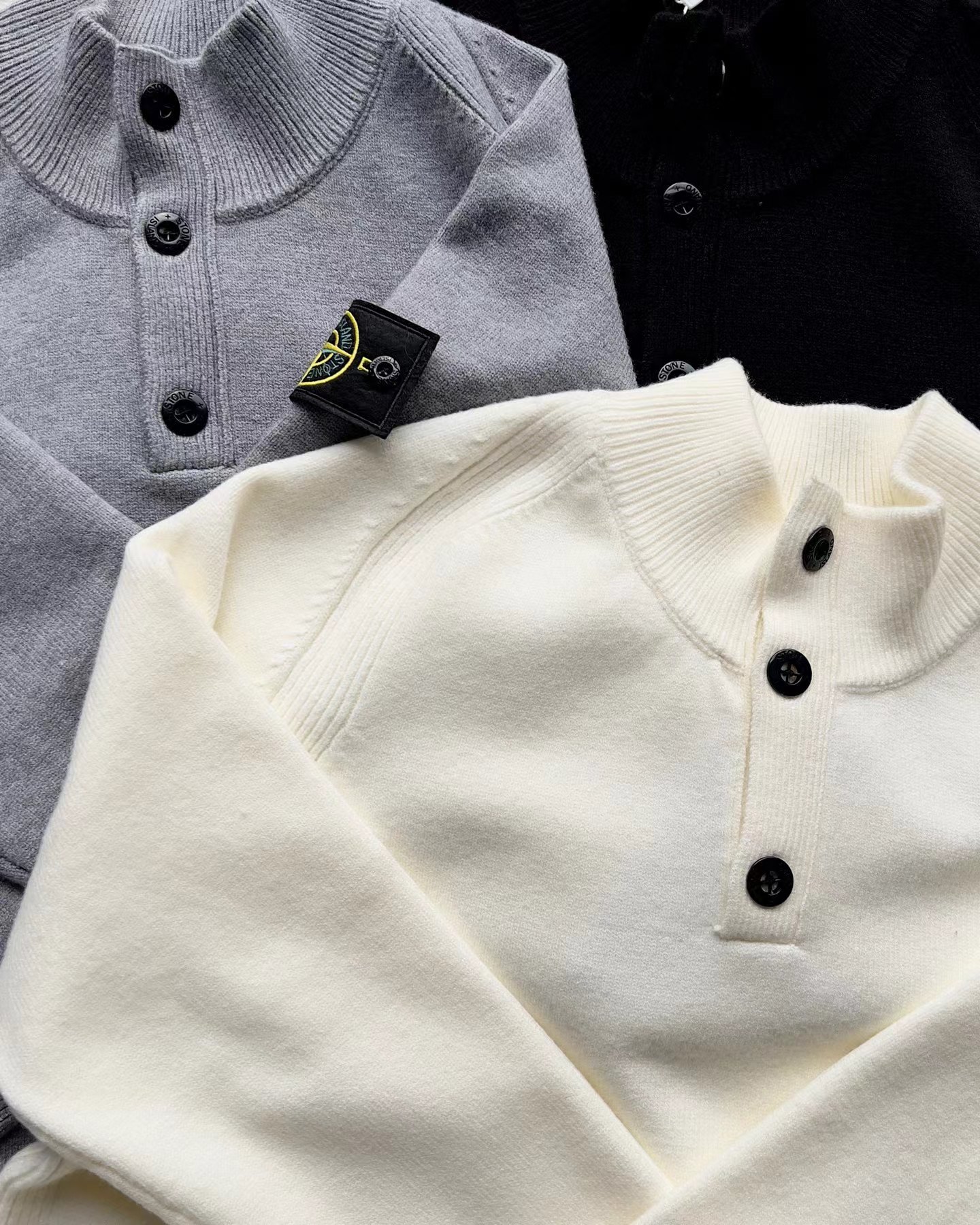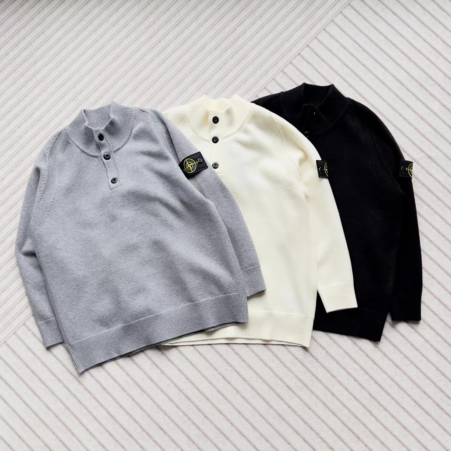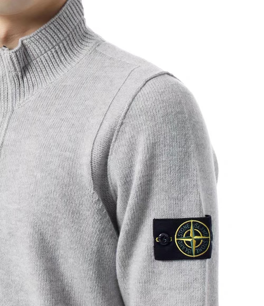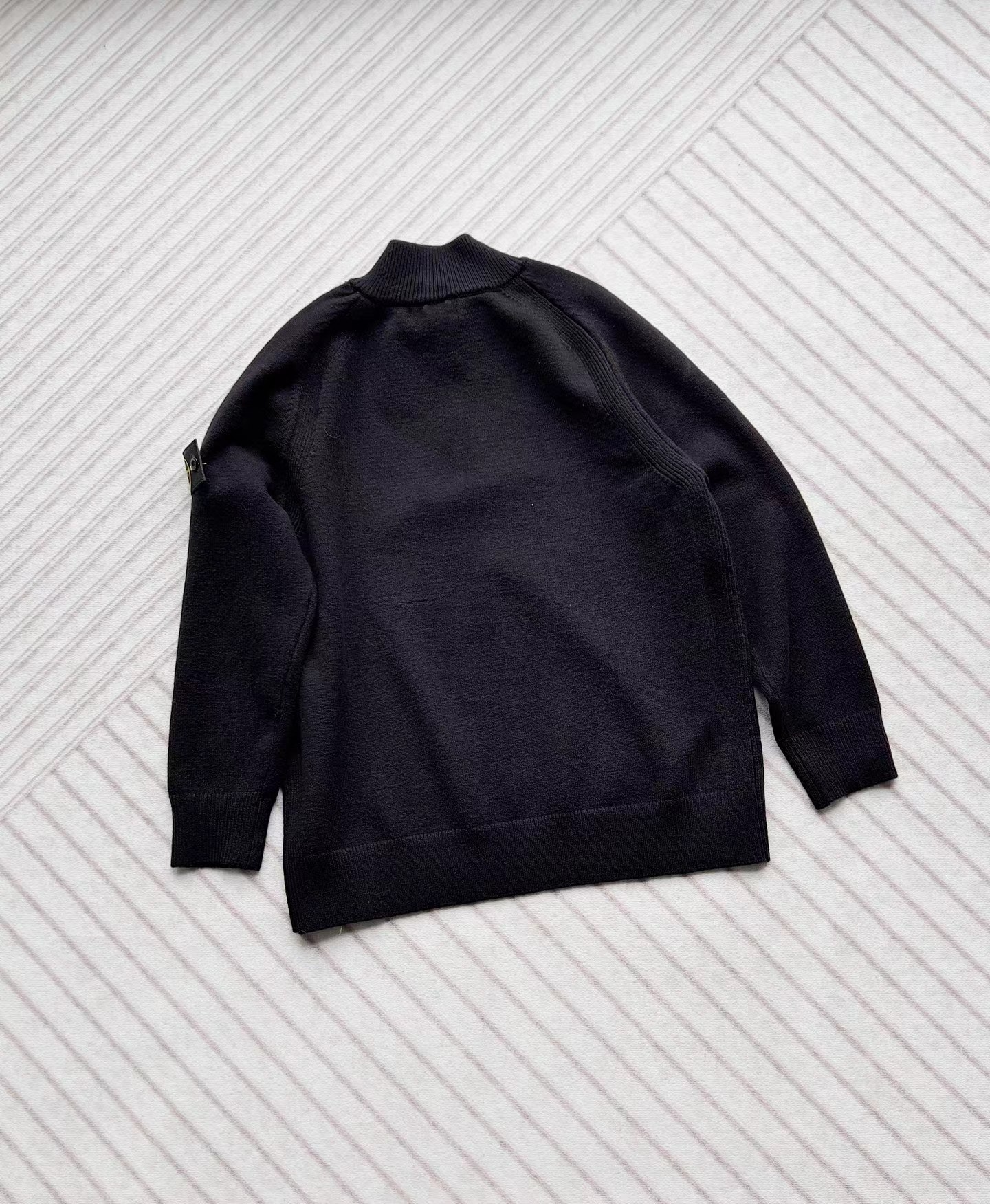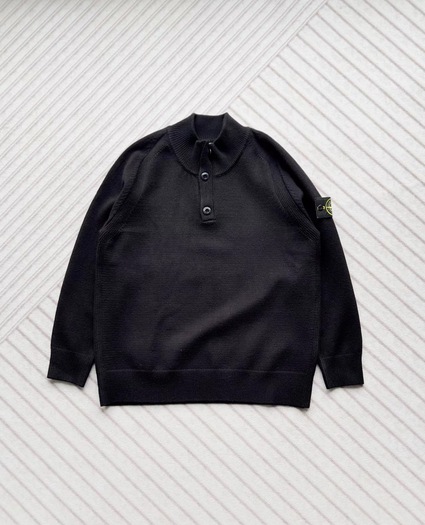 棉毛混纺半纽扣高领针织套头毛衣。高领立领半开纽扣毛衣,反丝袜针线带+凸起边接缝。棉毛混纺材质 针织结构。下摆、袖口,领口 均有螺纹边收口。袖侧标志性可拆卸罗盘绣花徽章。长袖款 平直下摆 常规版型。本产品为棉毛混纺针织衫,手感柔软舒适亲肤,面料弹性大,适合多样人群 大众身材。不挑人,非常百搭。可内穿增温保暖也可外穿套头外套。版型微宽松,男女都可驾驭。