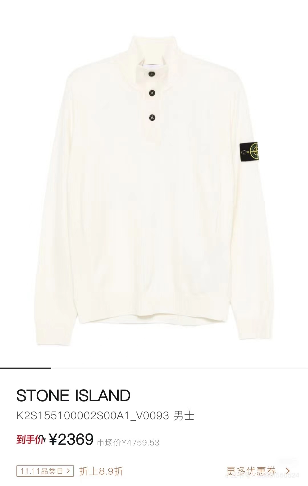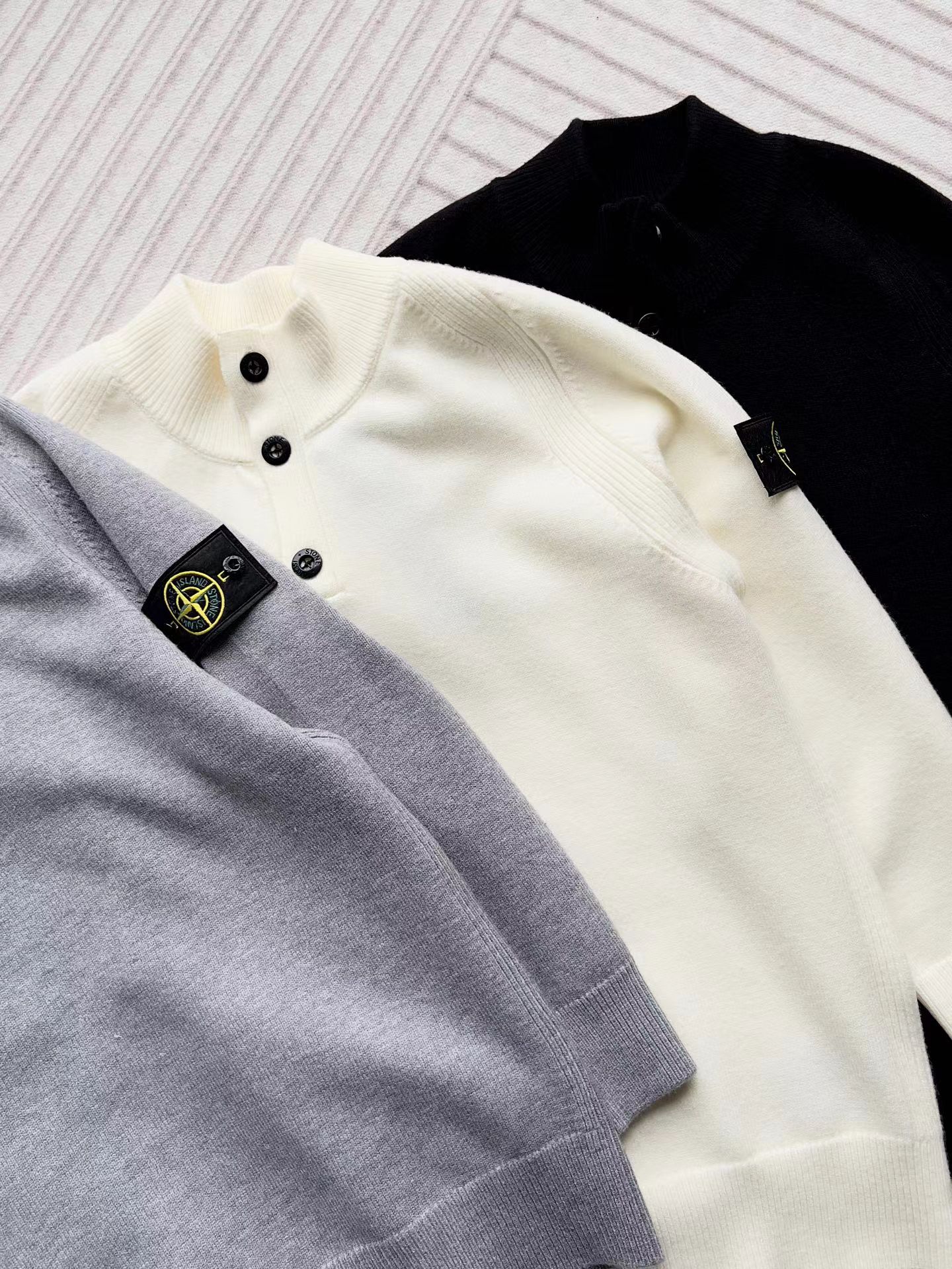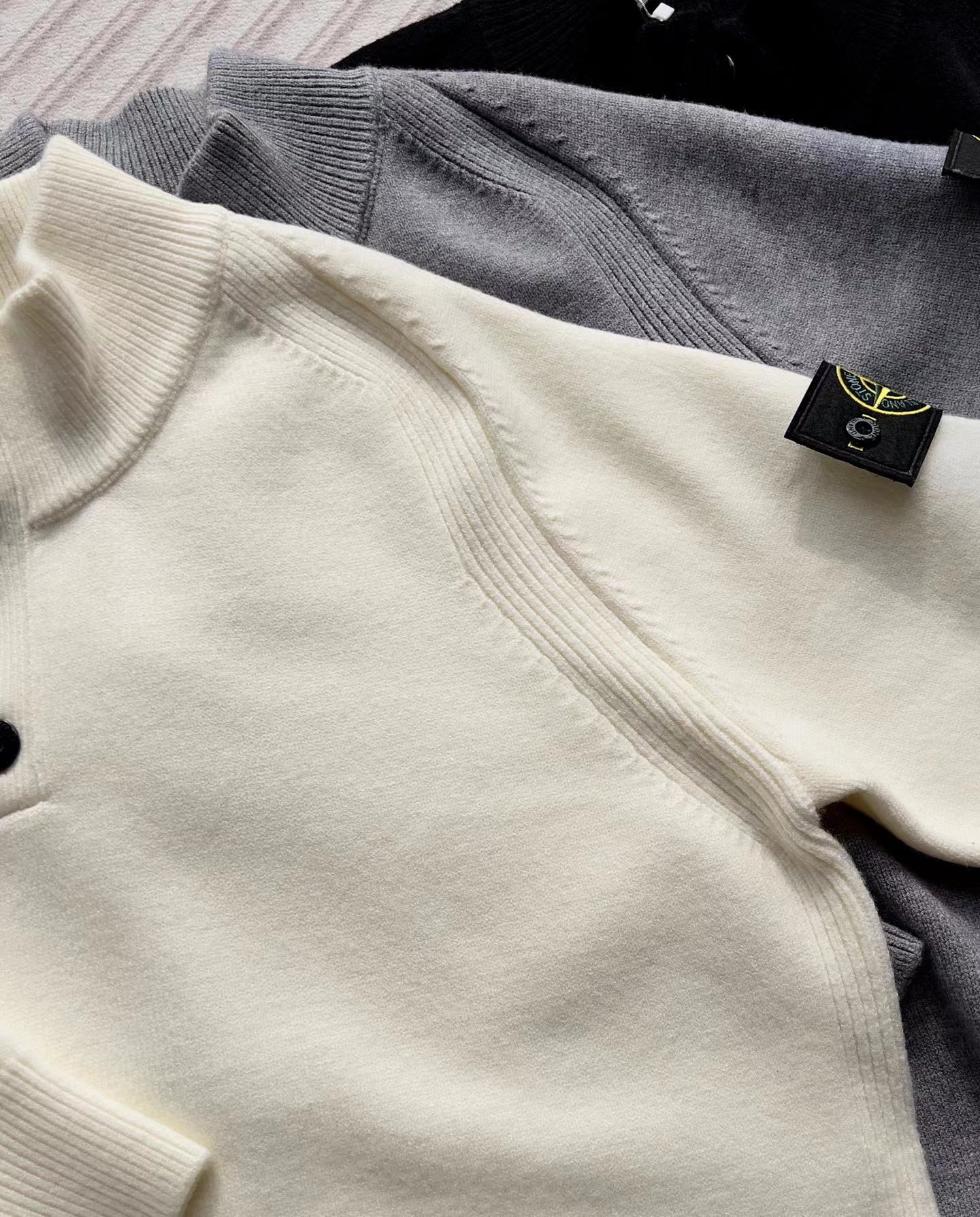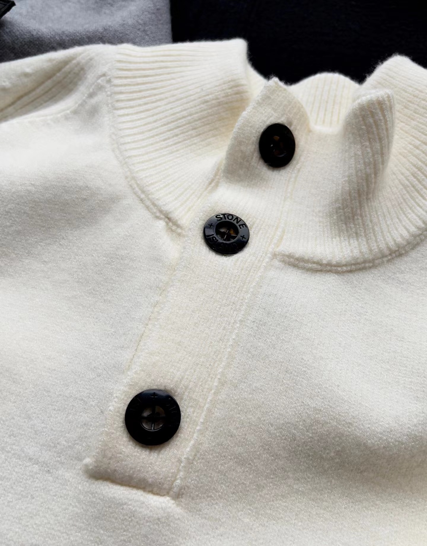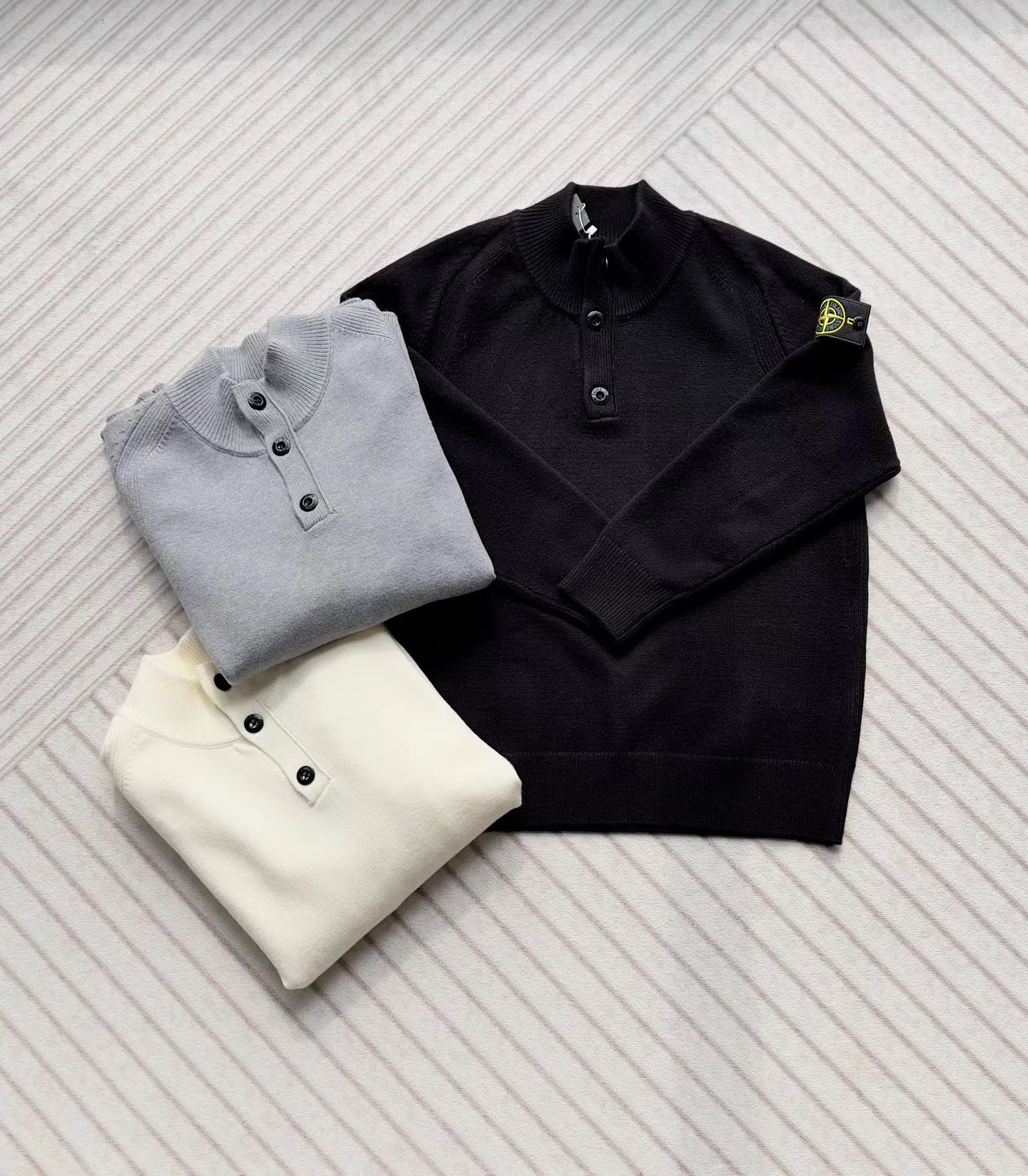 棉毛混纺半纽扣高领针织套头毛衣。高领立领半开纽扣毛衣,反丝袜针线带+凸起边接缝。棉毛混纺材质 针织结构。下摆、袖口,领口 均有螺纹边收口。袖侧标志性可拆卸罗盘绣花徽章。长袖款 平直下摆 常规版型。本产品为棉毛混纺针织衫,手感柔软舒适亲肤,面料弹性大,适合多样人群 大众身材。不挑人,非常百搭。可内穿增温保暖也可外穿套头外套。版型微宽松,男女都可驾驭。
