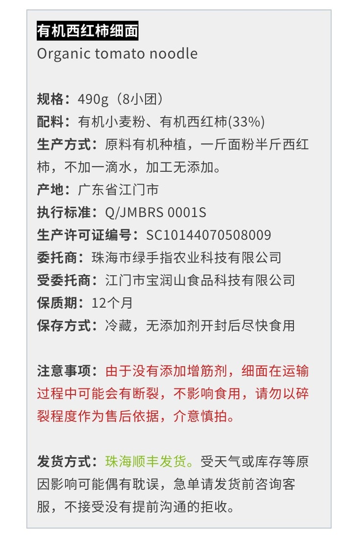 由于没有增筋剂等添加剂,面条干爽运输过程可能会有断裂,不影响食用。以上介意慎拍。
