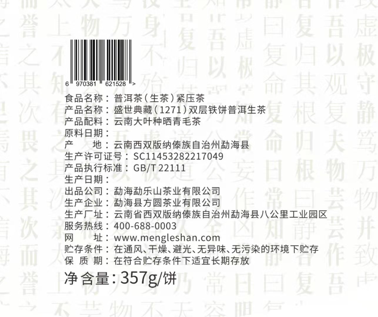 2021年盛世典藏(1271)双层铁饼生茶357g