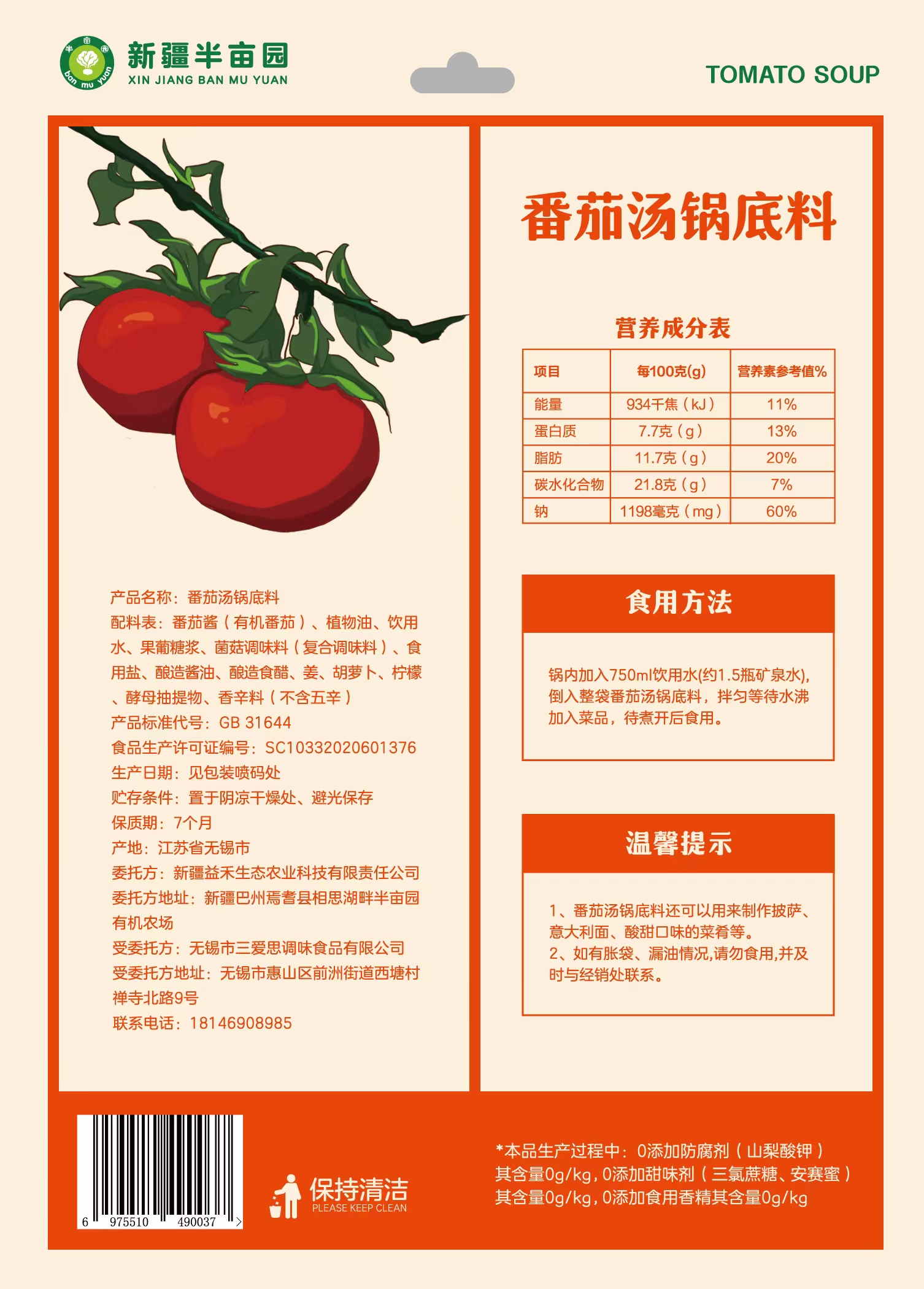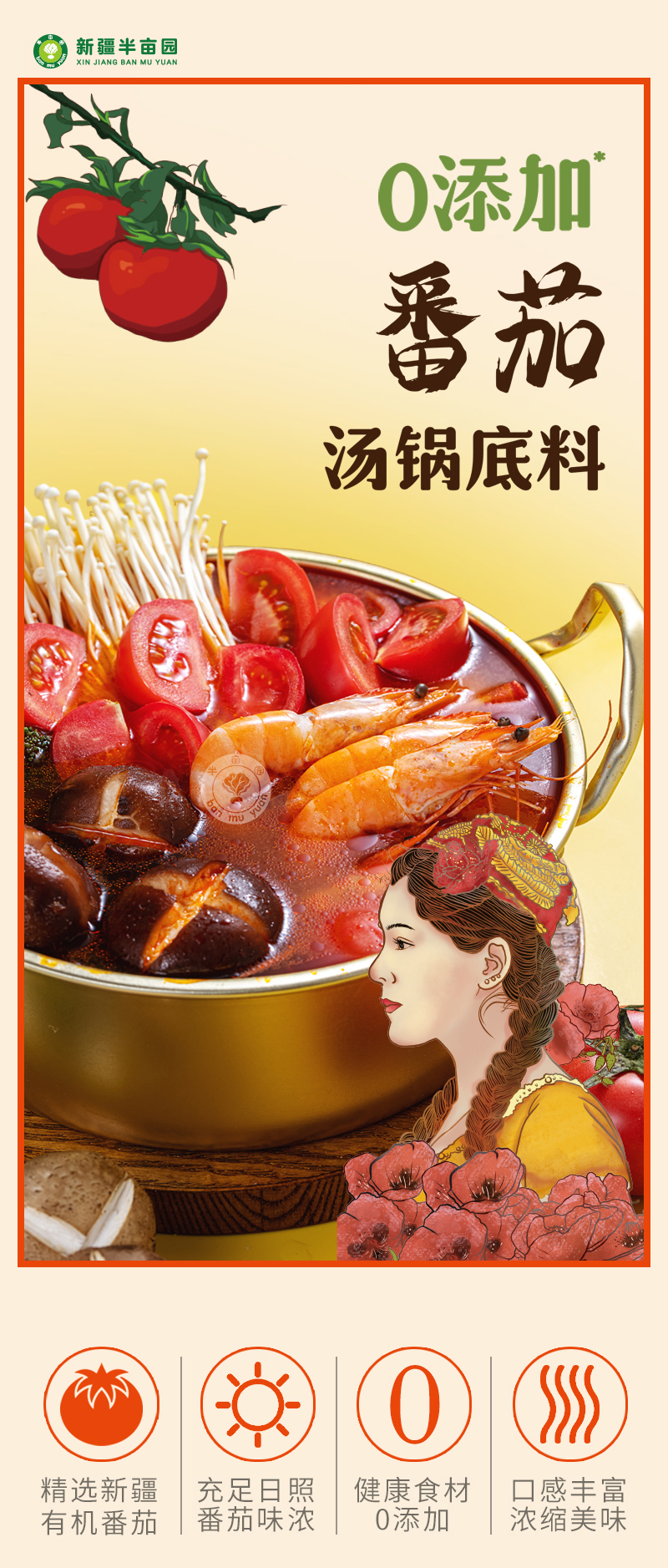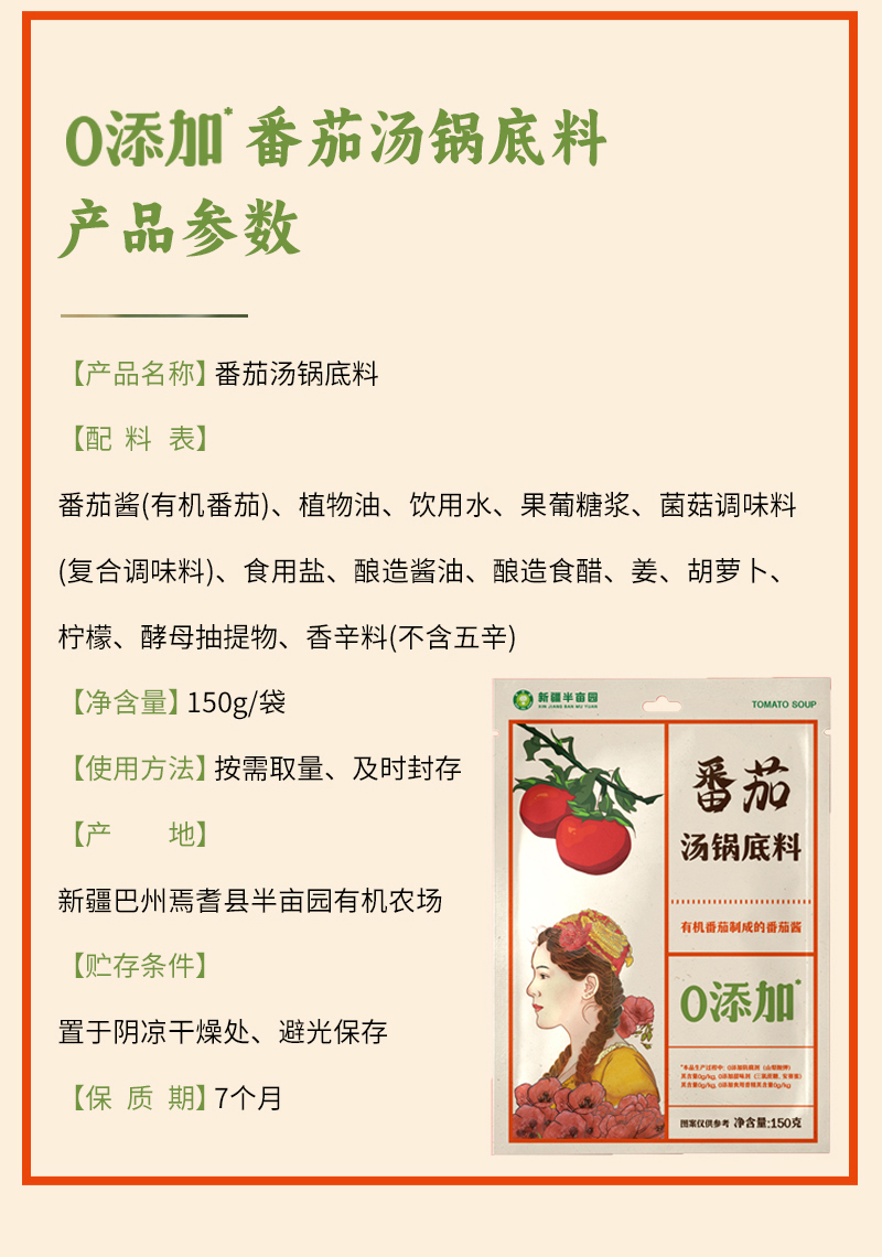 【产品名称】半亩园番茄汤锅底料150g*4袋