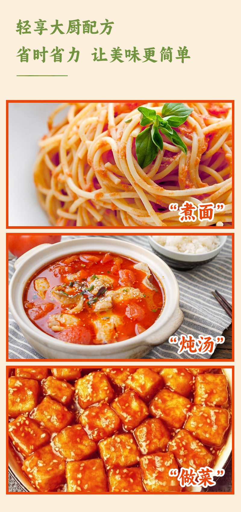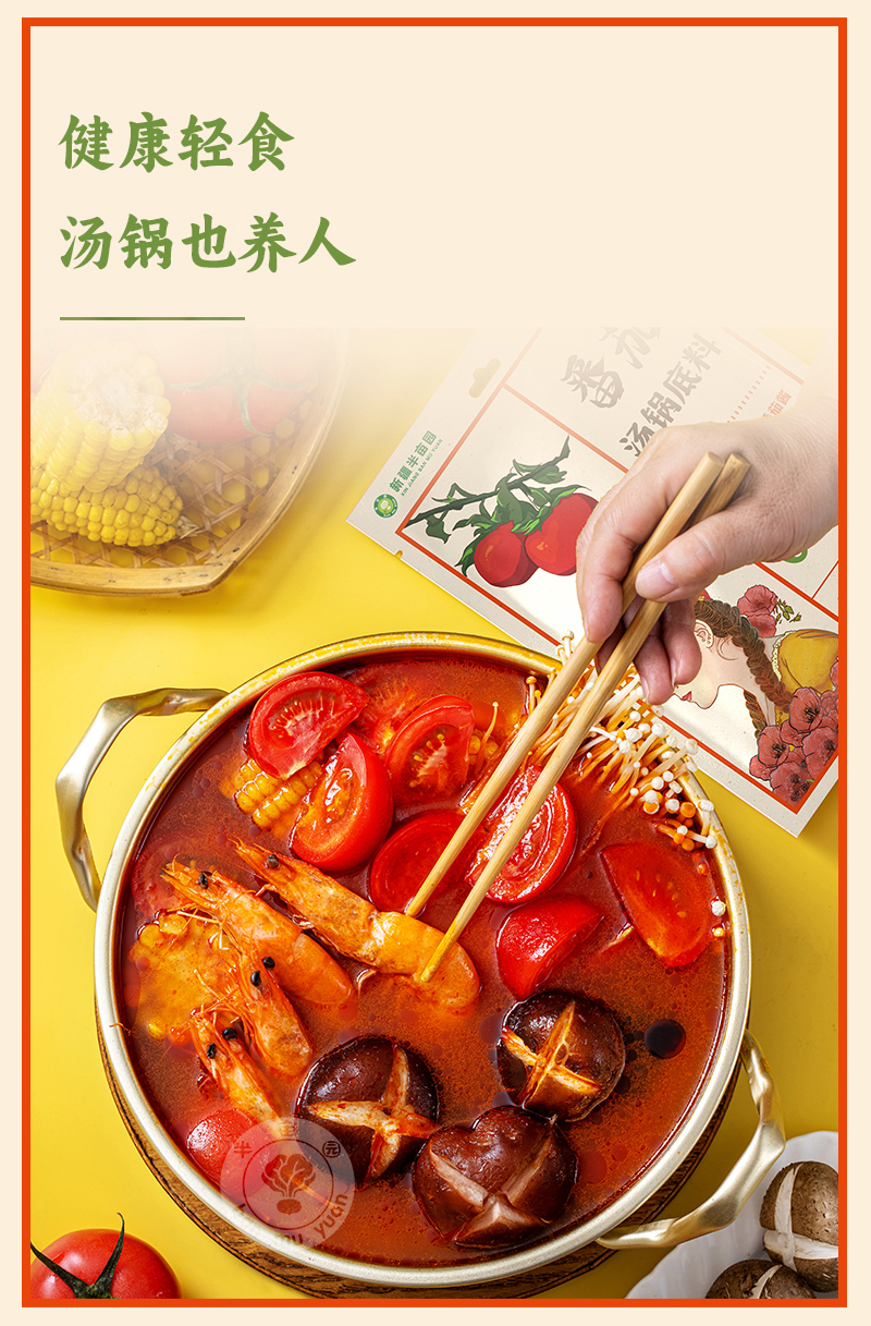 【温馨提示】1、番茄汤锅底料还可以用来制作披萨、意大利面、酸甜口味的菜肴等。