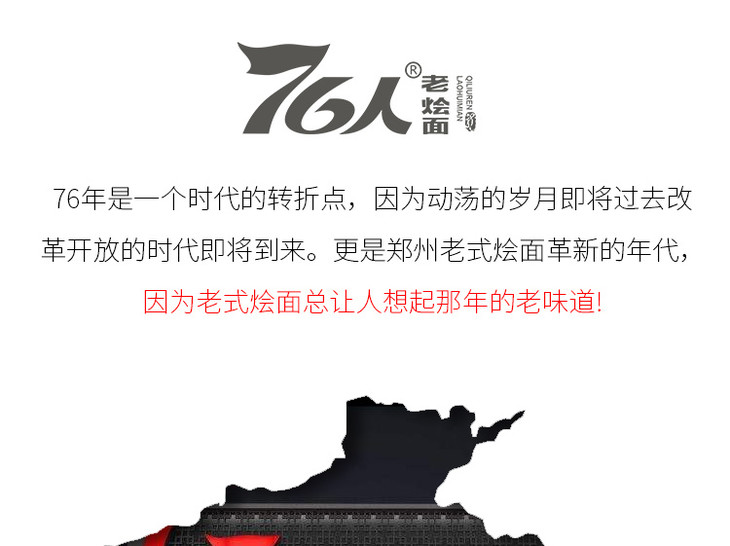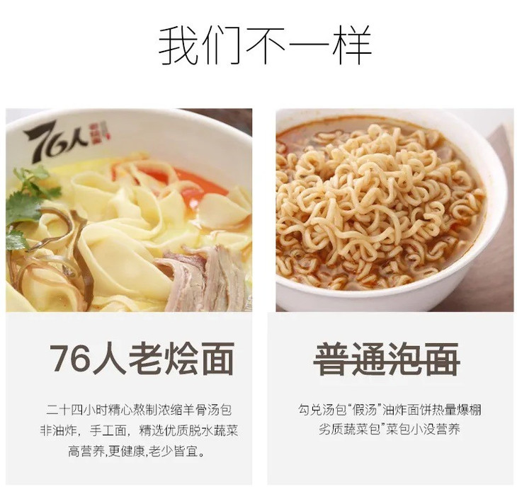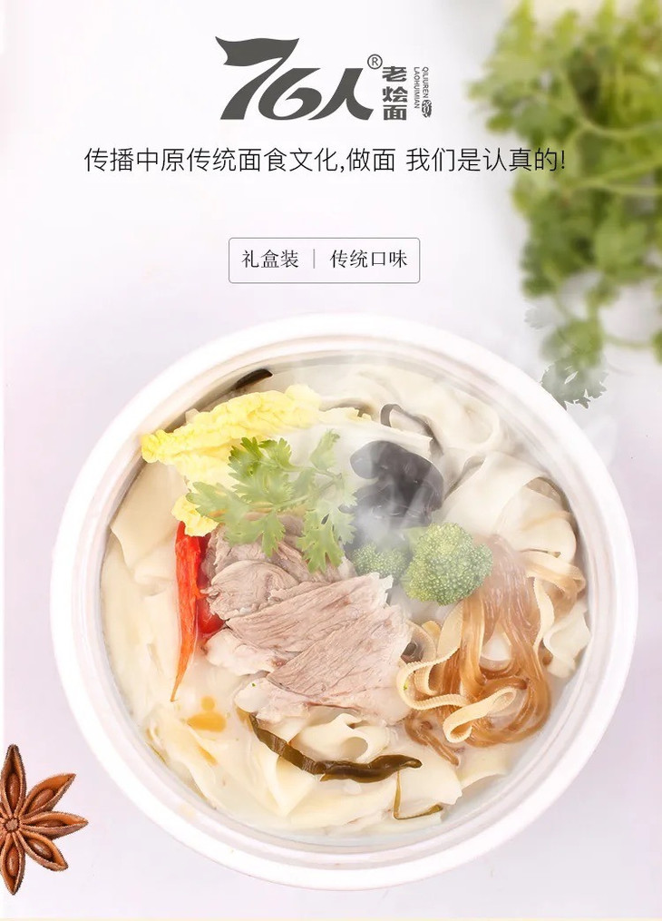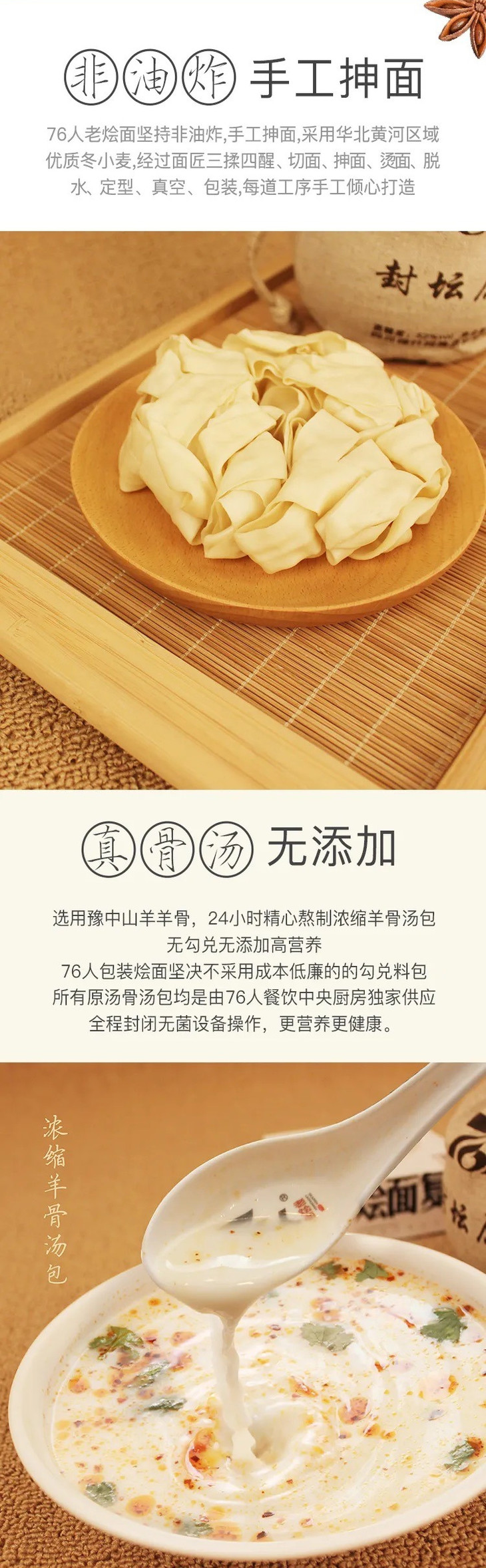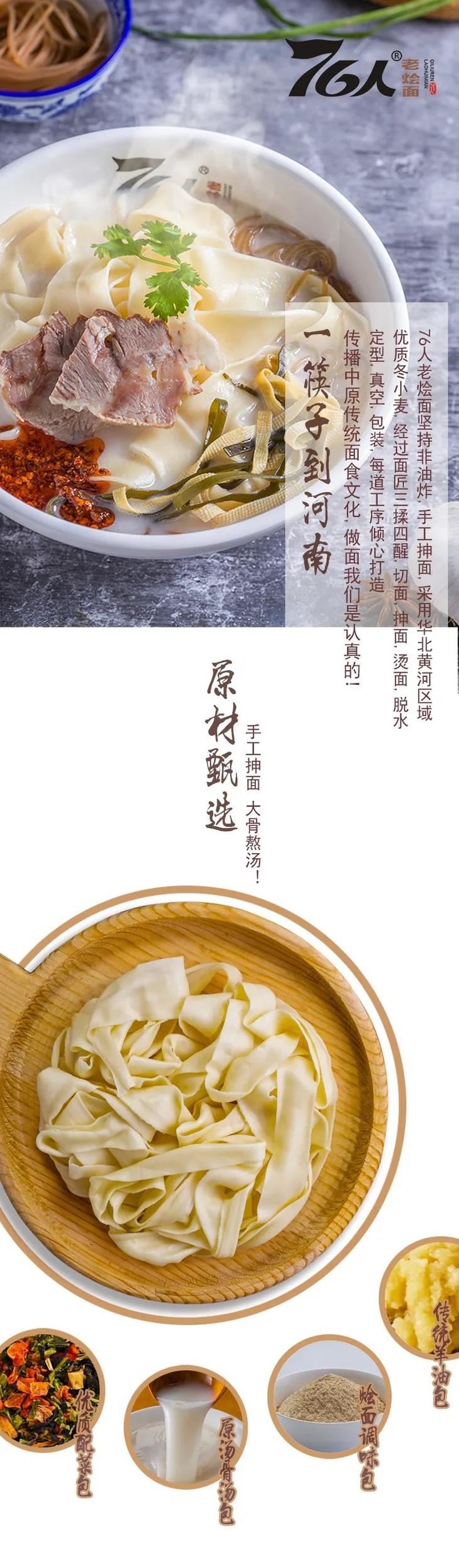 如何辨别一碗烩面是否地道?一看汤二看面!76人老烩面馆选用豫中山羊骨,24小时精心熬制,无勾兑无添加,咕咕嘟嘟,渐渐汤浓色白,香味浓郁,全程封闭无菌设备操作,再转化为浓缩调味包和汤包。而制作面面的面粉源自华北黄河流域的优质冬小麦,充足的日照,母亲河的滋养,孕育出了蛋白质含量极高的强筋麦。不同于机器制面,76人坚持手工做面,经过面匠三揉四醒,切面、抻面,这样的面浑厚劲道,非油炸,真空包装,精心做好每道工序,还原好面的味道!