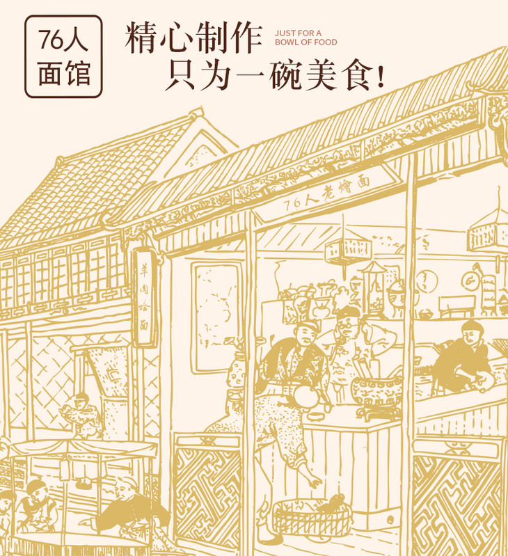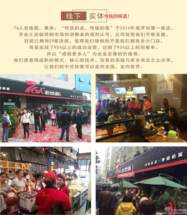 76人老烩面来自2010年成立的郑州七六人餐饮服务有限公司,从第一家店开始,9年时间,从河南、河北到法国巴黎,共开出80余家门店,日售烩面13000碗以上,年营业额超亿元。2016年为实现“让十三亿人吃上地道河南老烩面”的目标,76人老烩面在原阳购置30亩地,投资4000多万,建设18000平米现代化中央厨房,并获得国家SC认证,日生产羊肉汤8吨,是一家以烩面原材料生产与配送为一体的烩面生产基地。