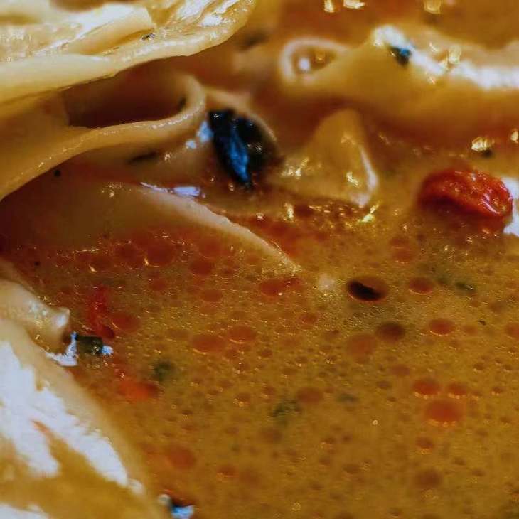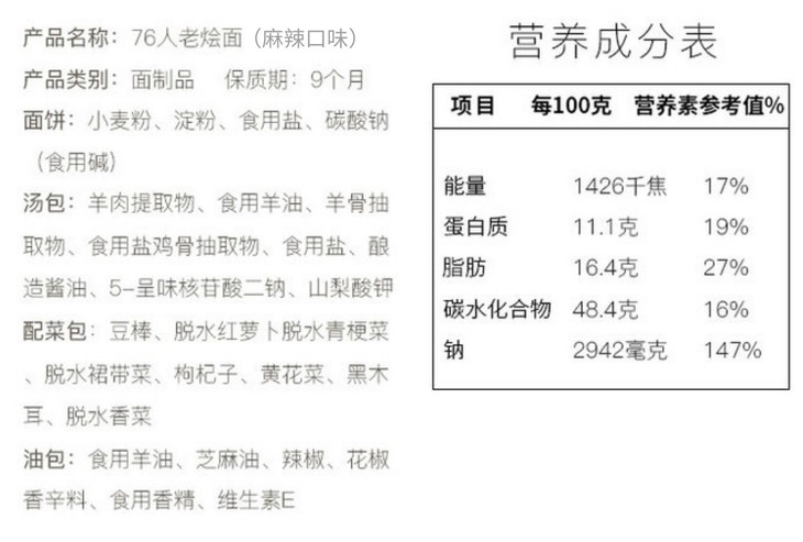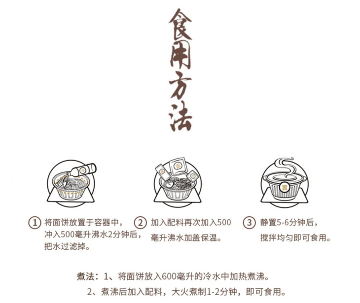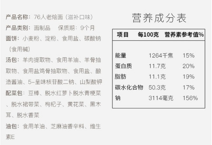 76人的老烩面有原汤和辣味两种,可以煮,也可以泡。煮就直接一起扔锅里,都熟了就行,泡的话,要把面饼放进碗里,先用开水把面饼泡2分钟,然后把水倒掉后,再把骨汤包、调料包和配菜包等放入,再加开水,盖上盖子焖5分钟,一碗烩面也就做好啦!浸了羊肉汤的宽厚烩面挂着浓浓的汤汁,入口爽滑,羊汤鲜美,边吃面边喝汤,那叫一个大快朵颐,太正宗了!吃不了辣的选滋补,麻辣还是蛮刺激的,我不太行。。。量很大,管饱!