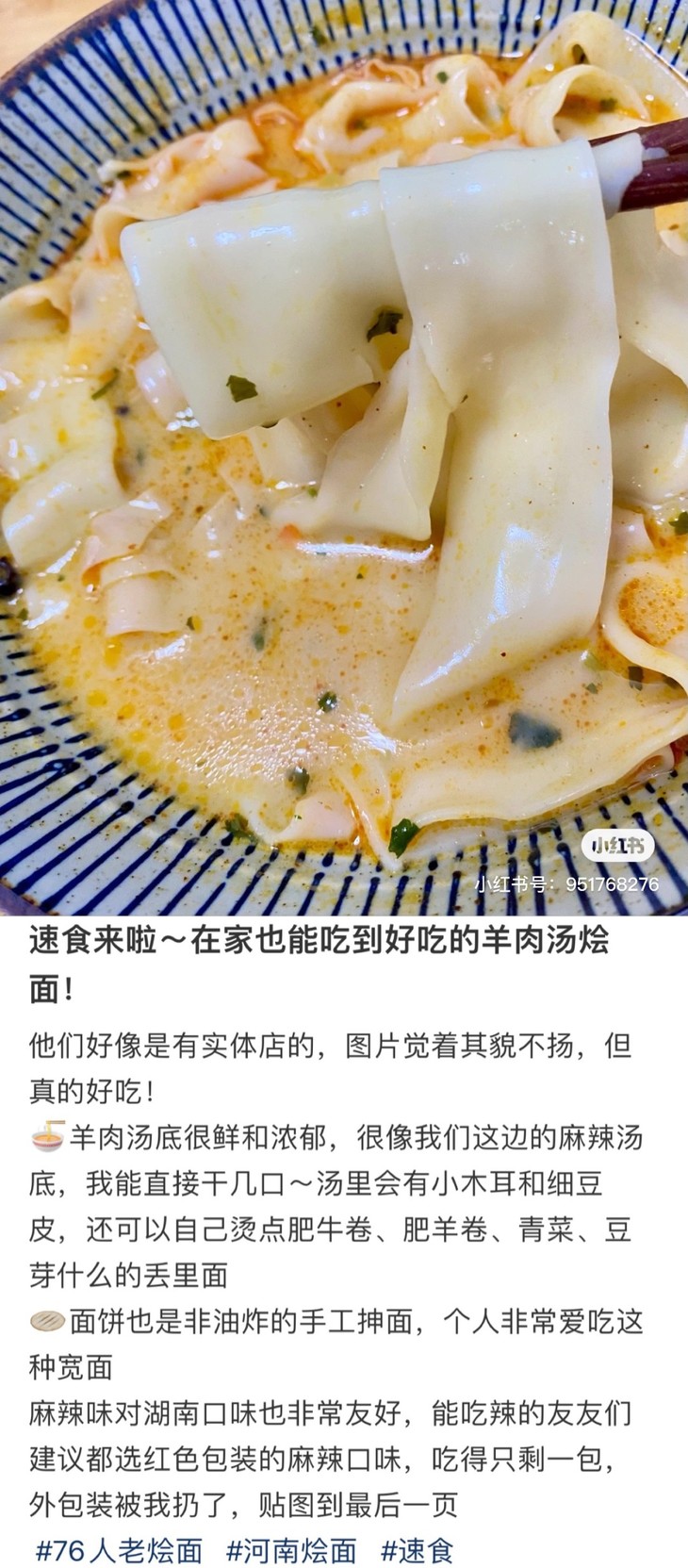 好吃又快手的新面面,又来咯!这次是地道的河南风味,来自76人的老烩面,是那种宽宽的很有嚼劲的面条,再配上浓香的羊肉汤,超棒!不过也要提醒下,羊味是真的很重的,因为汤都是用羊骨熬的,非常浓郁,不好这一口的,要慎重!