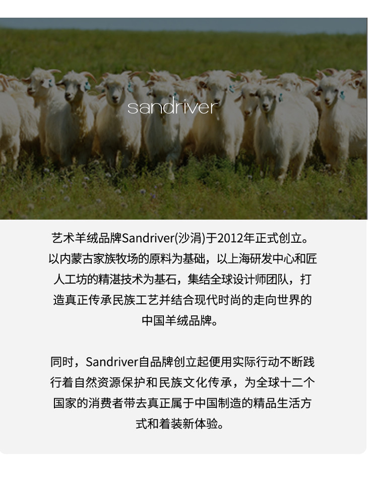 历年在巴黎时装周亮相,享誉世界的艺术羊绒品牌[Sandriver 沙涓]由羊绒布道者郭秀玲女士创立。阿拉善自有牧场纯种羔羊绒,日本国宝设计师小筱顺子,上海自有基地精工细作。承载羊绒情怀,坚持匠人品质。