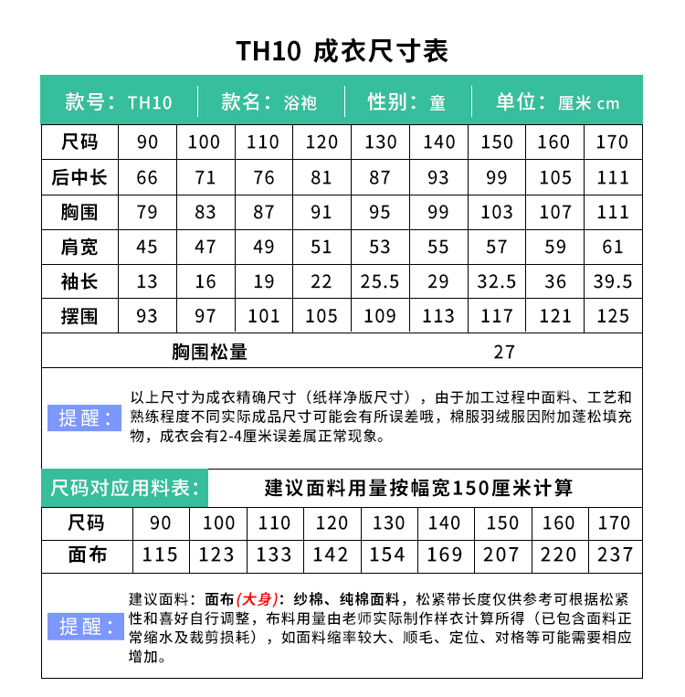裁缝学苑TH10浴巾浴袍纸样儿童长袖纱布睡衣童装家居服睡袍样板