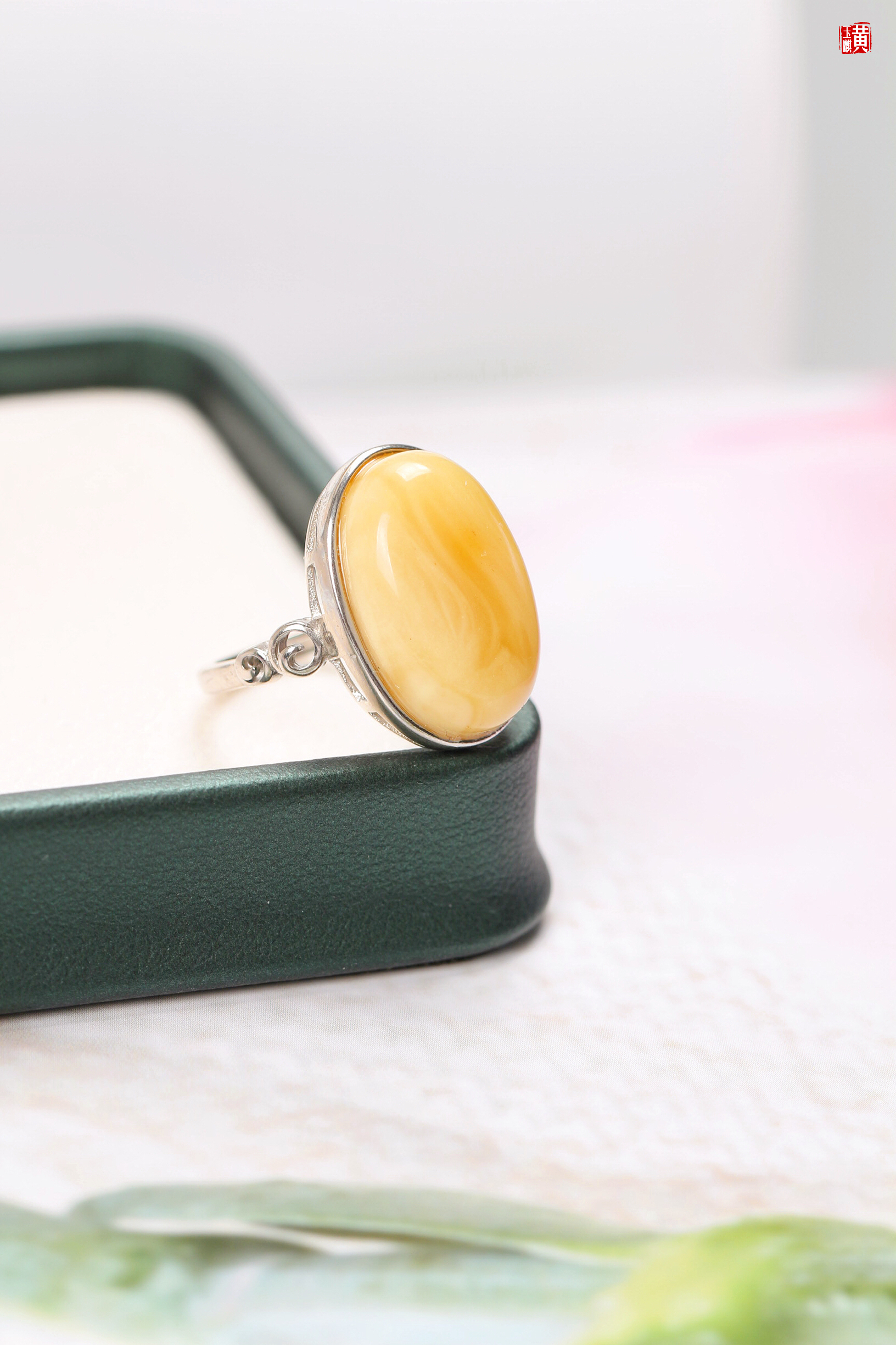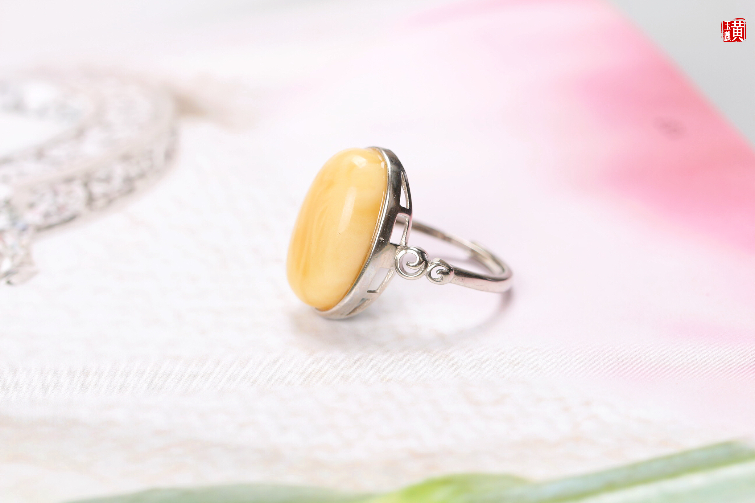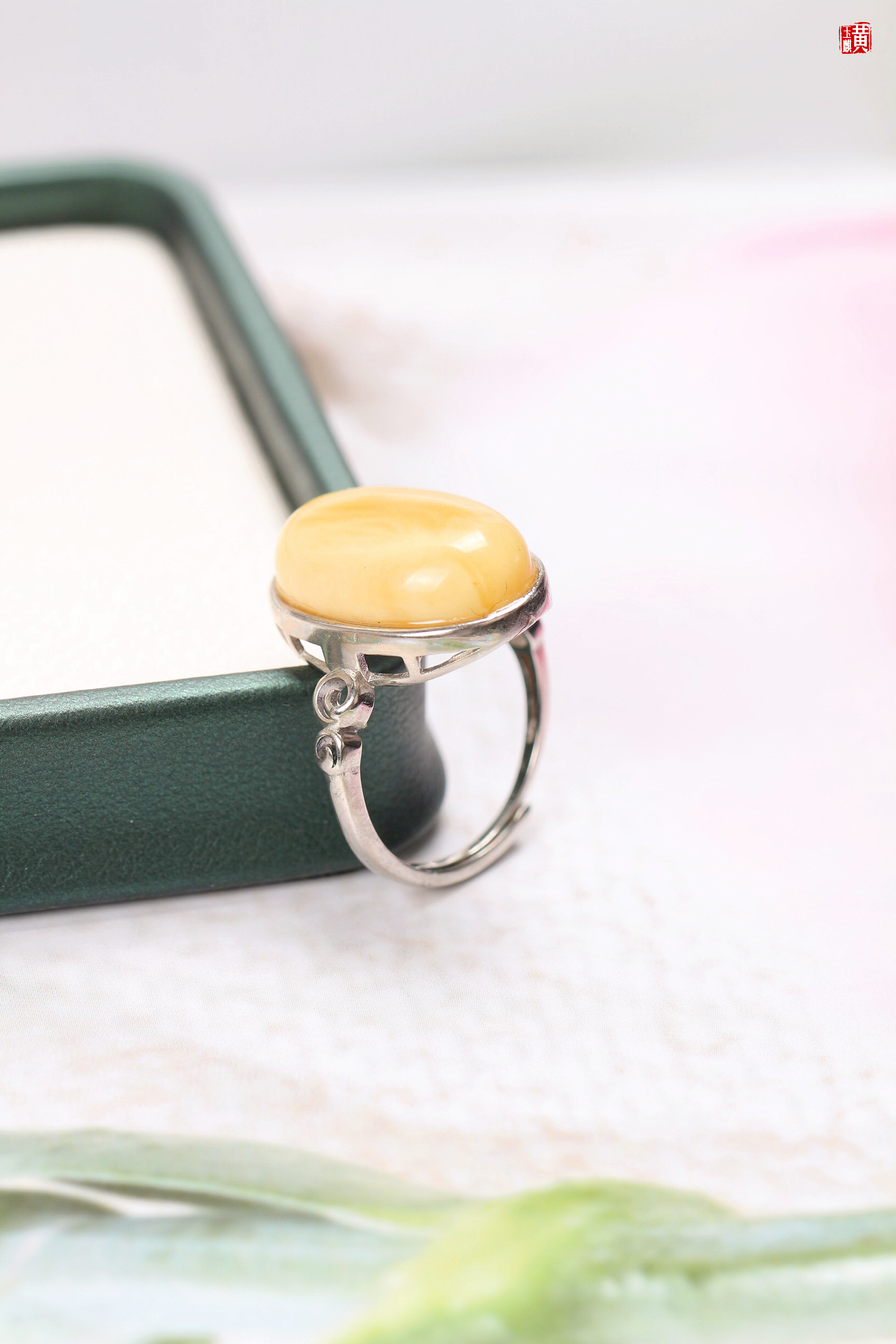 蜜蜡白花蜜戒指,蛋面饱满,白色和黄色缱绻交融,温婉柔和,925银镶,简约百搭,上手高贵优雅。