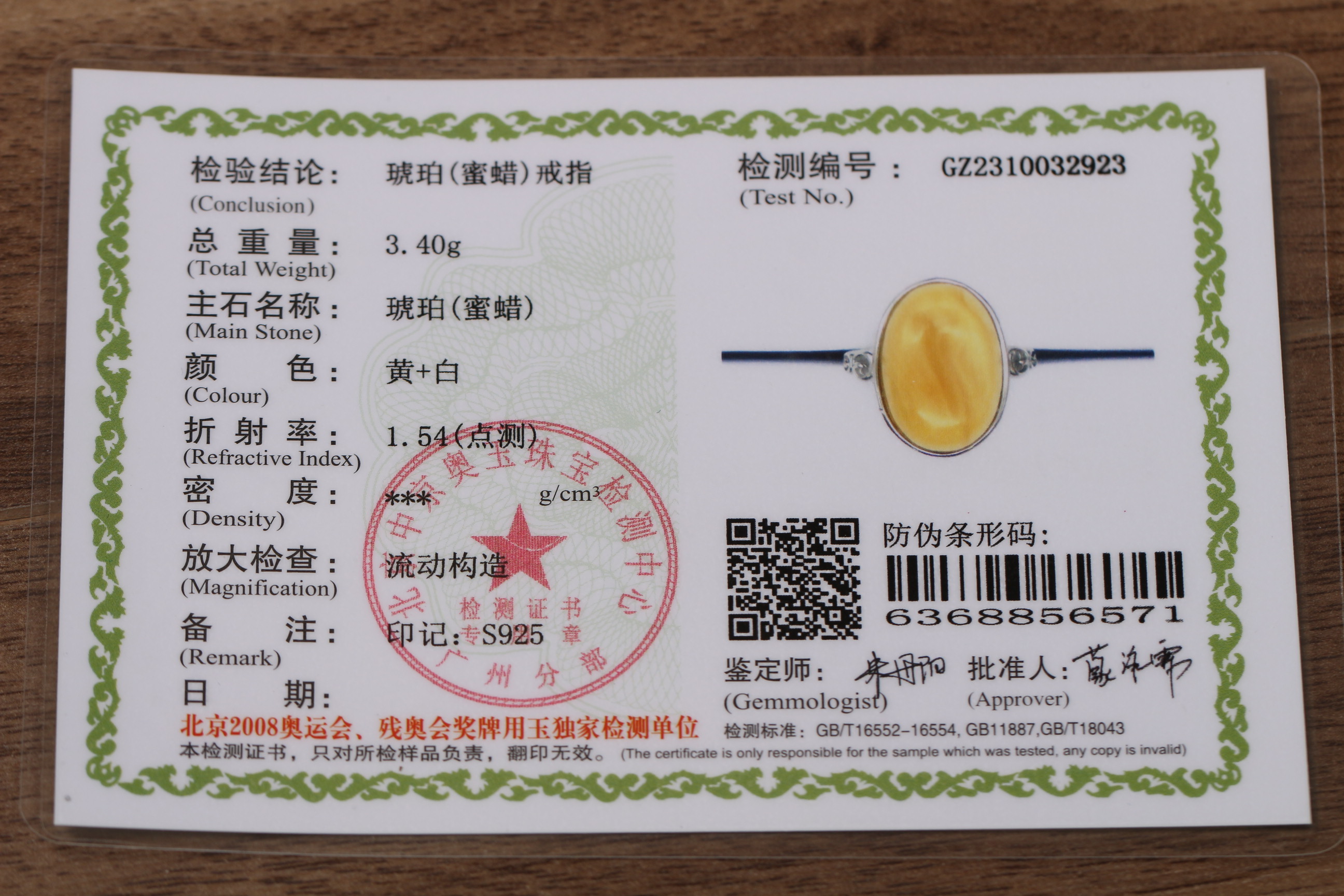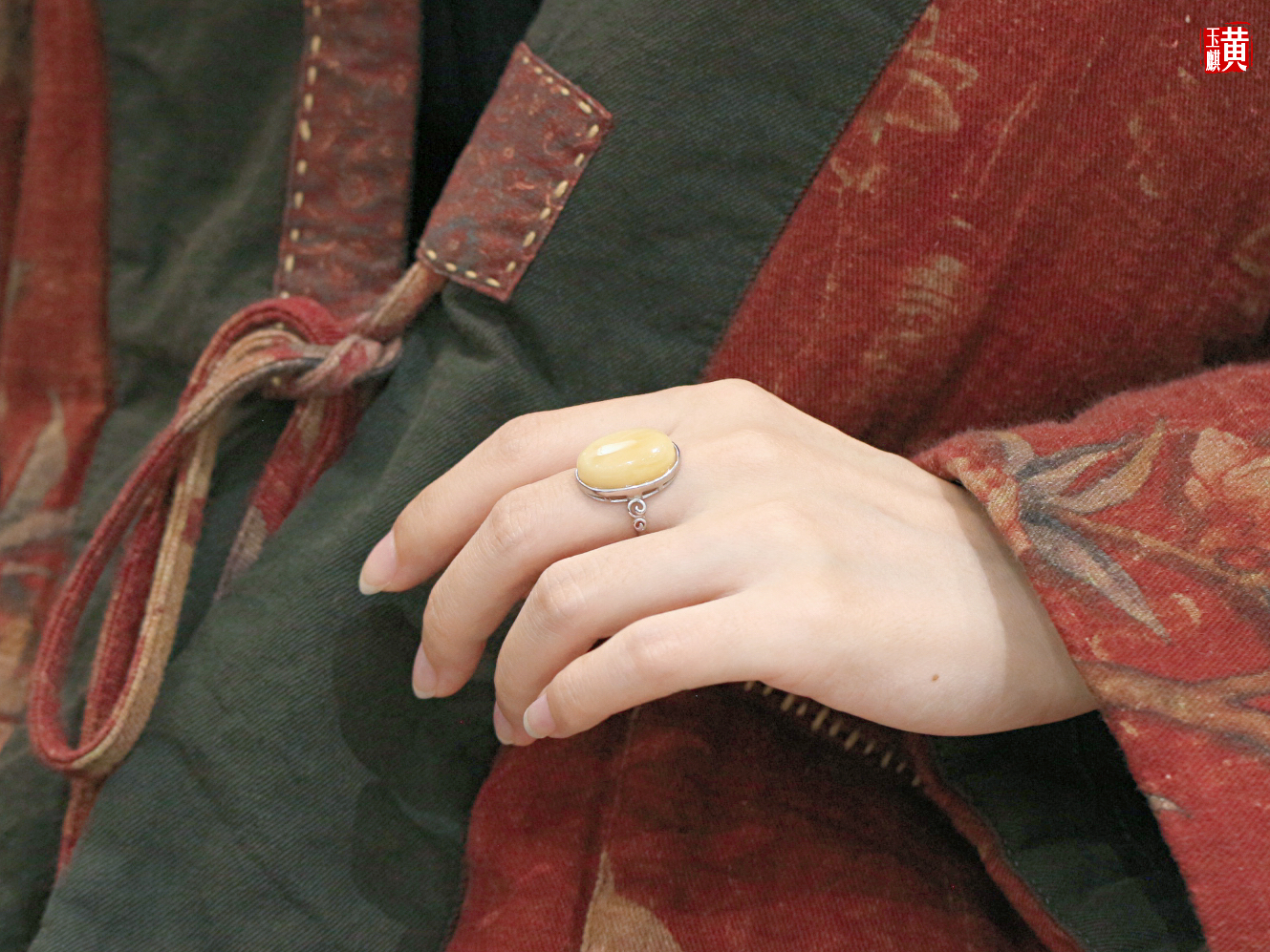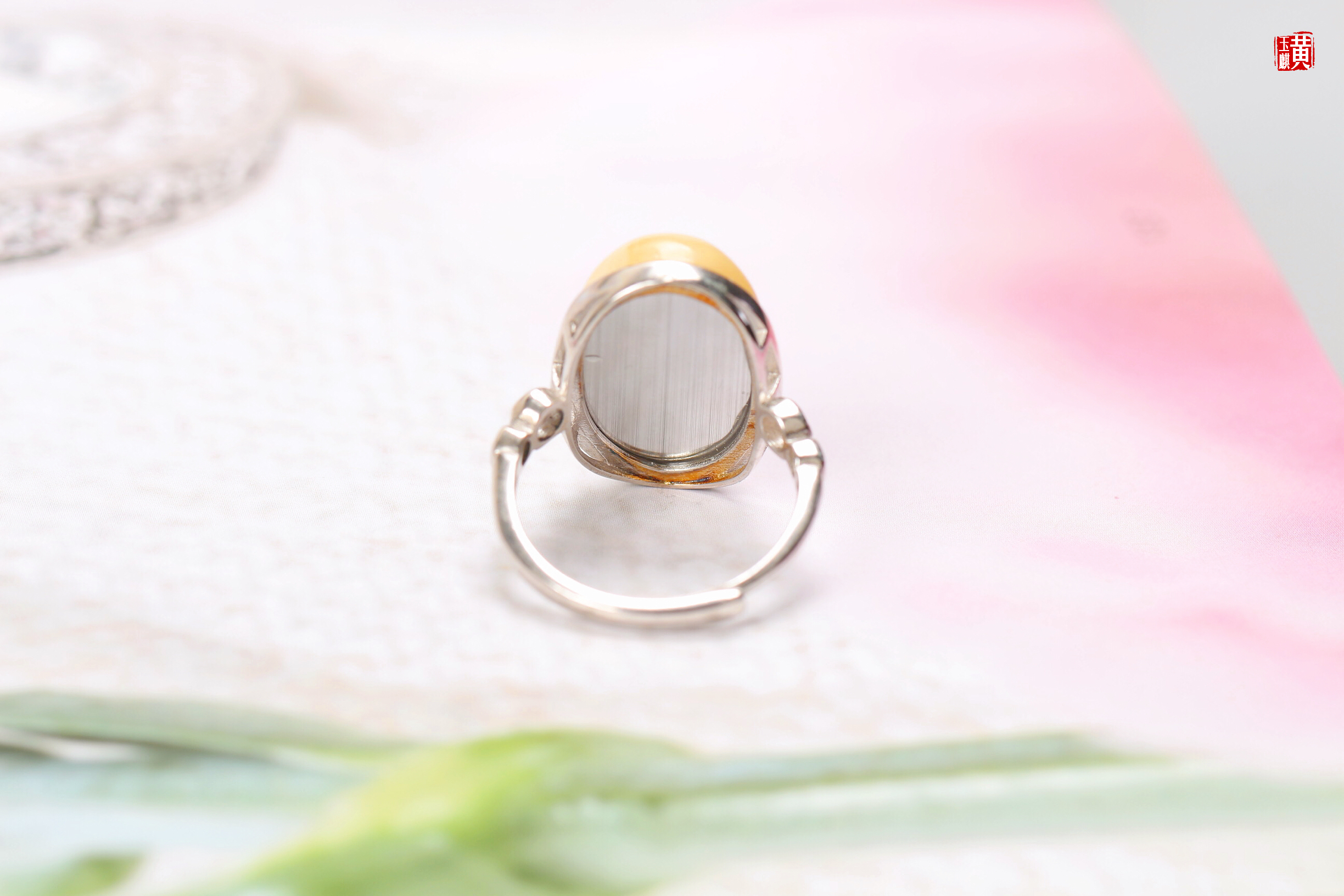 蜜蜡白花蜜戒指,蛋面饱满,白色和黄色缱绻交融,温婉柔和,925银镶,简约百搭,上手高贵优雅。