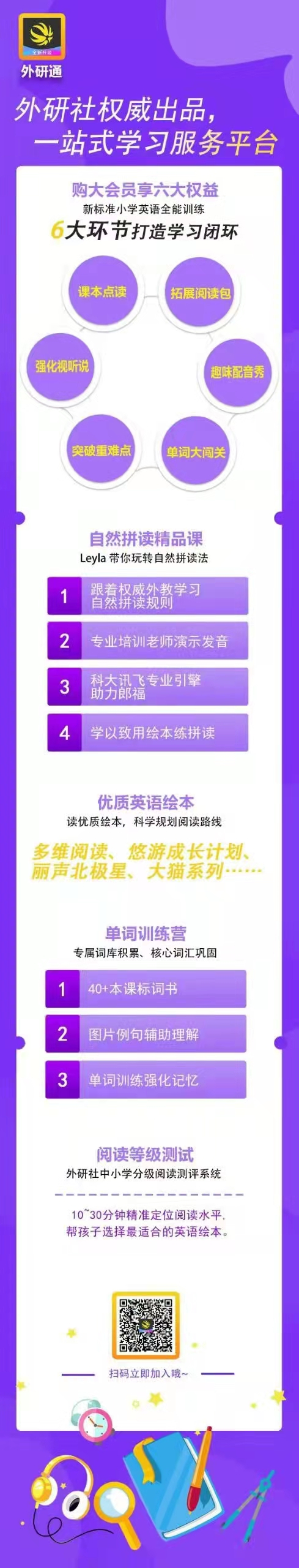 - 即刻加入外研通VIP,全场教材、绘本随意读;教学动画、名师微课、单词学习等专享资源随时看