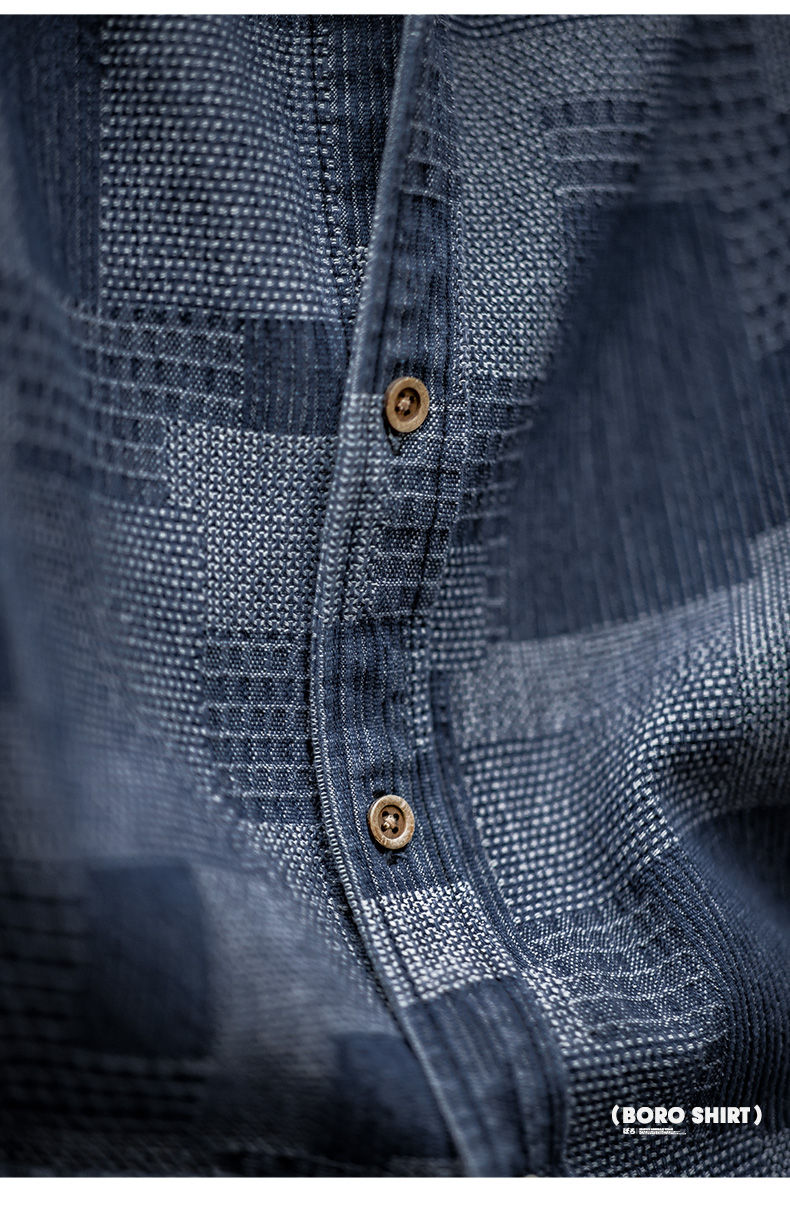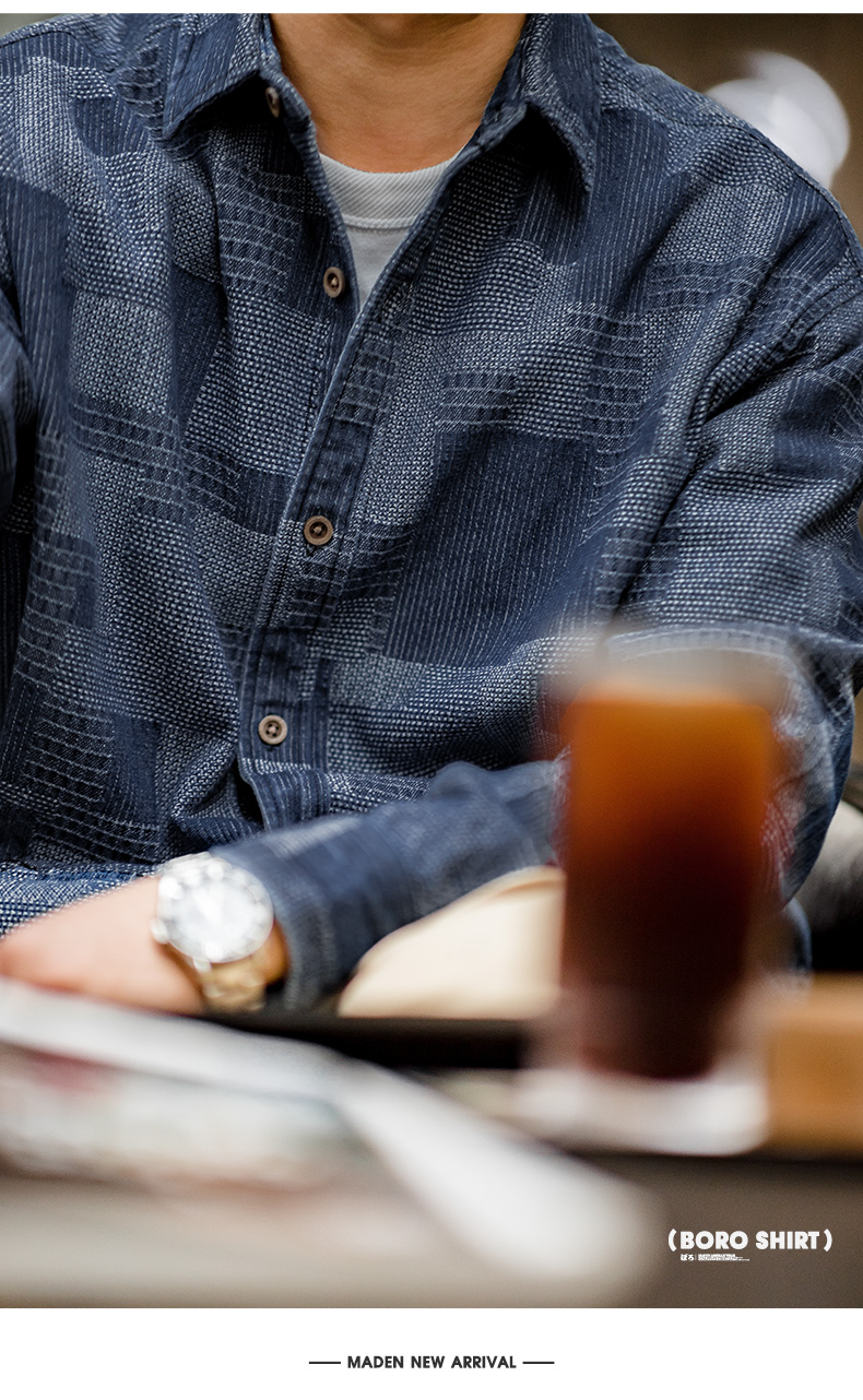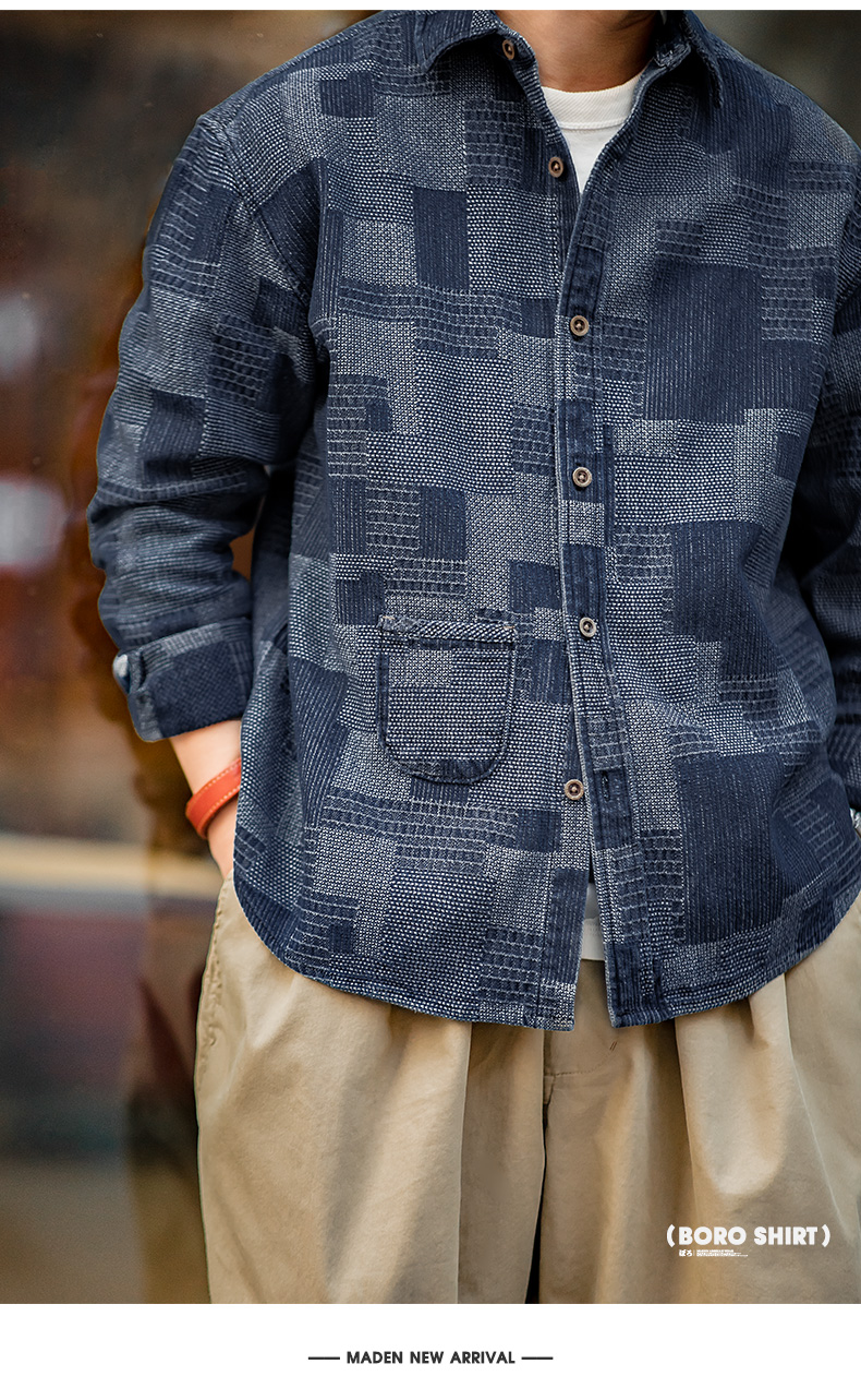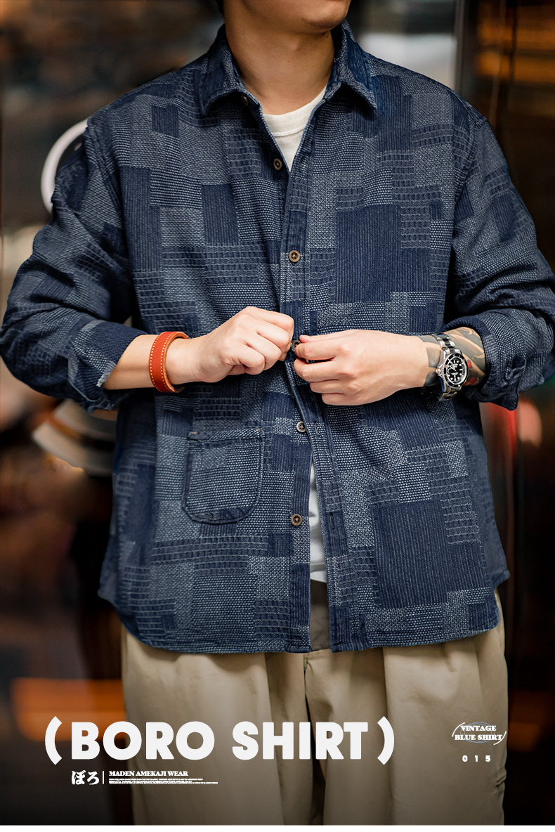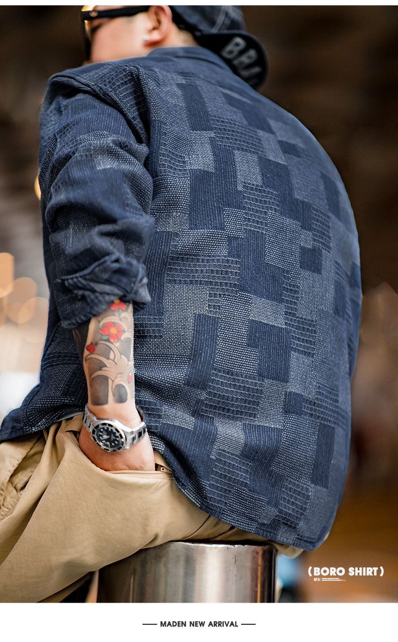 马登工装 日系复古boro蓝染拼接丹宁衬衫百家布牛仔长袖衬衣男春