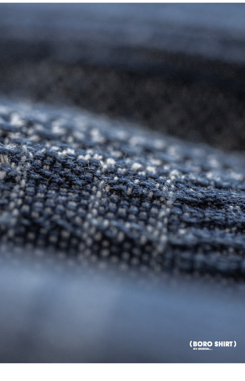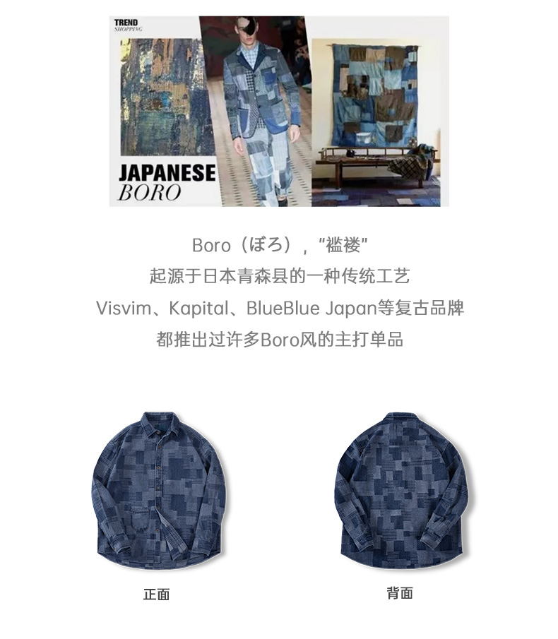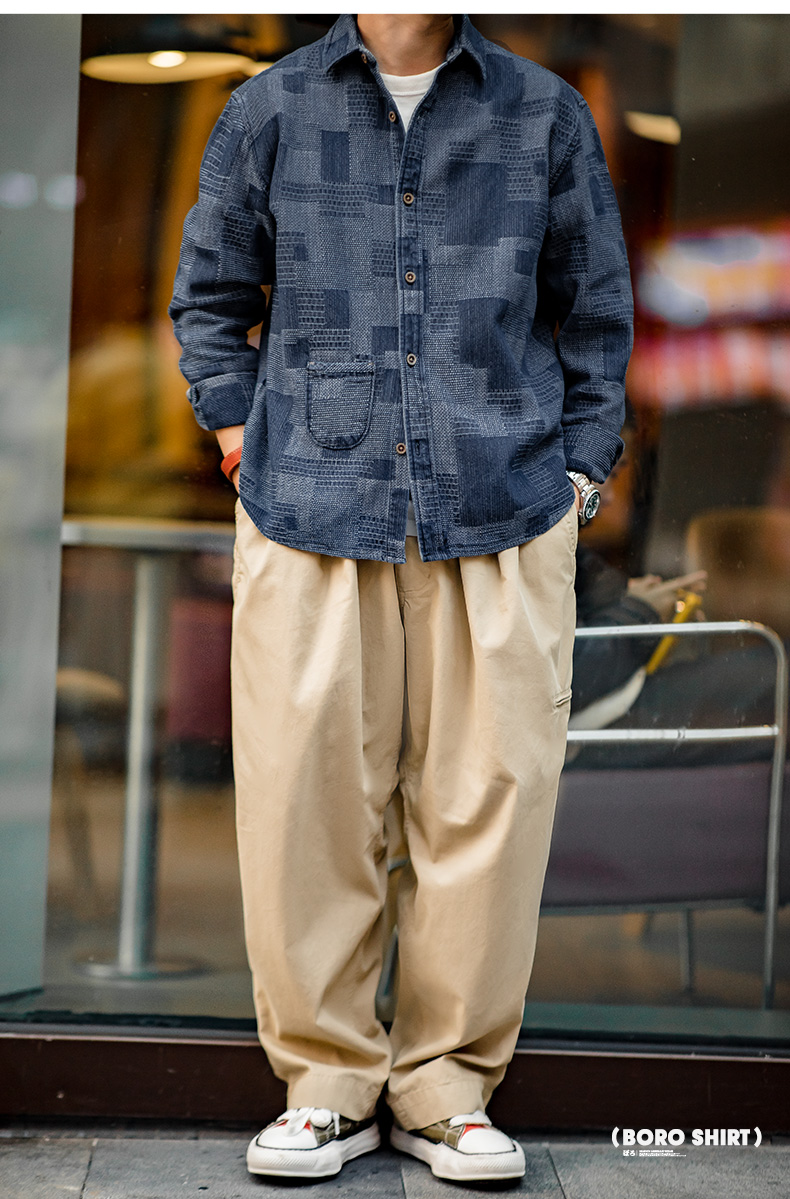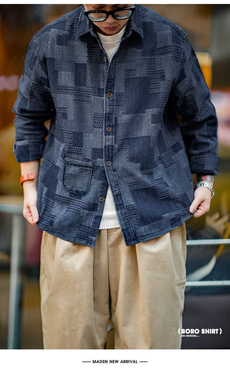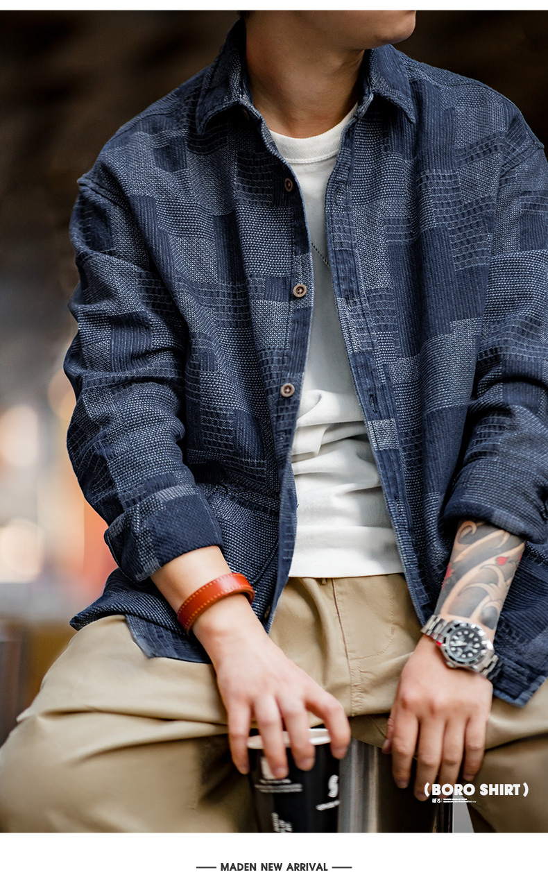 马登工装 日系复古boro蓝染拼接丹宁衬衫百家布牛仔长袖衬衣男春
