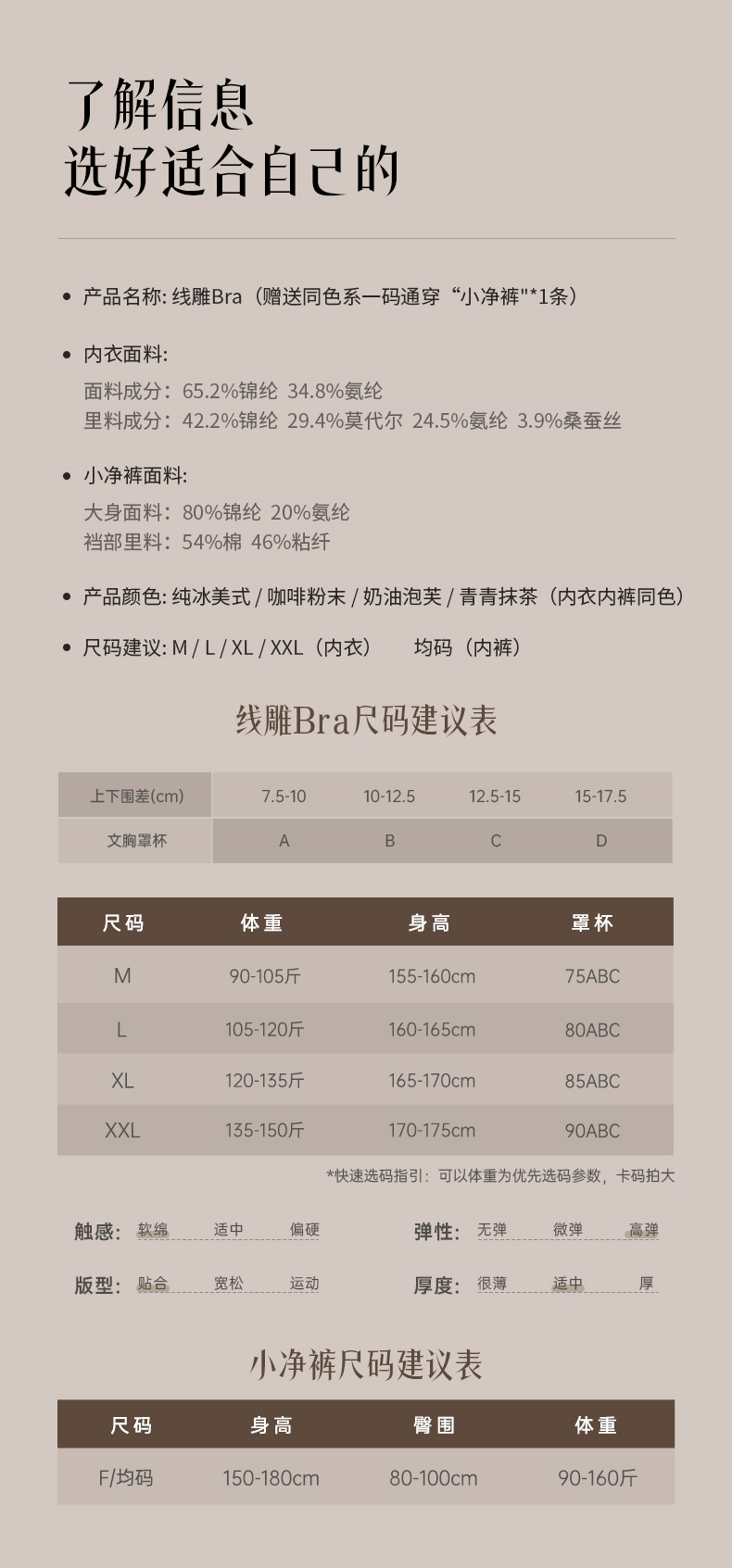 【名称】线雕Bra(赠送同色系一码通穿“小净裤"*1条)