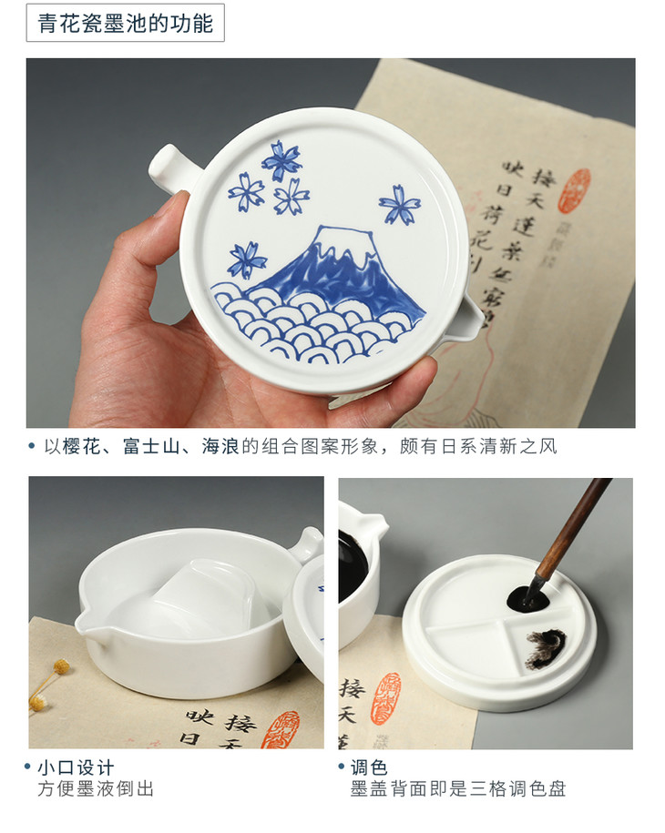 青花墨池丨多功能砚台带盖 青花陶瓷简约墨海 学生实用文房四宝墨池带盖