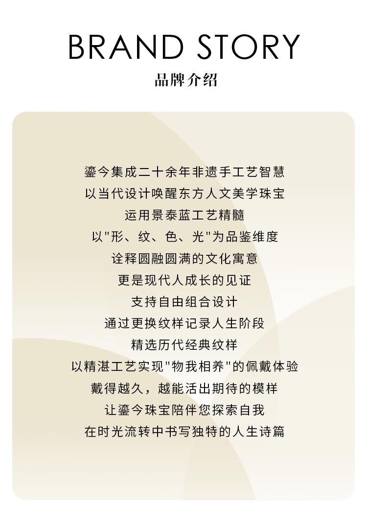 东方美学珠宝品牌,以非遗景泰蓝工艺精髓打造精工珠宝,以鎏今珠串联文明智慧,陪伴每一位朋友成长,绽放美与自由的生命力。