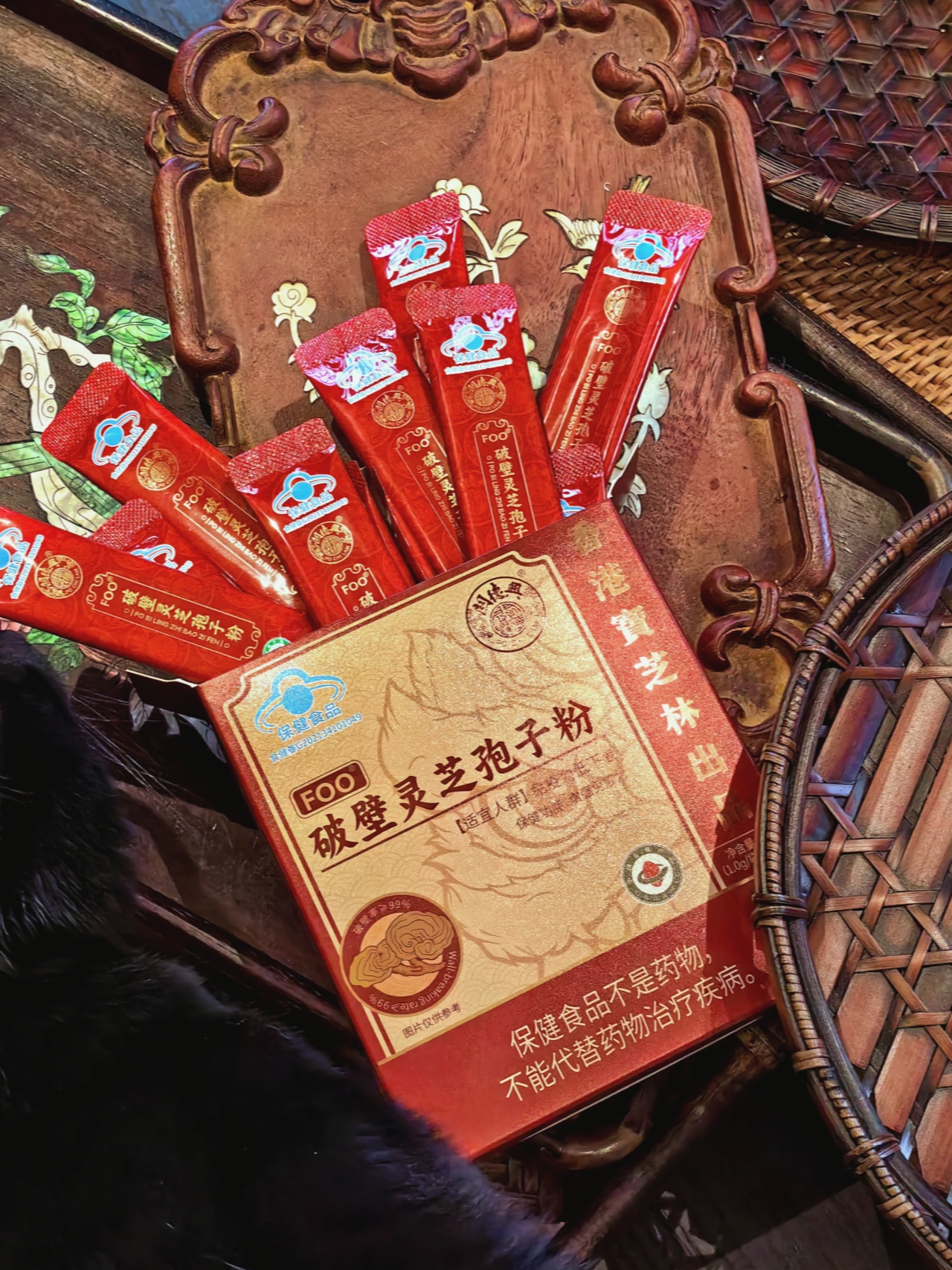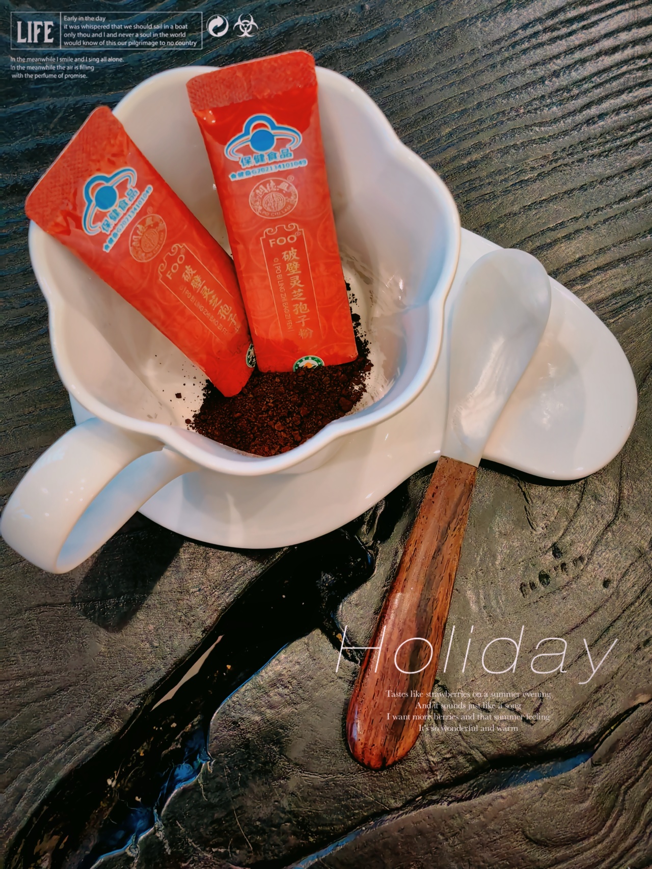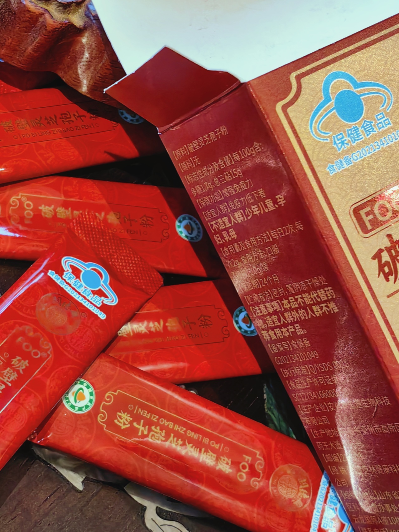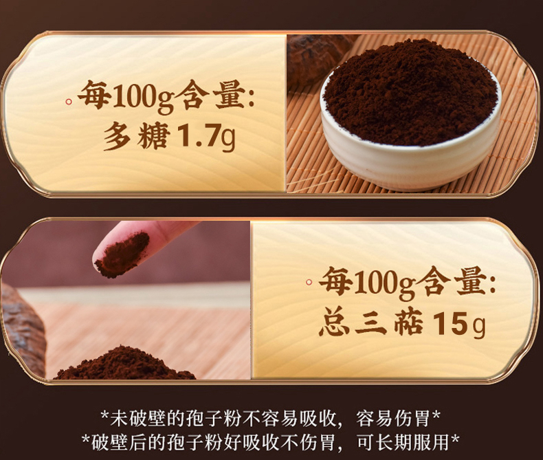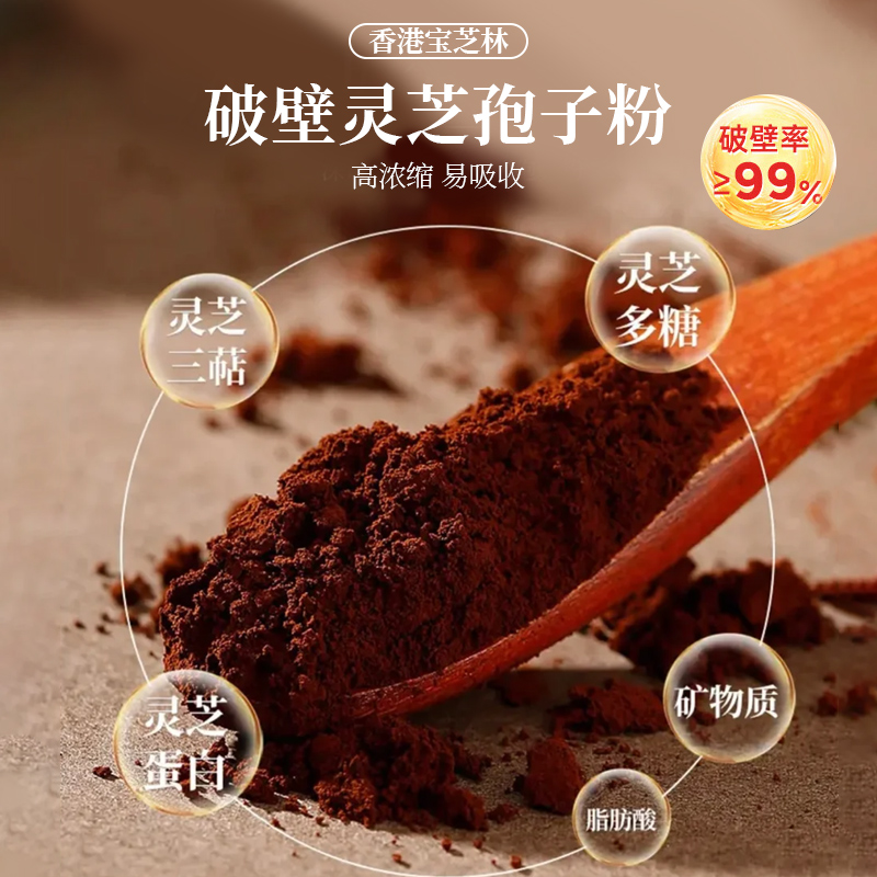 宝芝林孢子粉都是小袋便捷装,而且是双层铝箔设计,不易氧化,牢牢锁住营养!孢子粉是一种深褐色粉末,摸起来光滑无杂质,闻着菌香味十足。直接干吃,口感像可可粉一样丝滑,还蛮香的!秋冬也可以用温开水冲泡,注意水温不要太高哦,会破坏营养,淡淡的菌味不难喝,当然也没多好喝啦!要搞点花样的话,做成酸奶碗,用来煲汤也很不错,全家都能补补!灵芝孢子粉含有三萜类、多糖类、蛋白质、酶类、硒元素等,是实打实的“加油站”,日常食补太太太适合了!建议每日2次,每次2g,也就是2条哦!