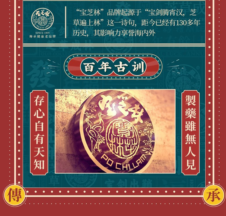香港宝芝林是黄飞鸿先生于1895年创办的医馆,直到现在已经有一百二十多年历史了,也是民族品牌之一。创始人黄飞鸿先生给医馆留下祖训,“制药虽无人见,存心自有人知。”宝芝林继任者严格按照祖训研制产品,使宝芝林屹立百年不倒。