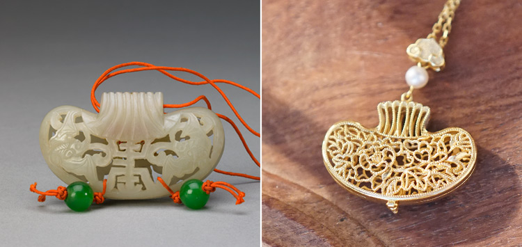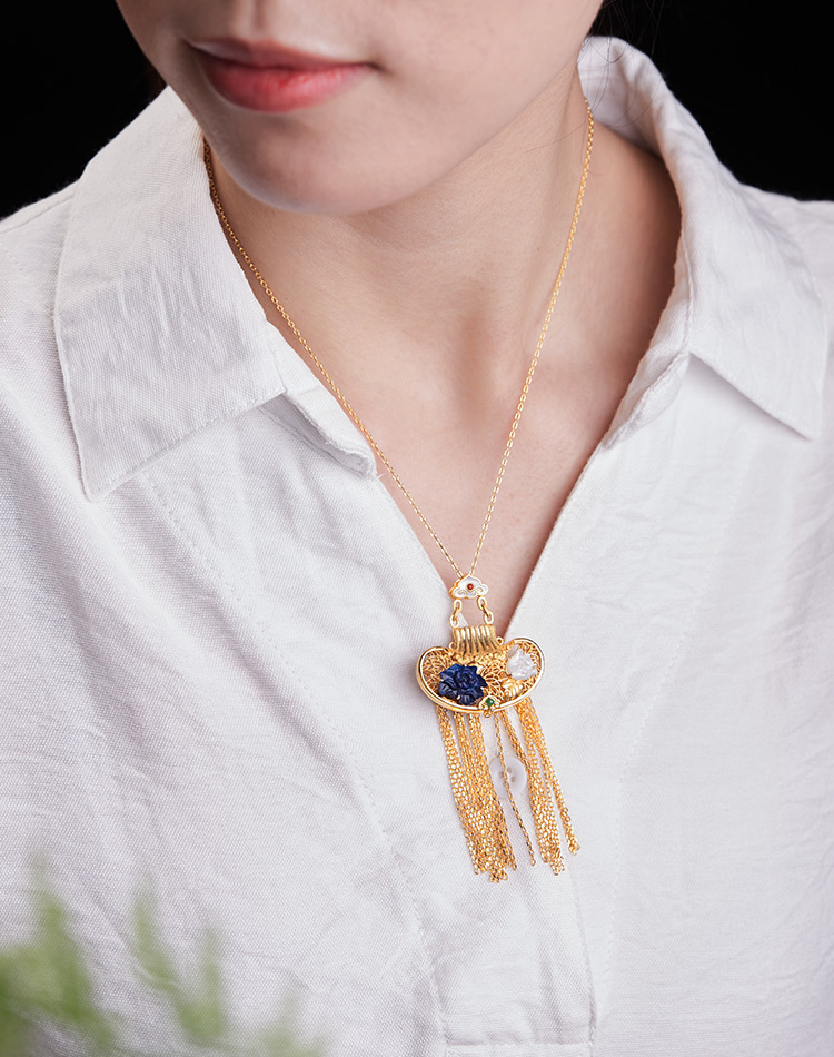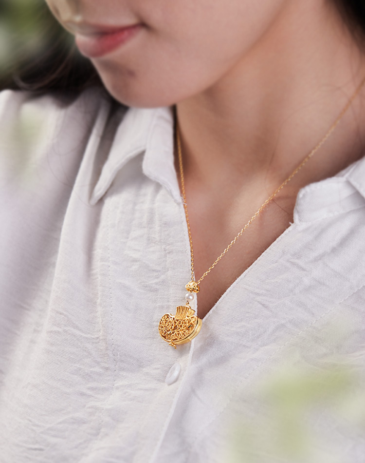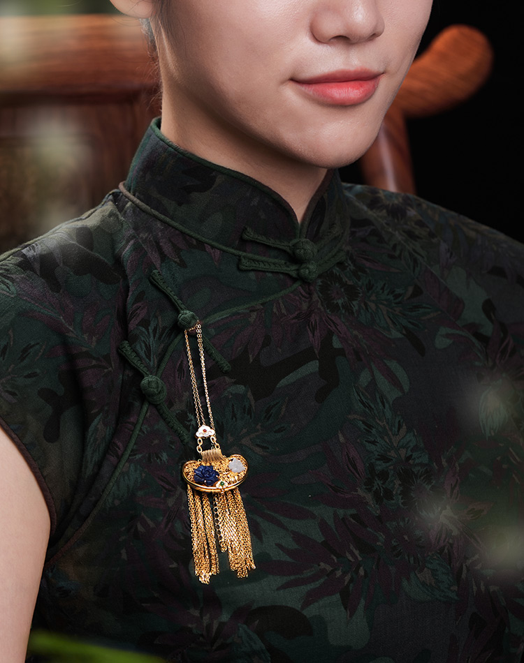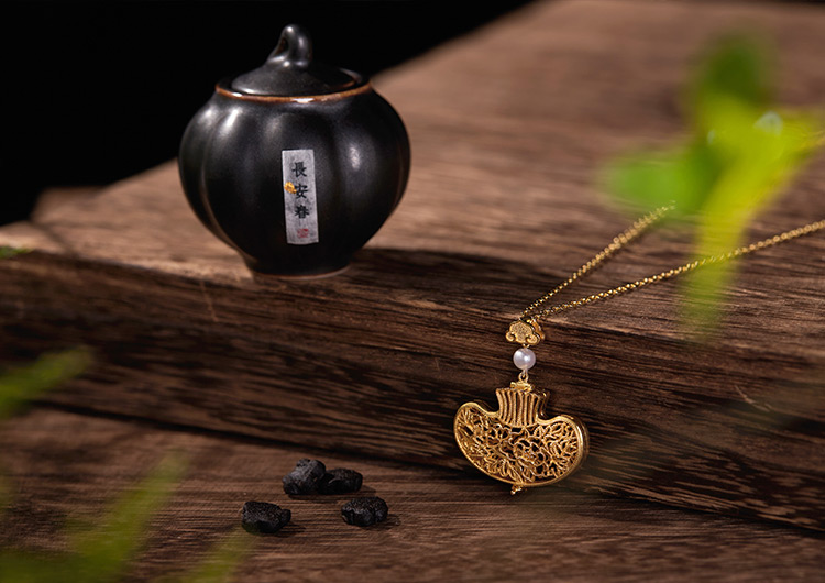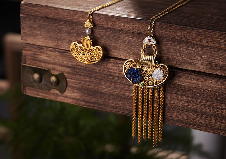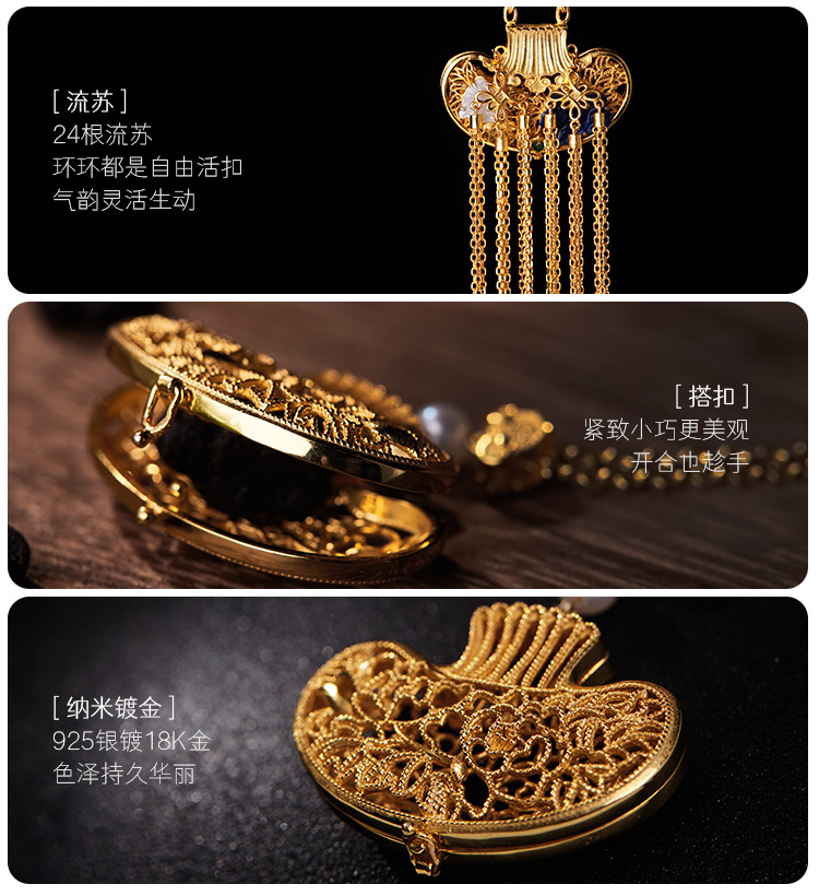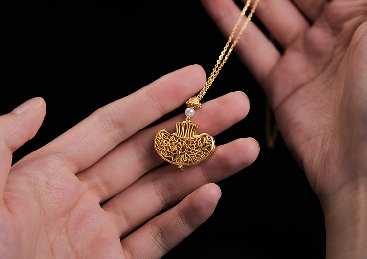 以故宫馆藏《青玉透雕福寿纹荷包式香囊》为灵感,巧用宫廷花丝镶嵌技艺,熠熠生辉,气质更加高贵。