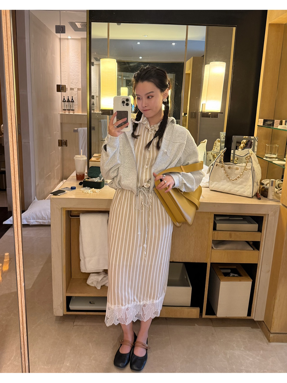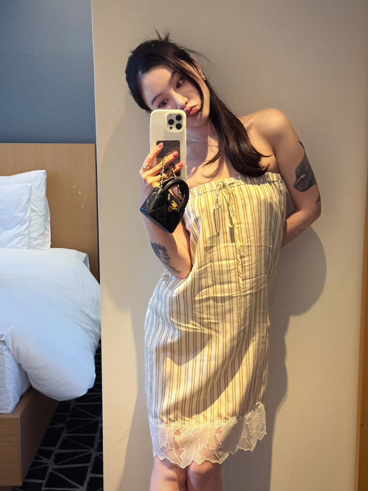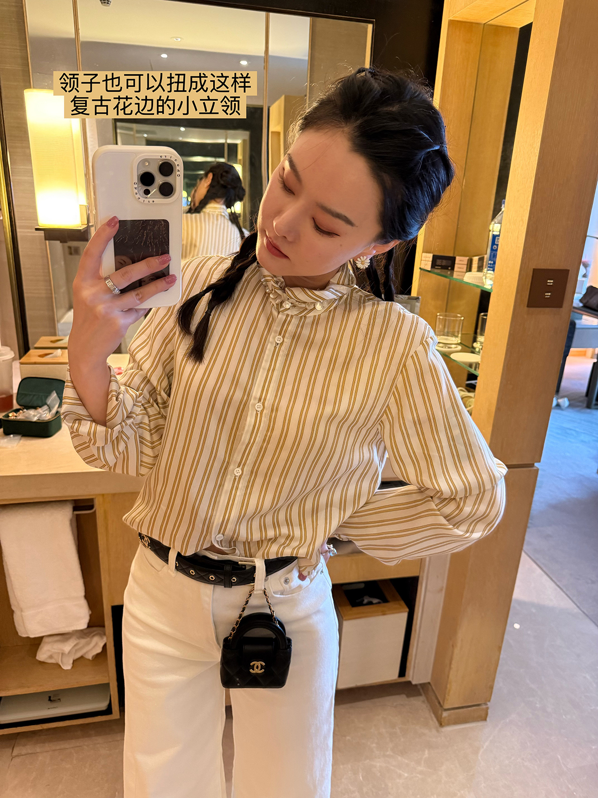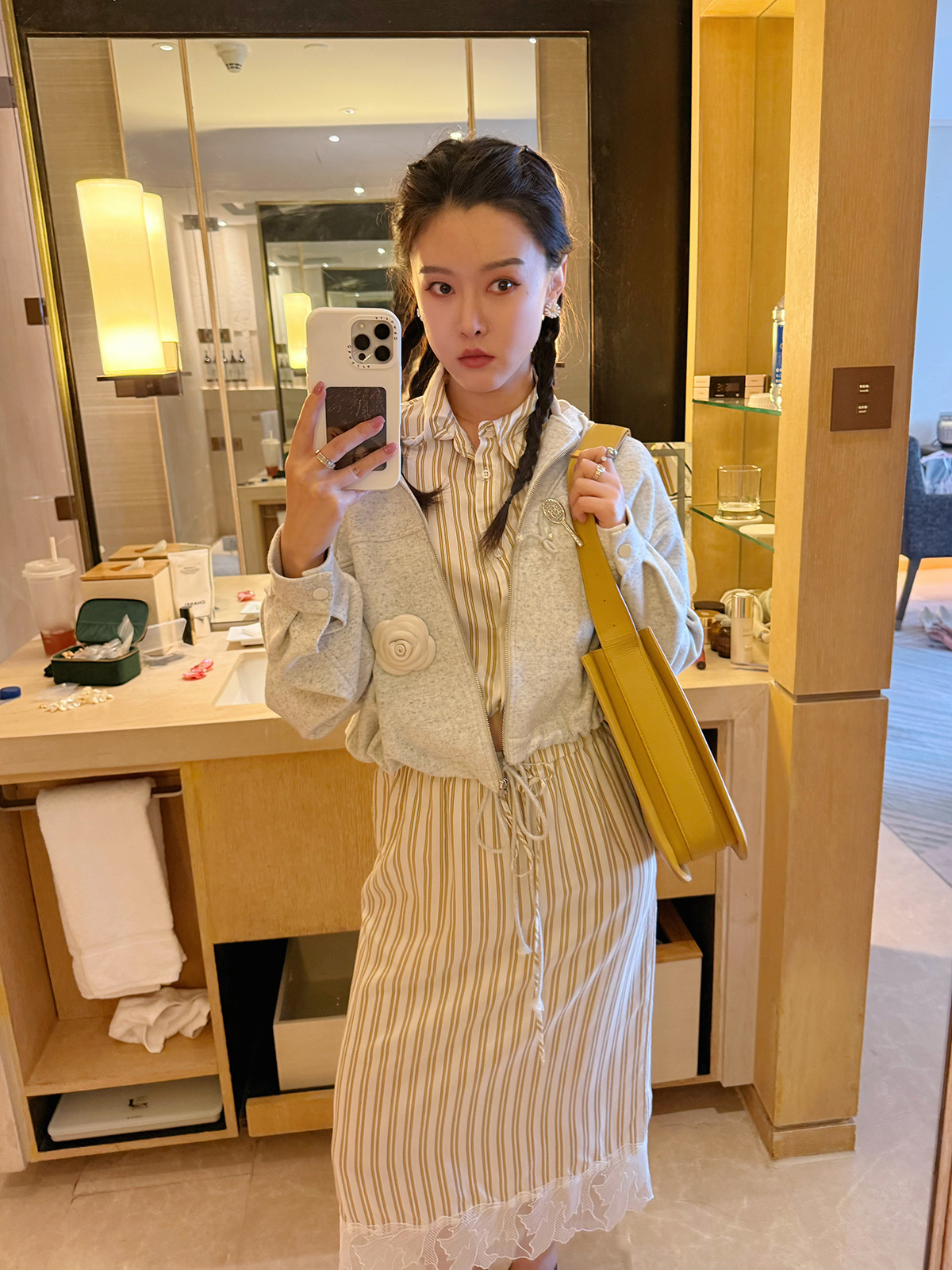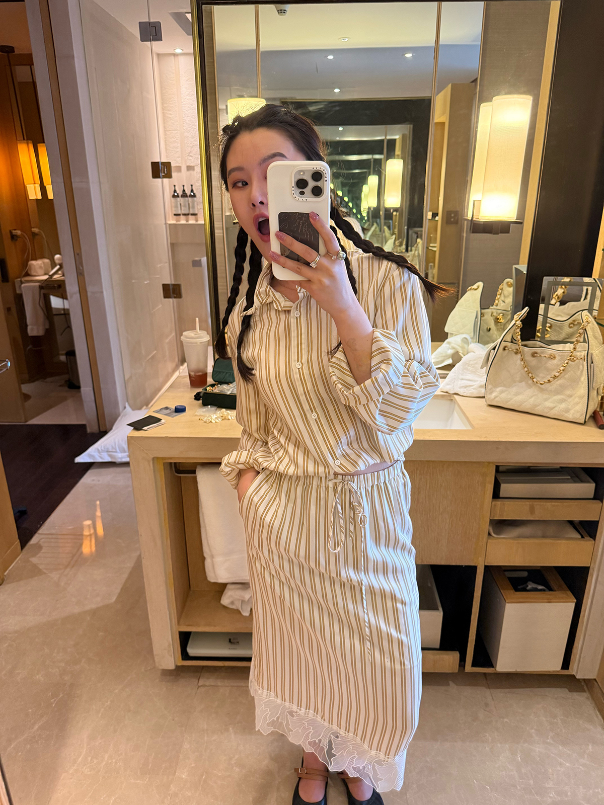 DUO智仙生 黑标 智性恋黄色条纹明媚丝质衬衫和花边蕾丝裙套装