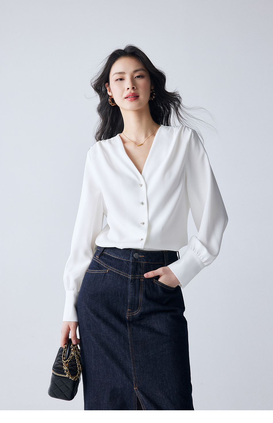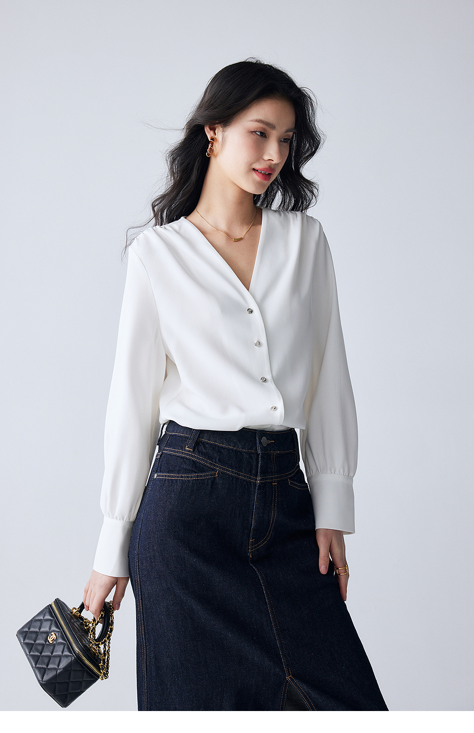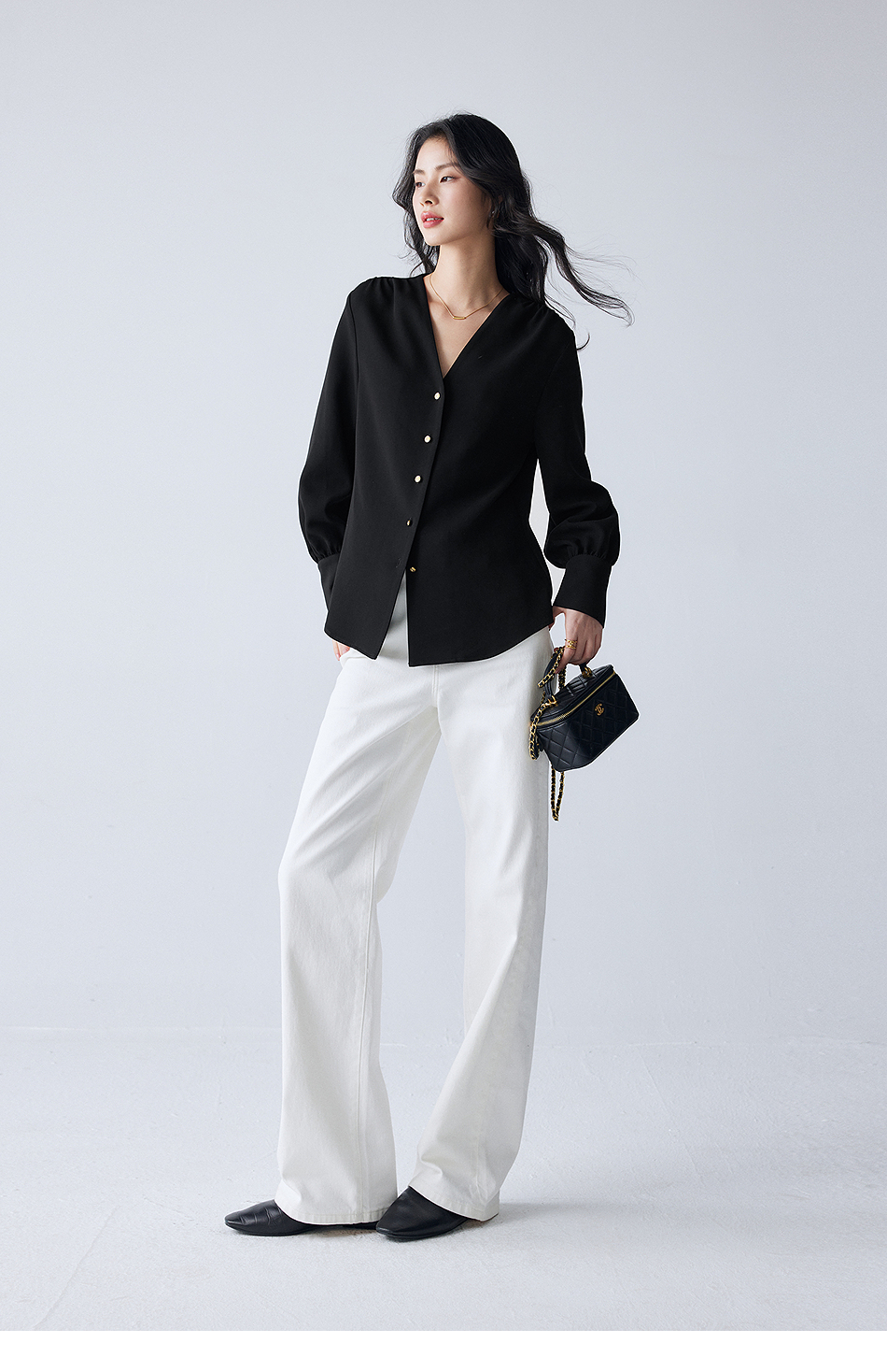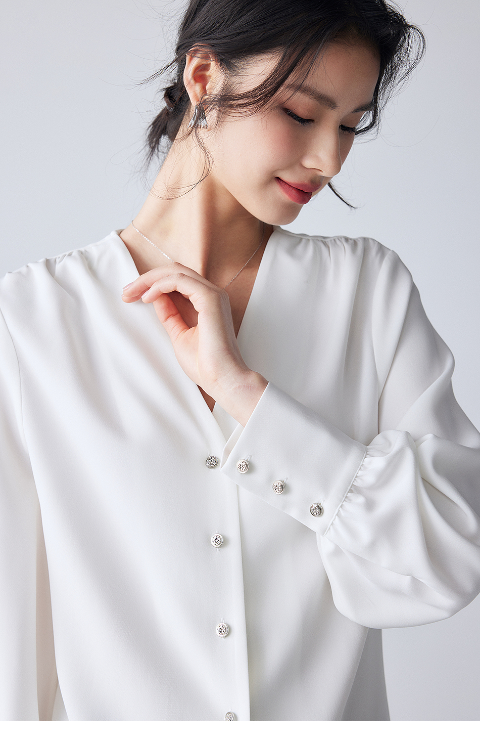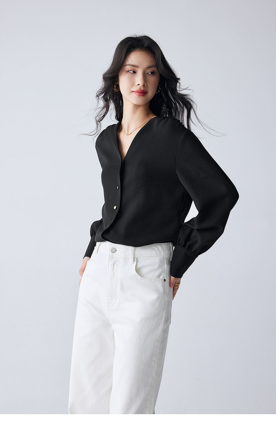 棉仓352604004伯爵领肩部贝壳褶醋酸衬衫女设计感春秋气质宽松灯笼袖衬衣