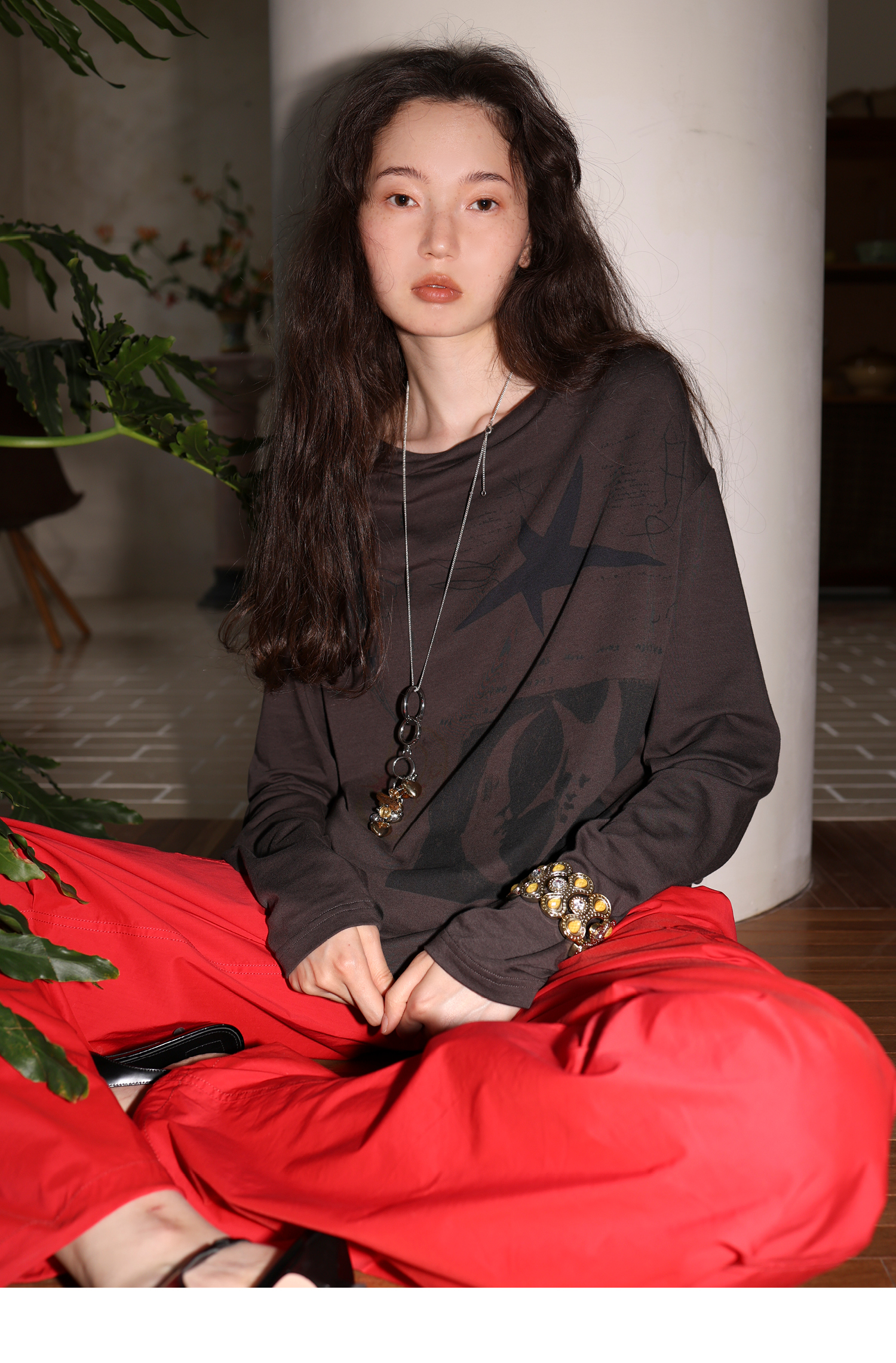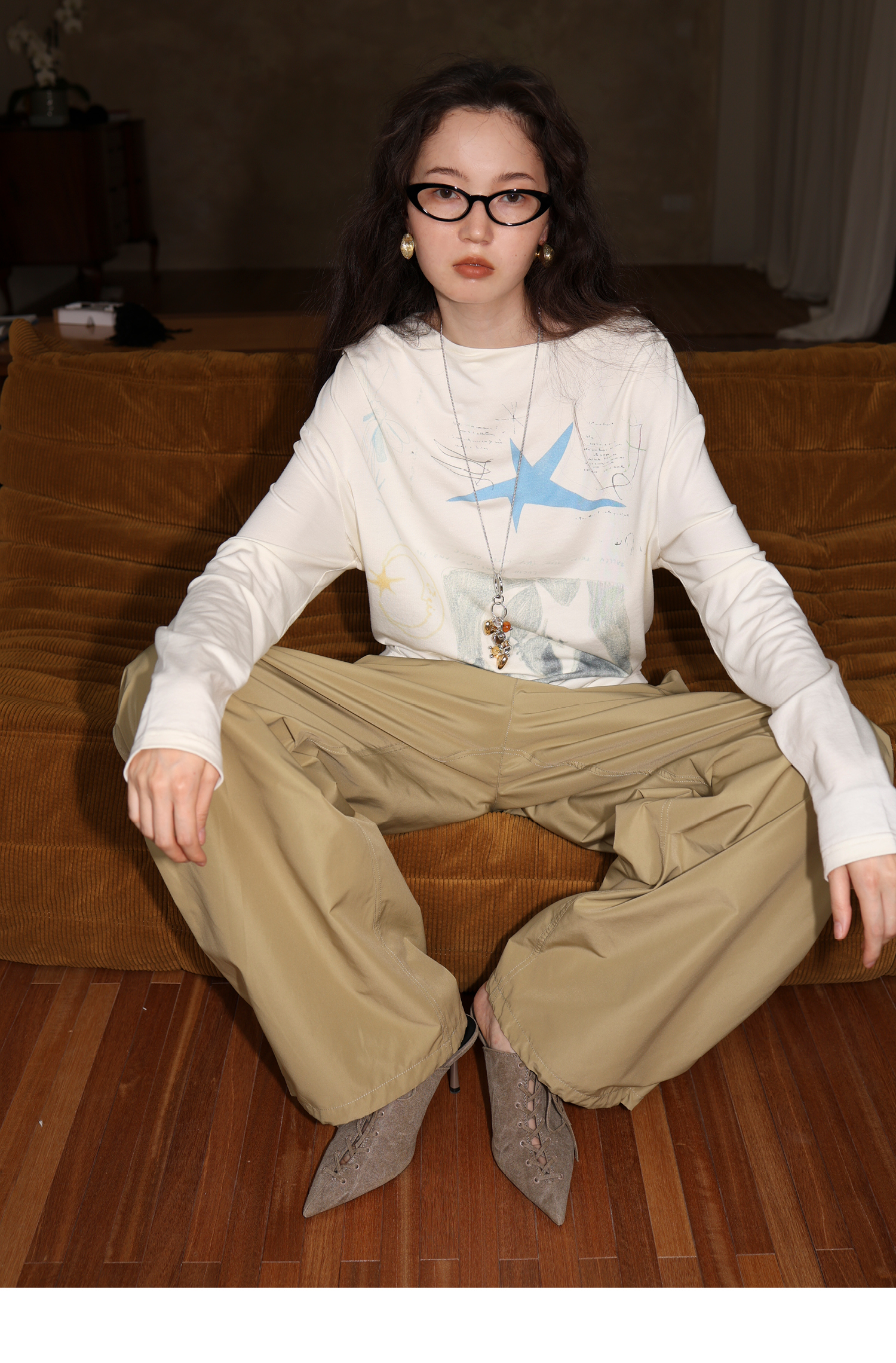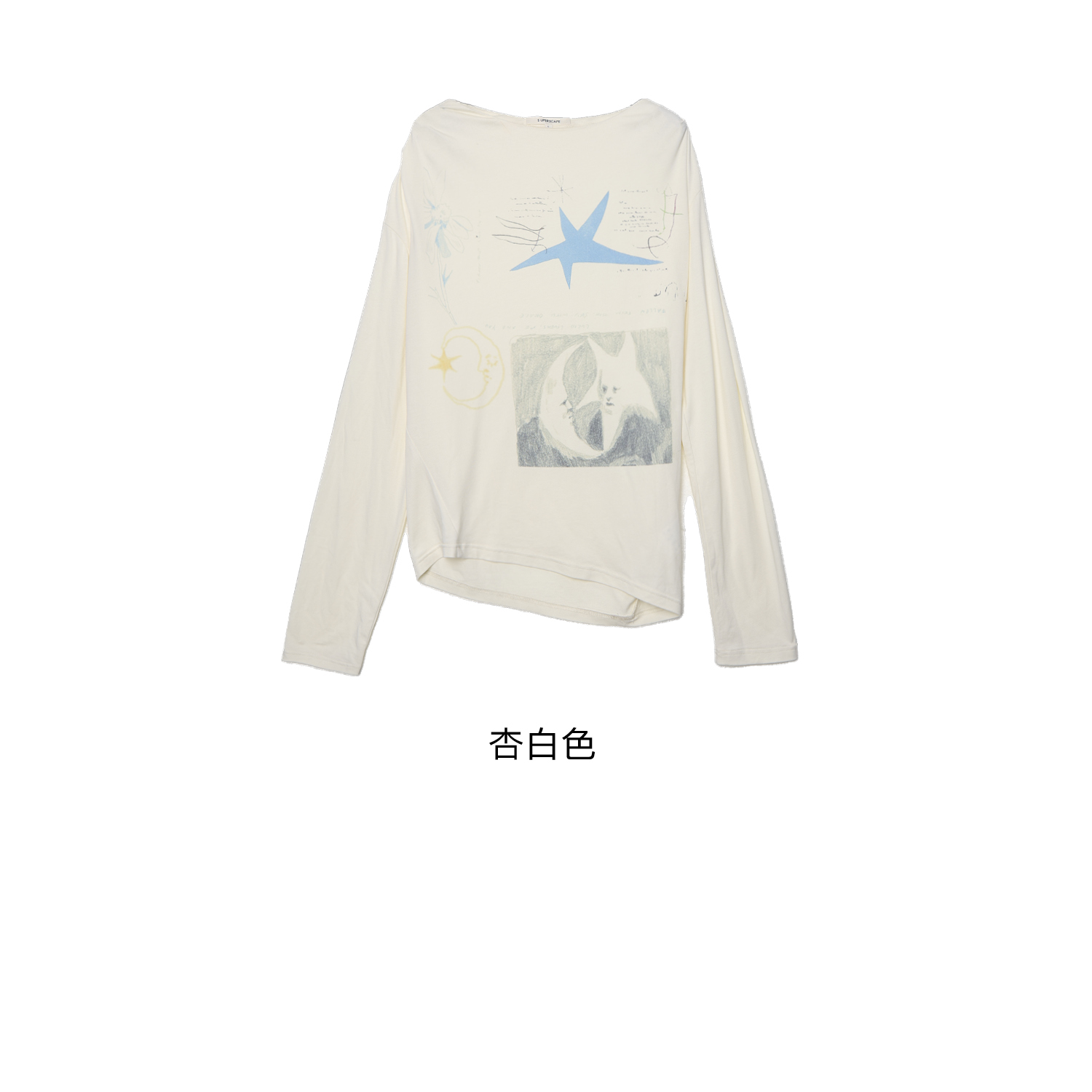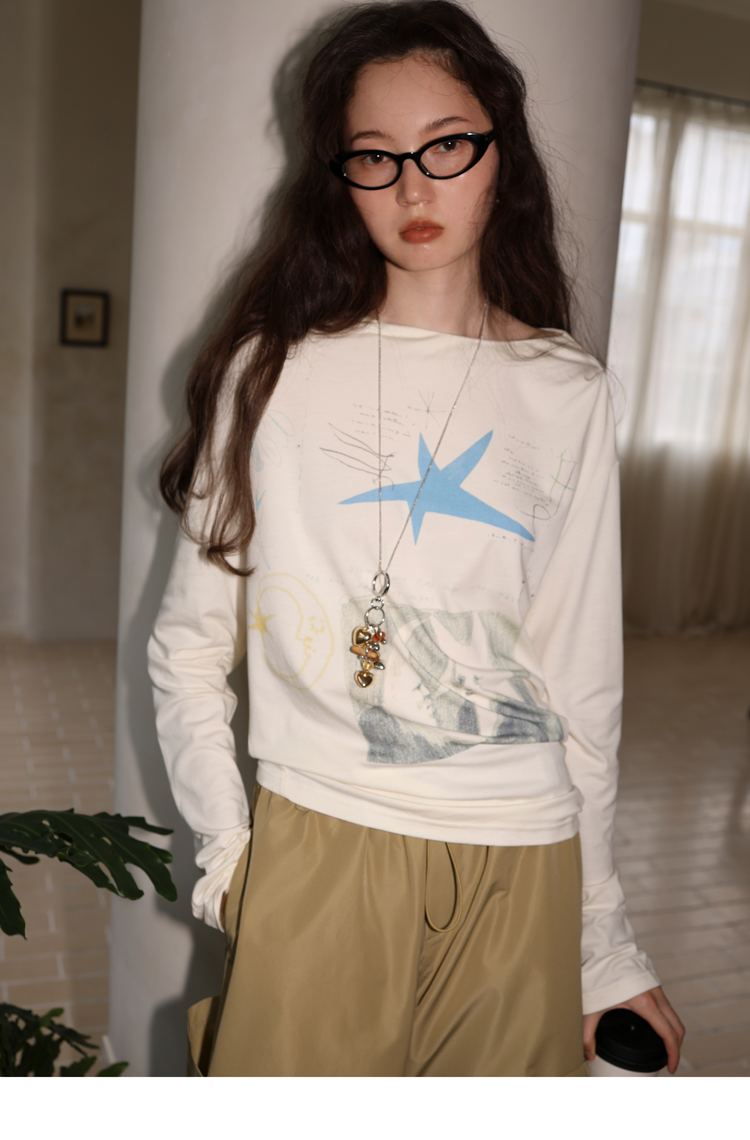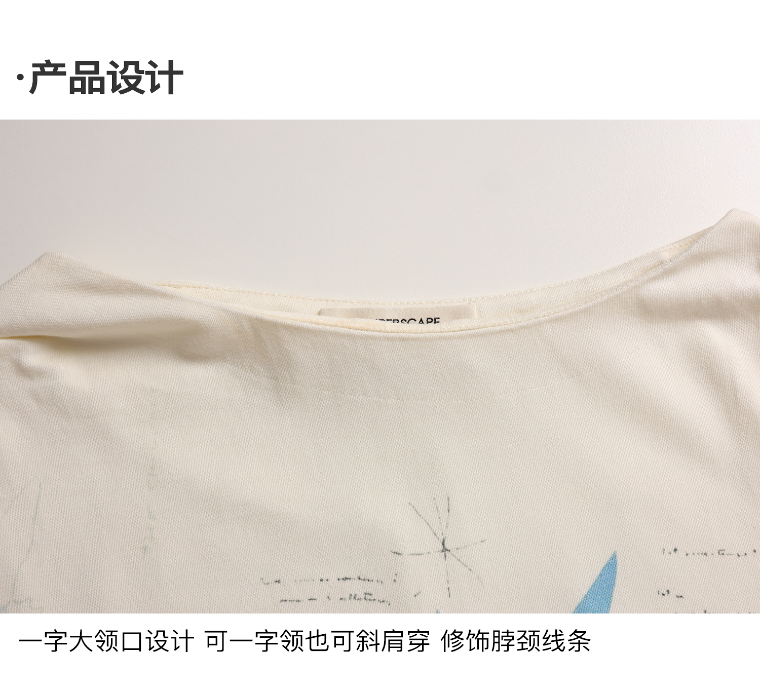 素舶 柔软精梳棉EcoCosy亲肤斜肩褶皱堆褶星辰手绘印花长袖T恤