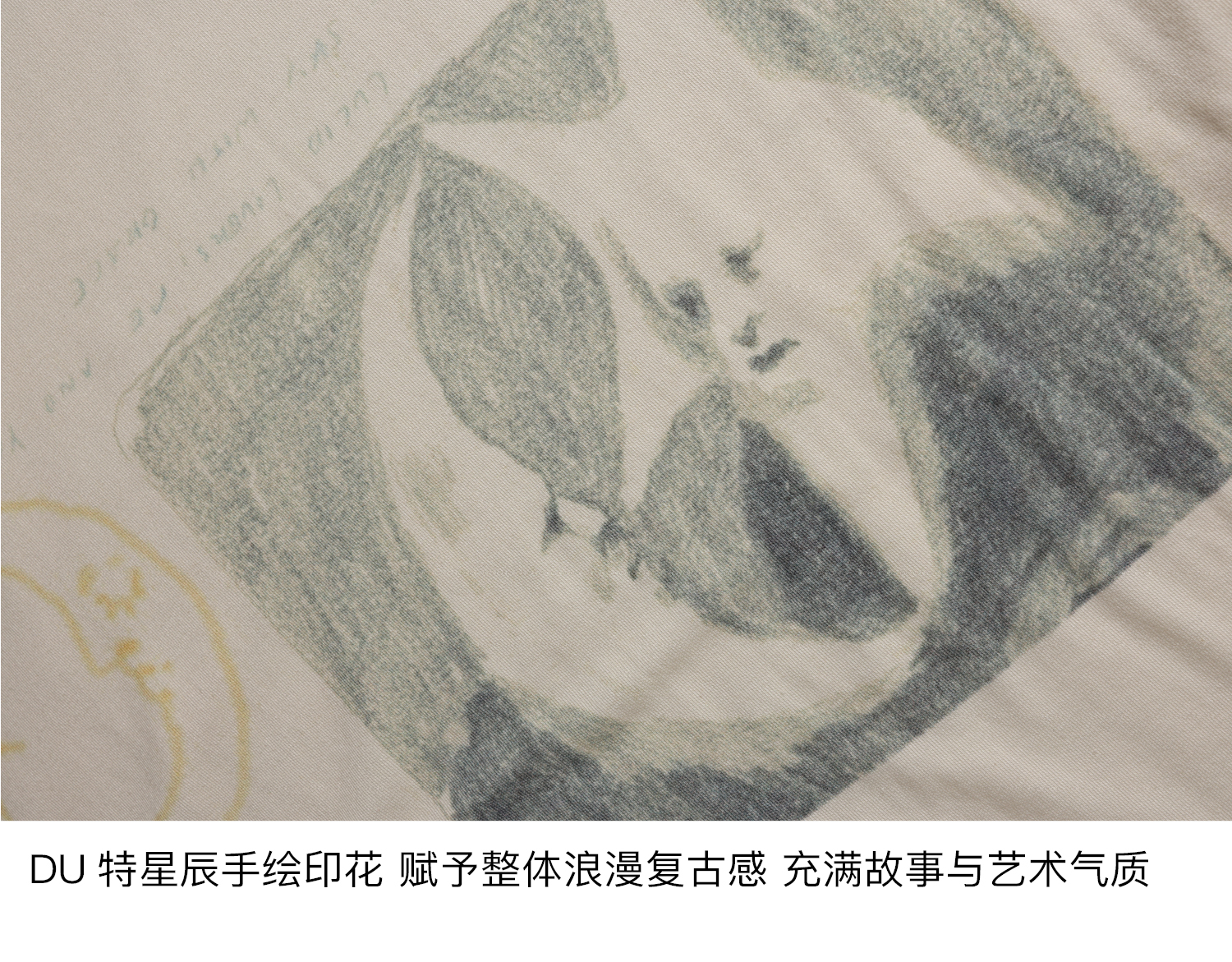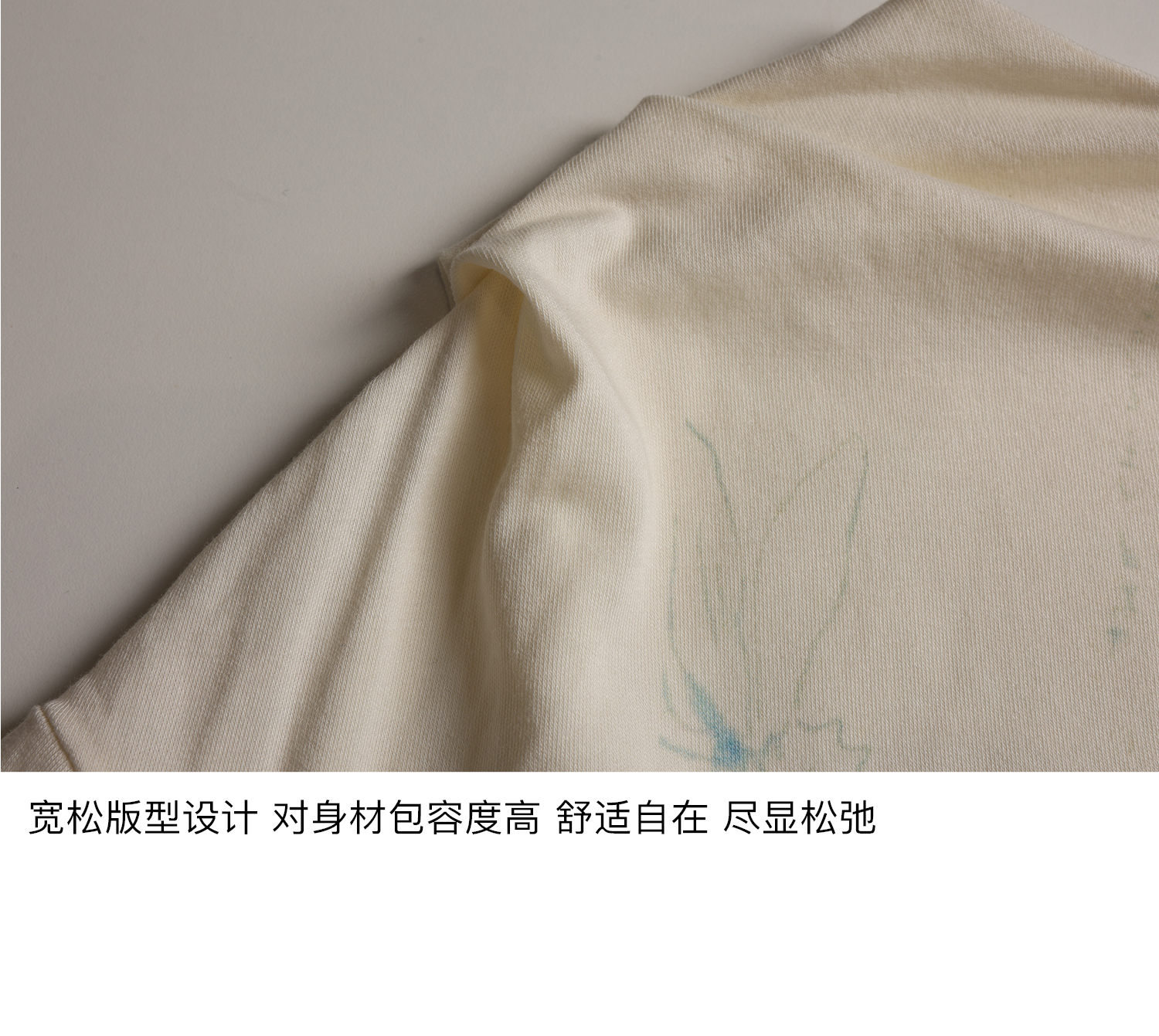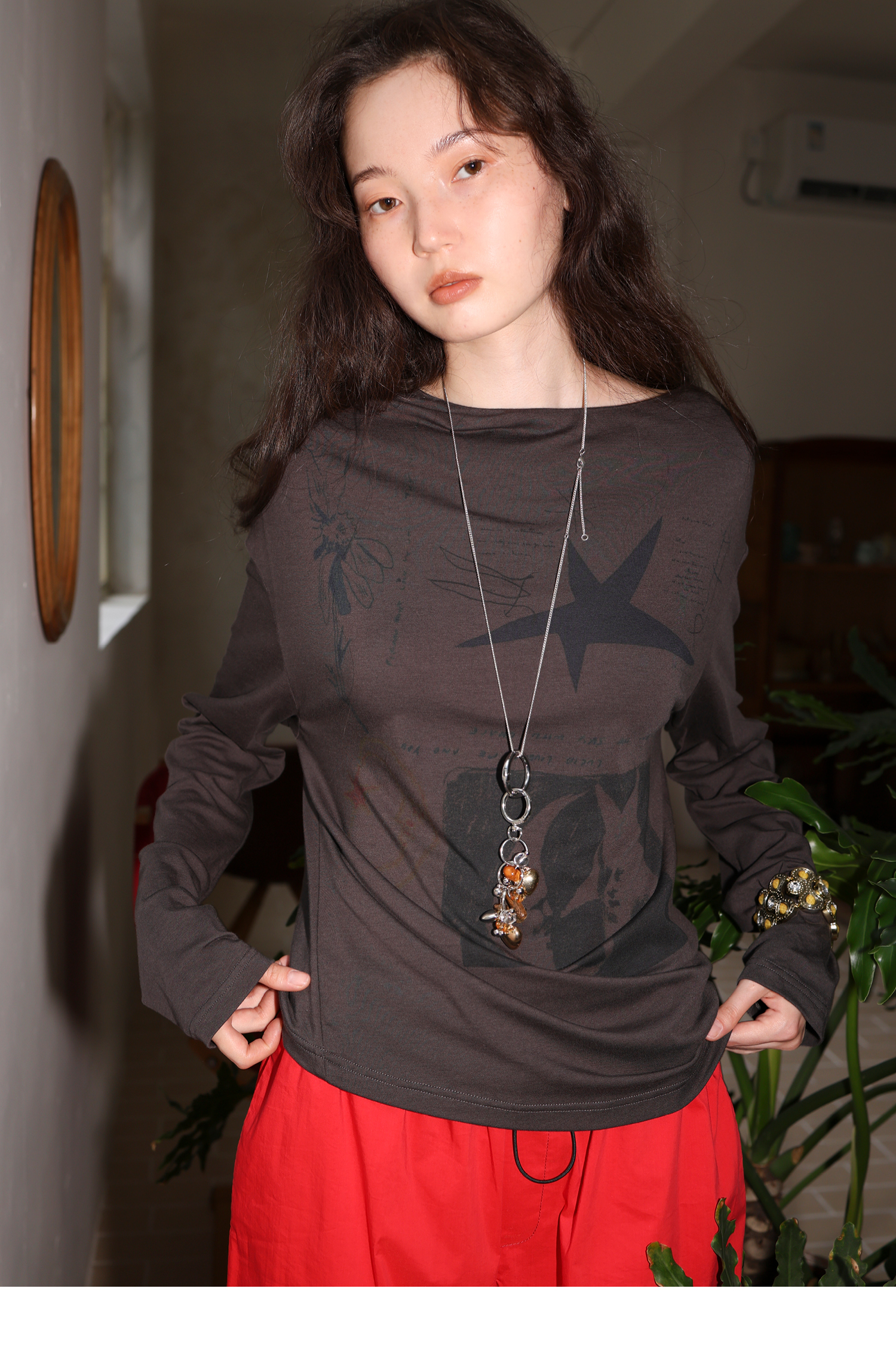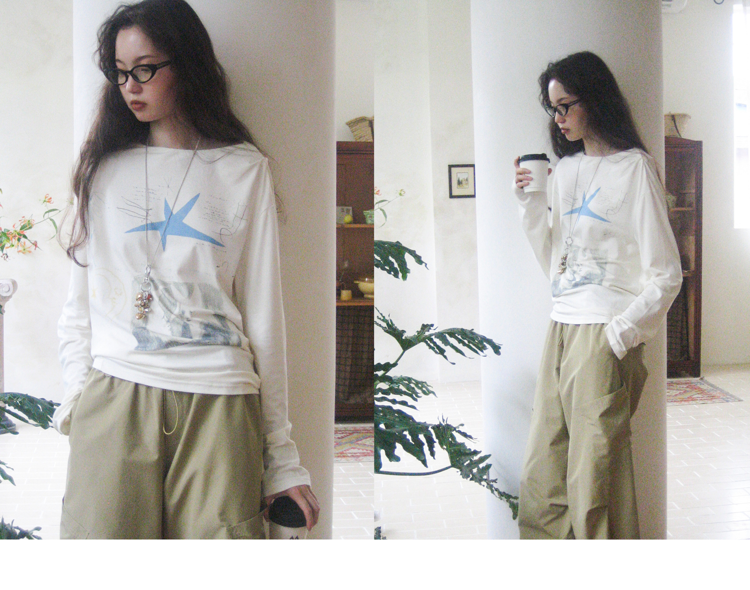素舶 柔软精梳棉EcoCosy亲肤斜肩褶皱堆褶星辰手绘印花长袖T恤