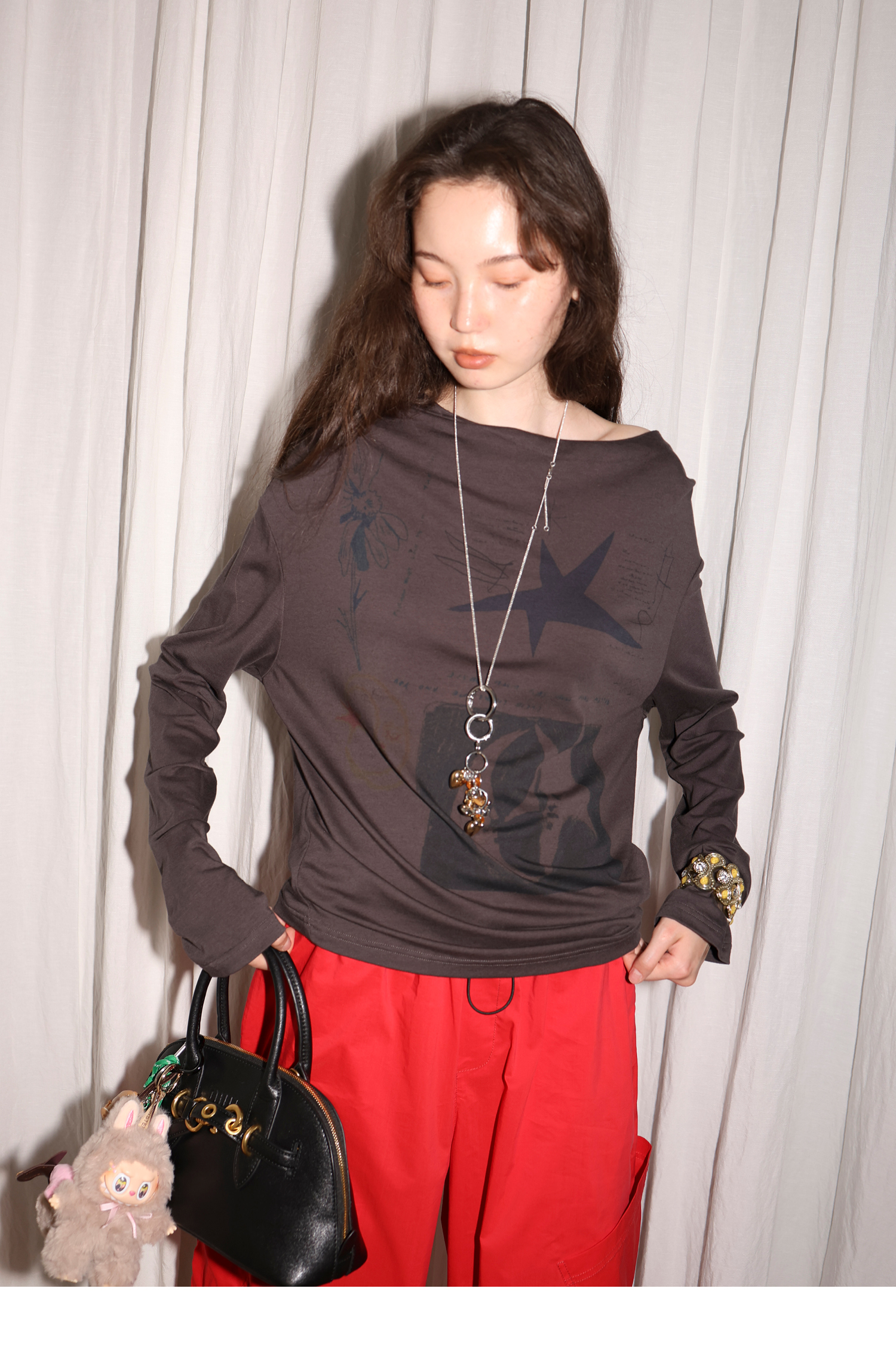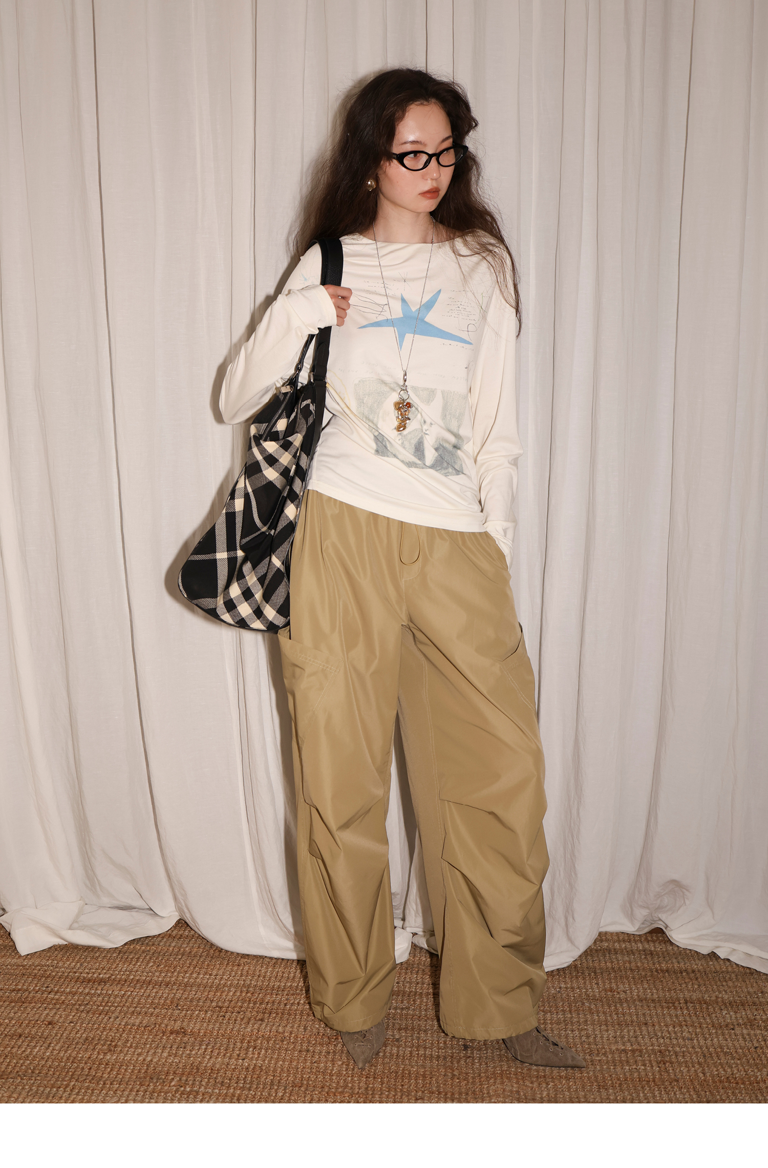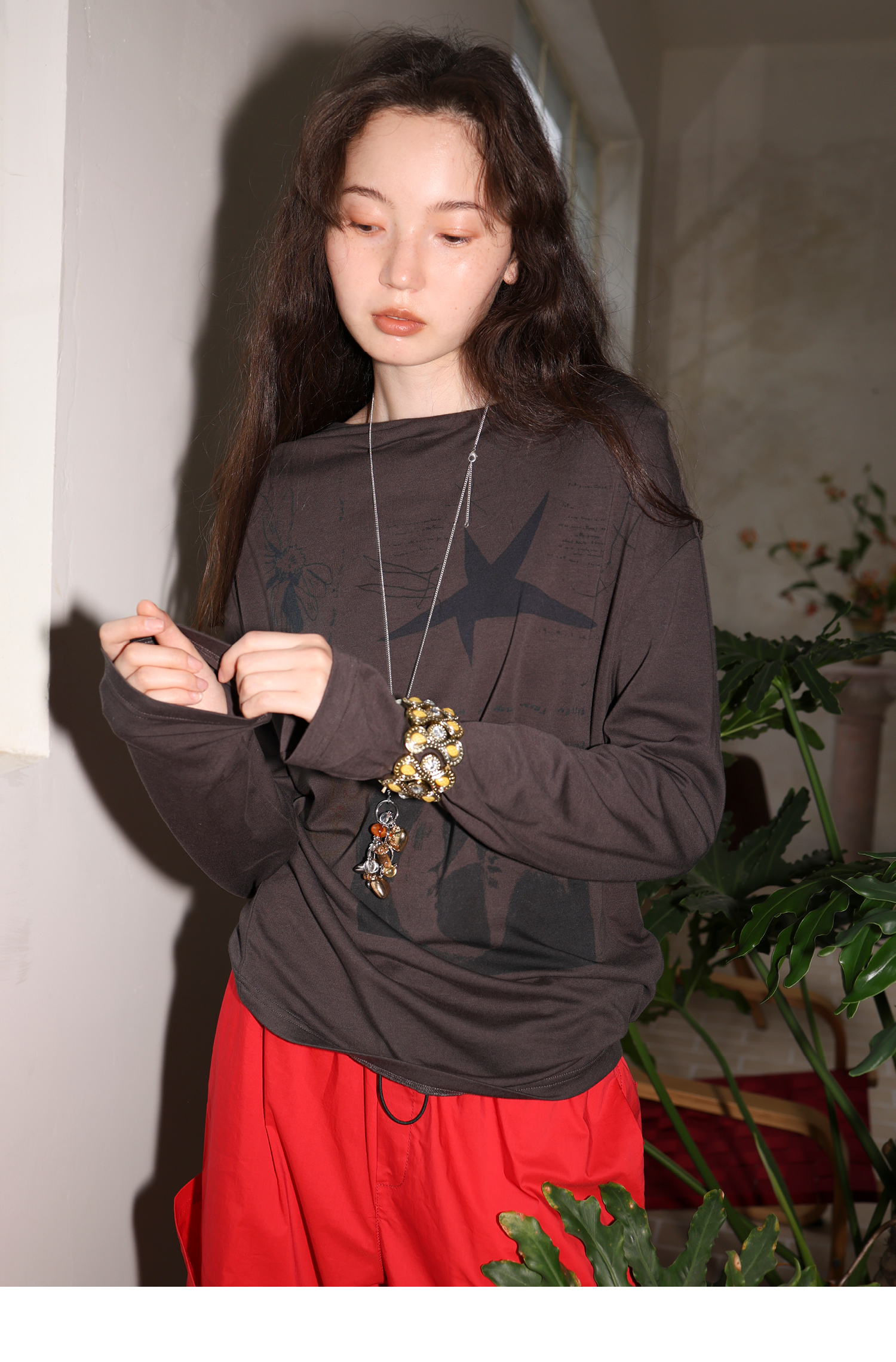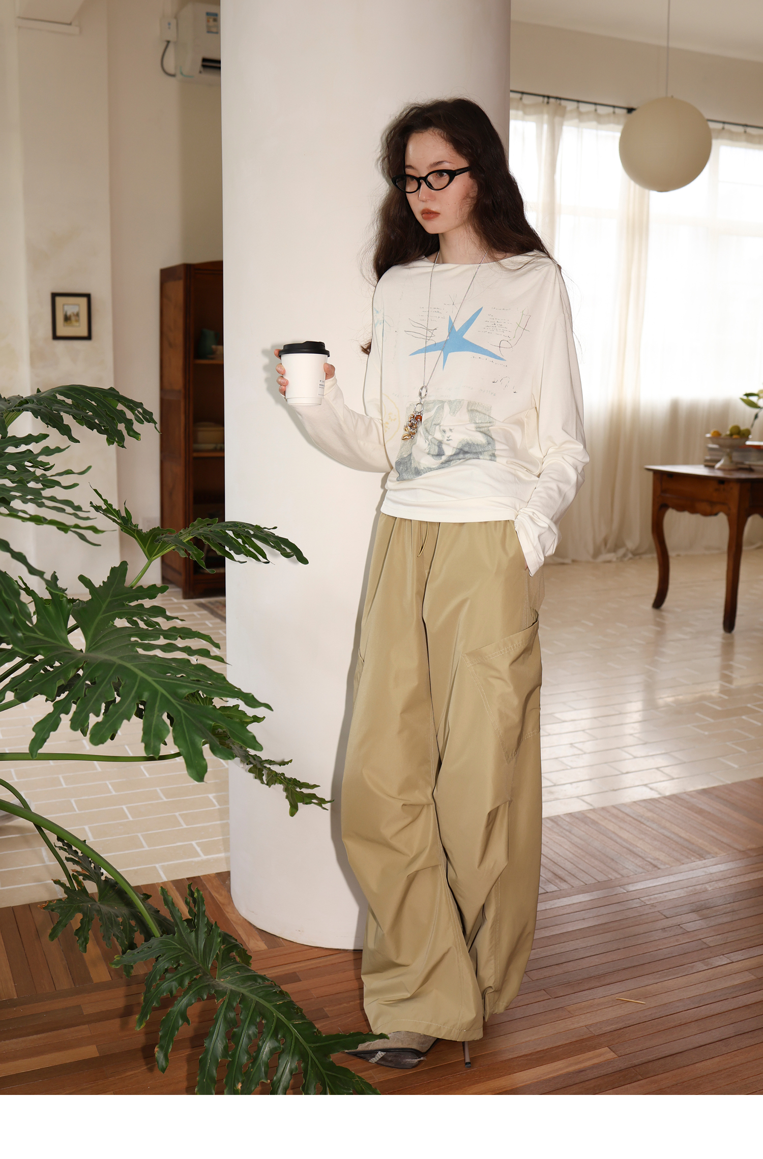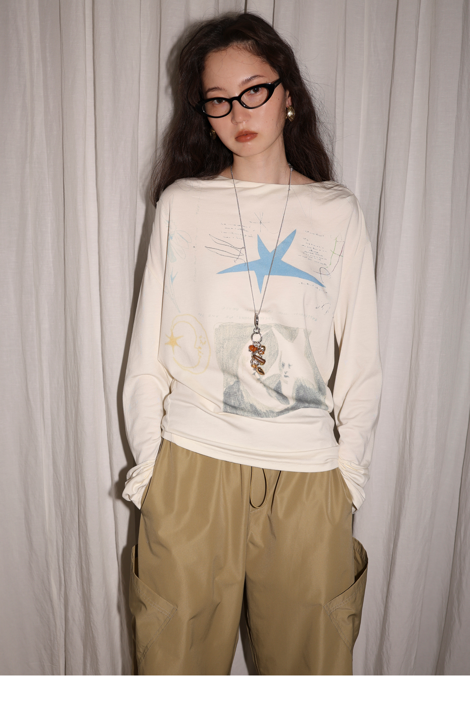素舶 柔软精梳棉EcoCosy亲肤斜肩褶皱堆褶星辰手绘印花长袖T恤