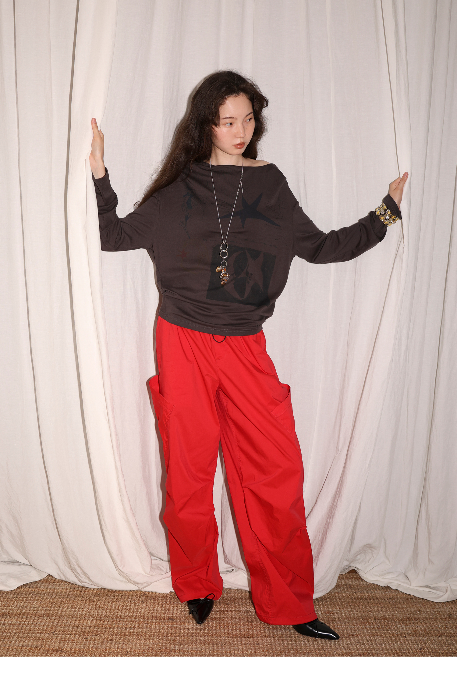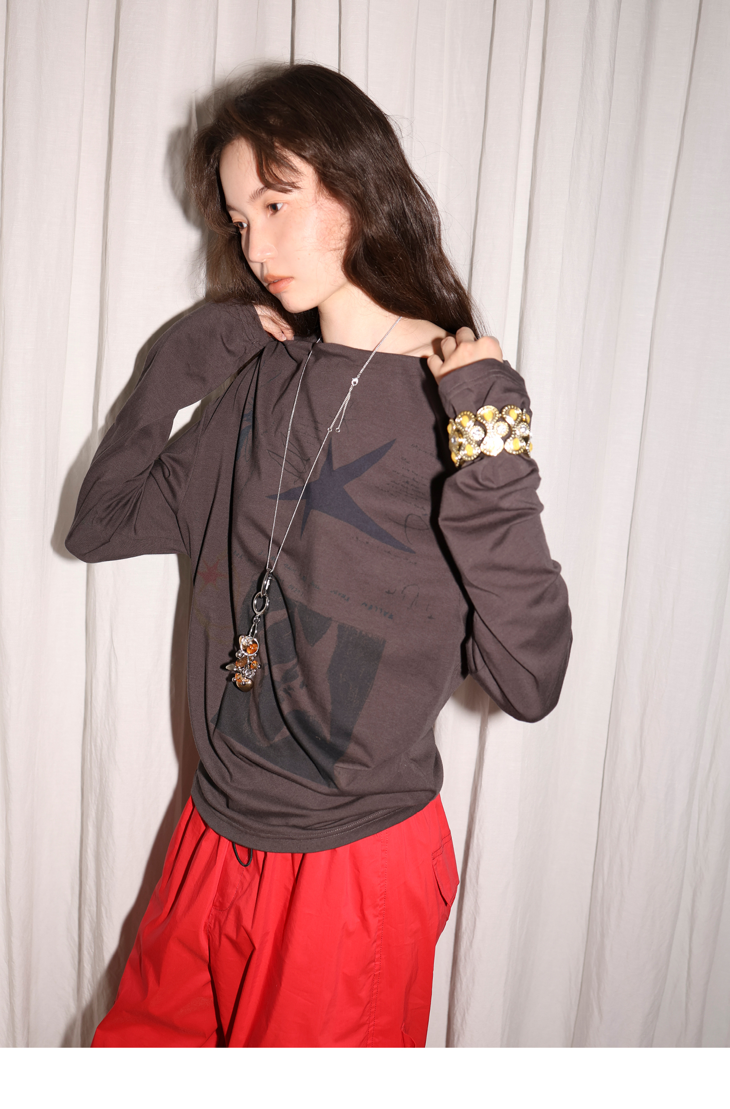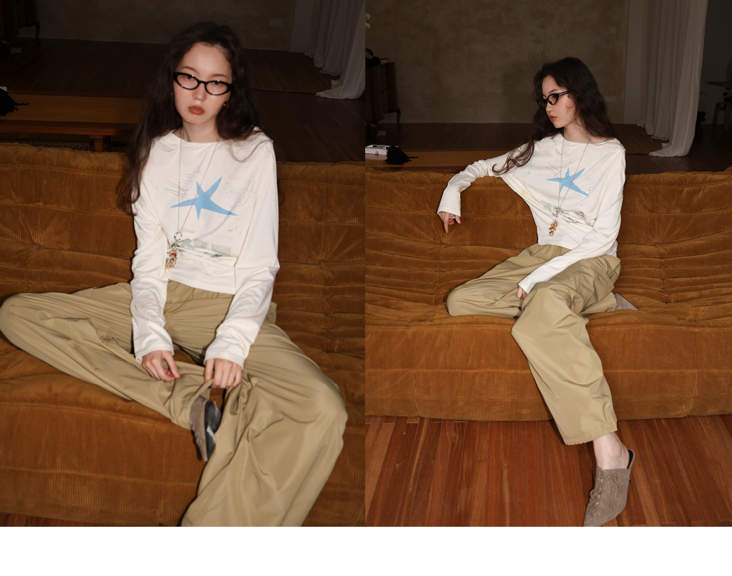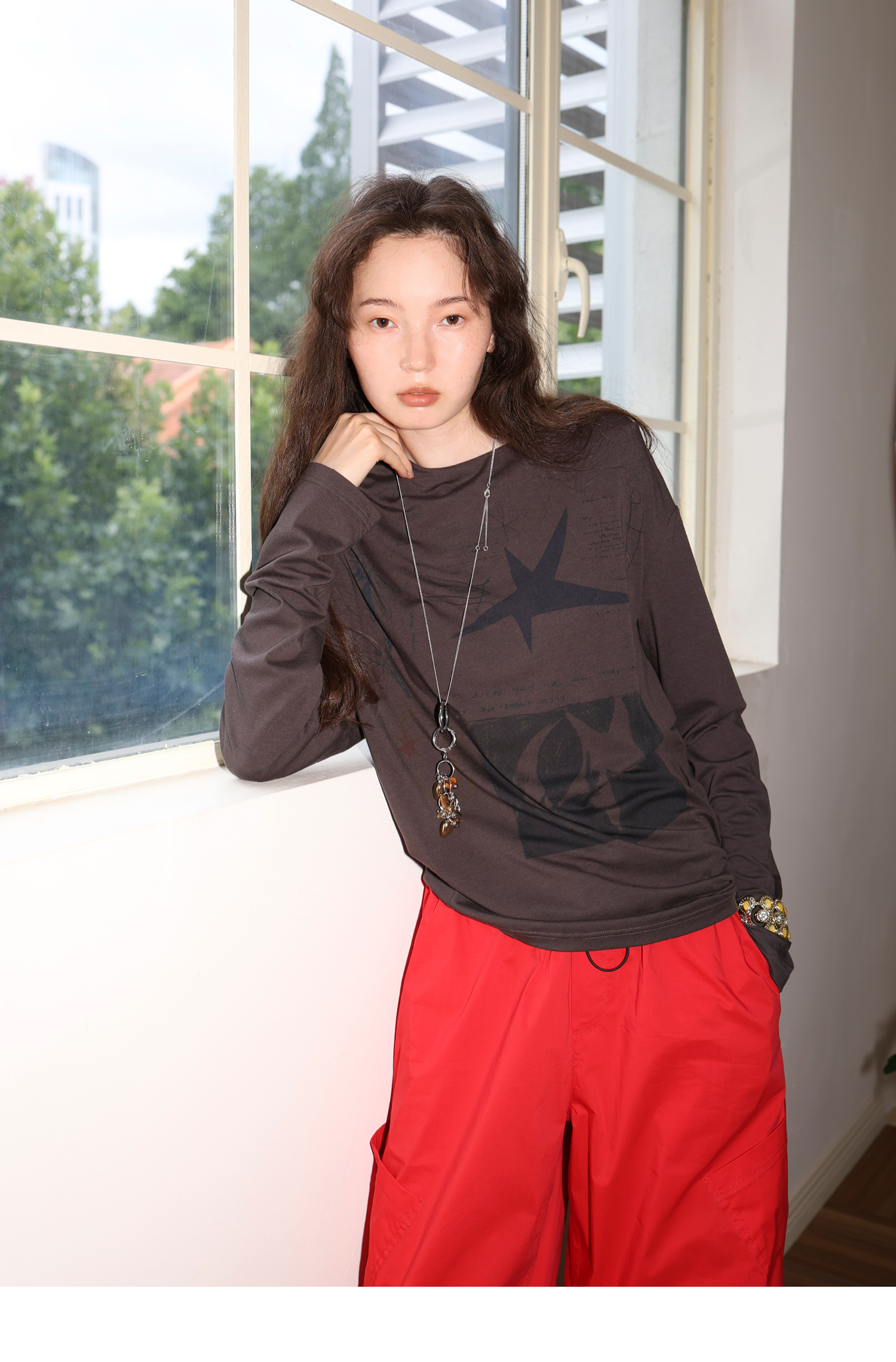 素舶 柔软精梳棉EcoCosy亲肤斜肩褶皱堆褶星辰手绘印花长袖T恤